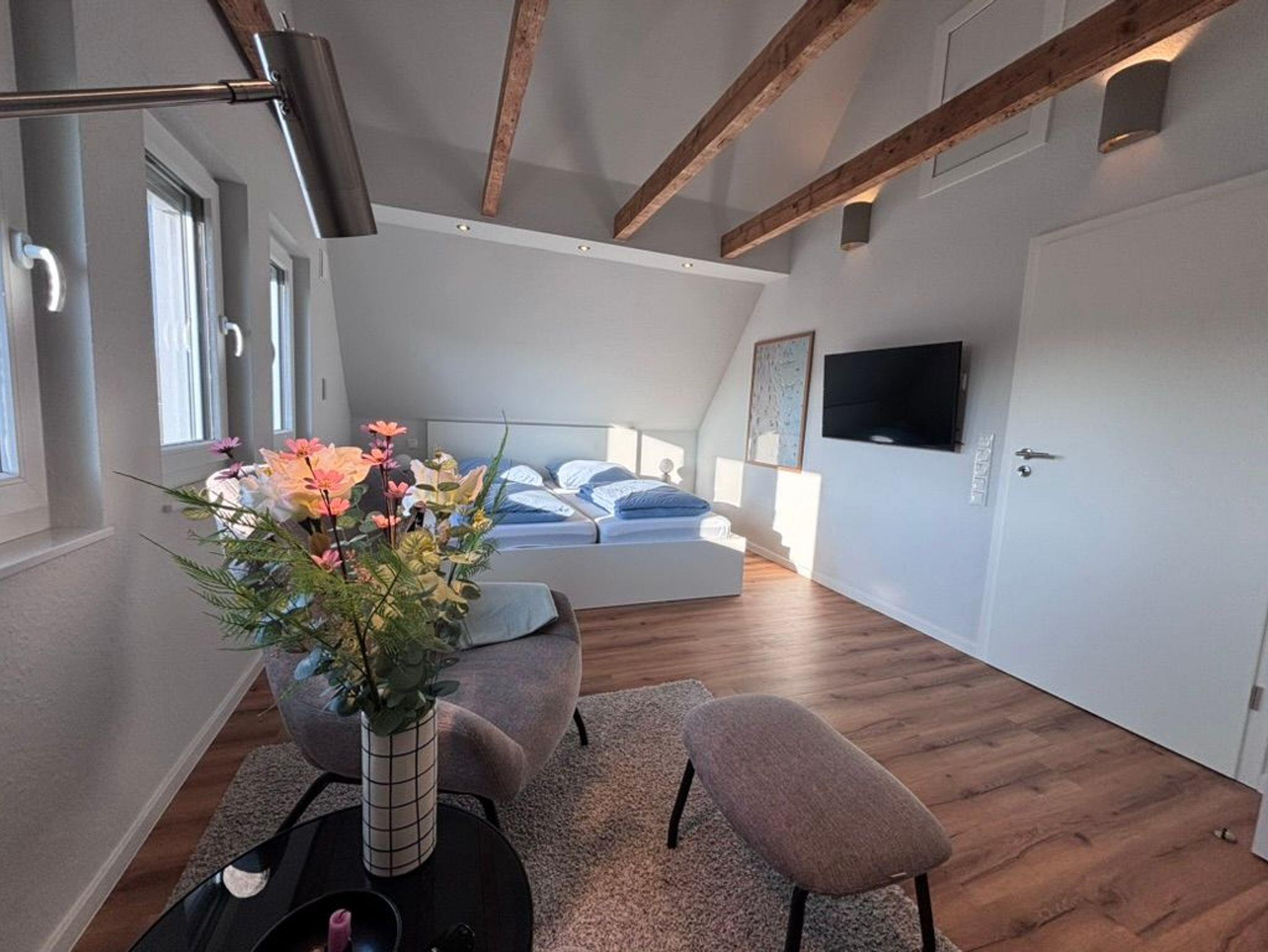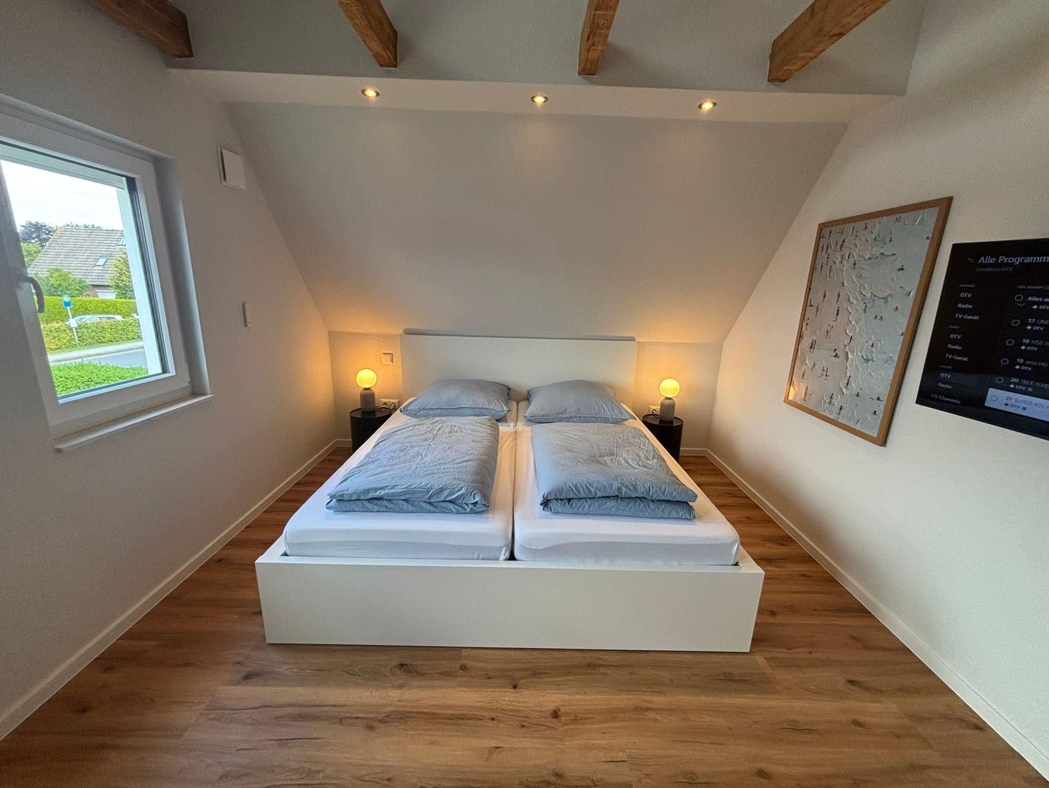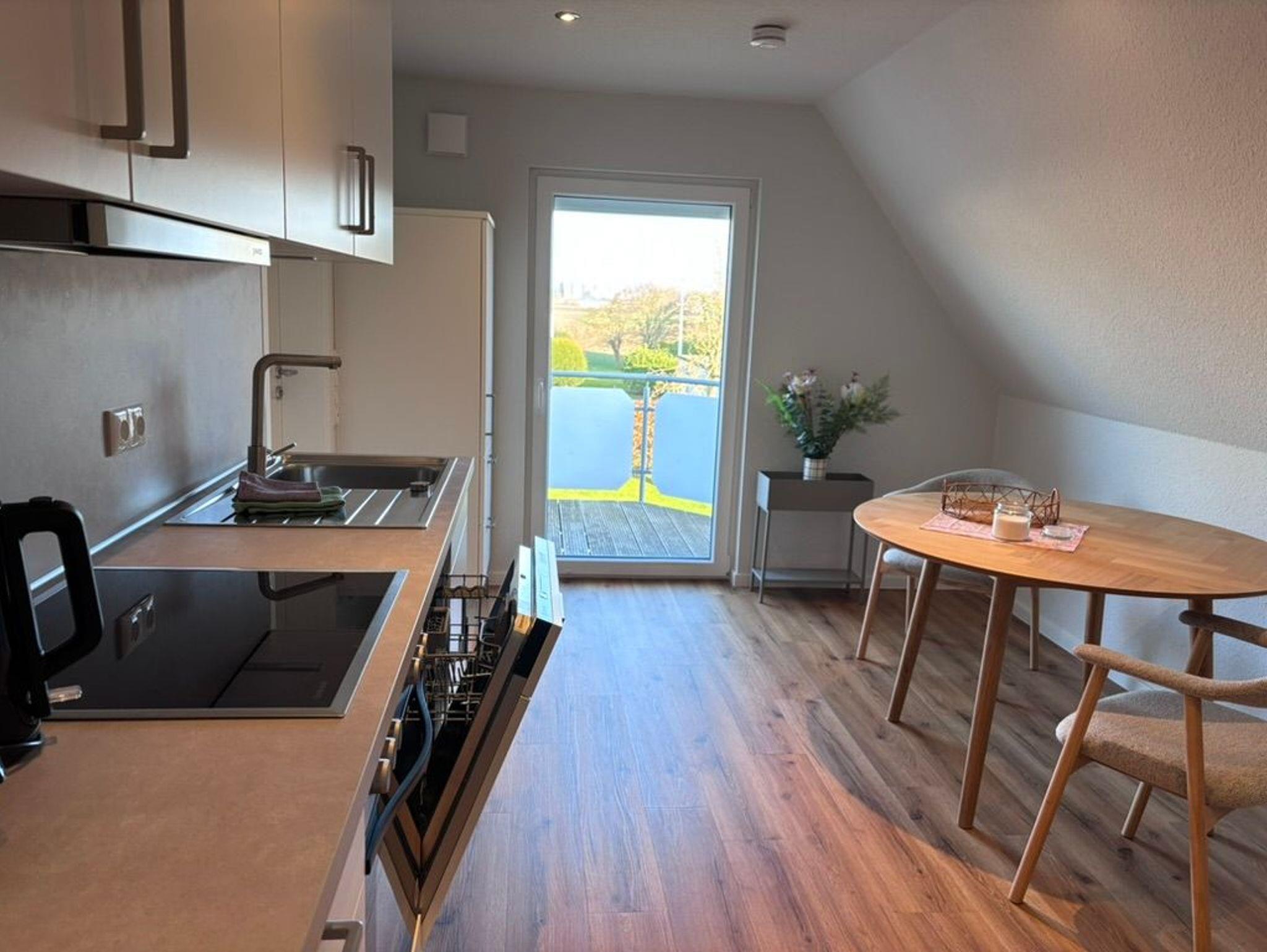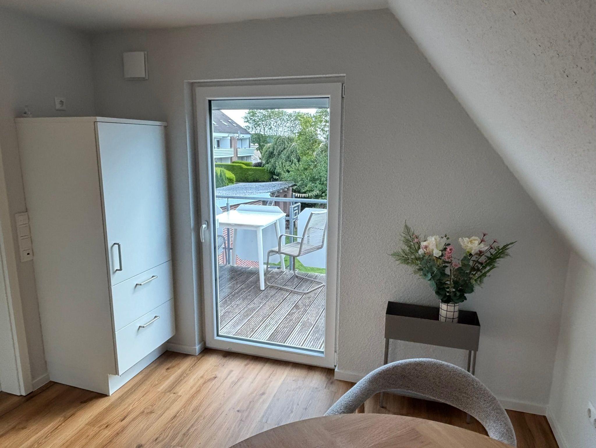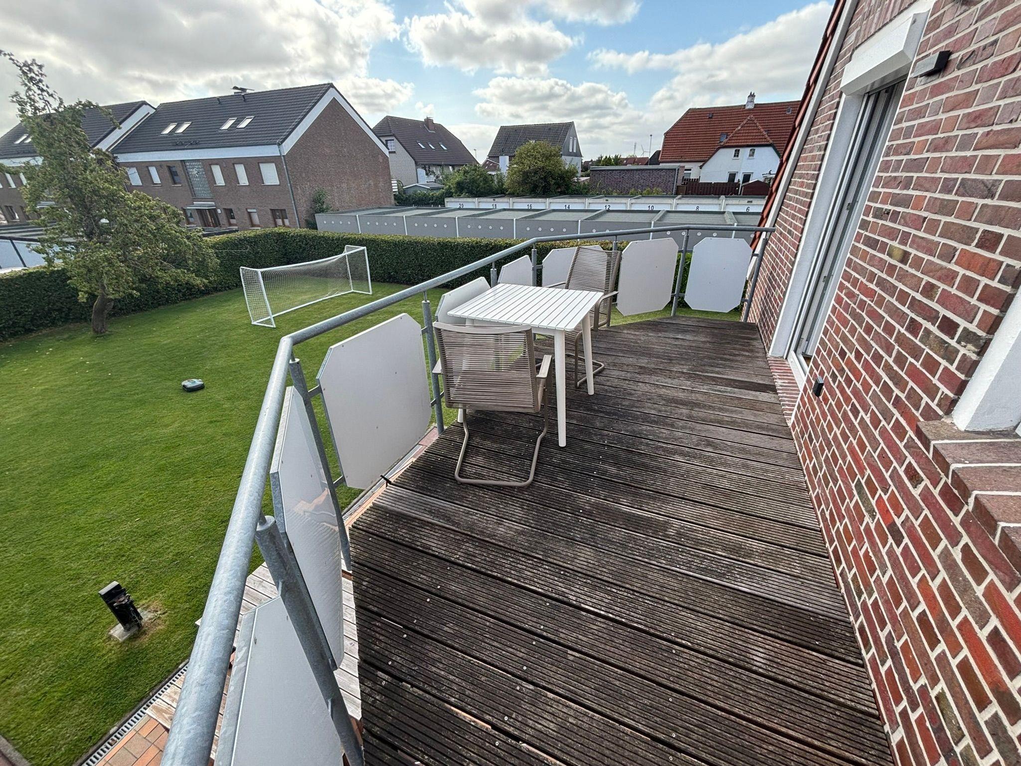 Diese hochwertig ausgestattete Wohnung mit Balkon in Ostlage befindet sich im OG des Ferienhauses Nordic. Der Gemeinschaftsgarten darf z.B. zum Grillen gerne genutzt werden. Die Terrasse gehört zur EG-Wohnung.