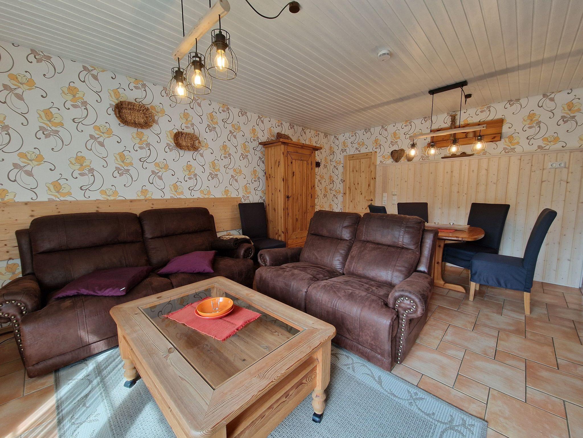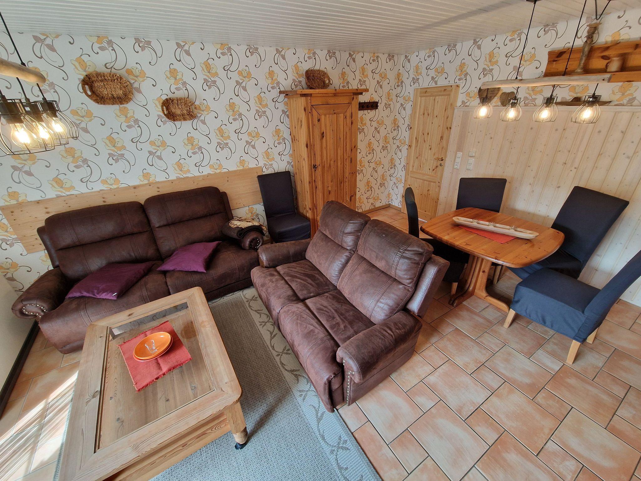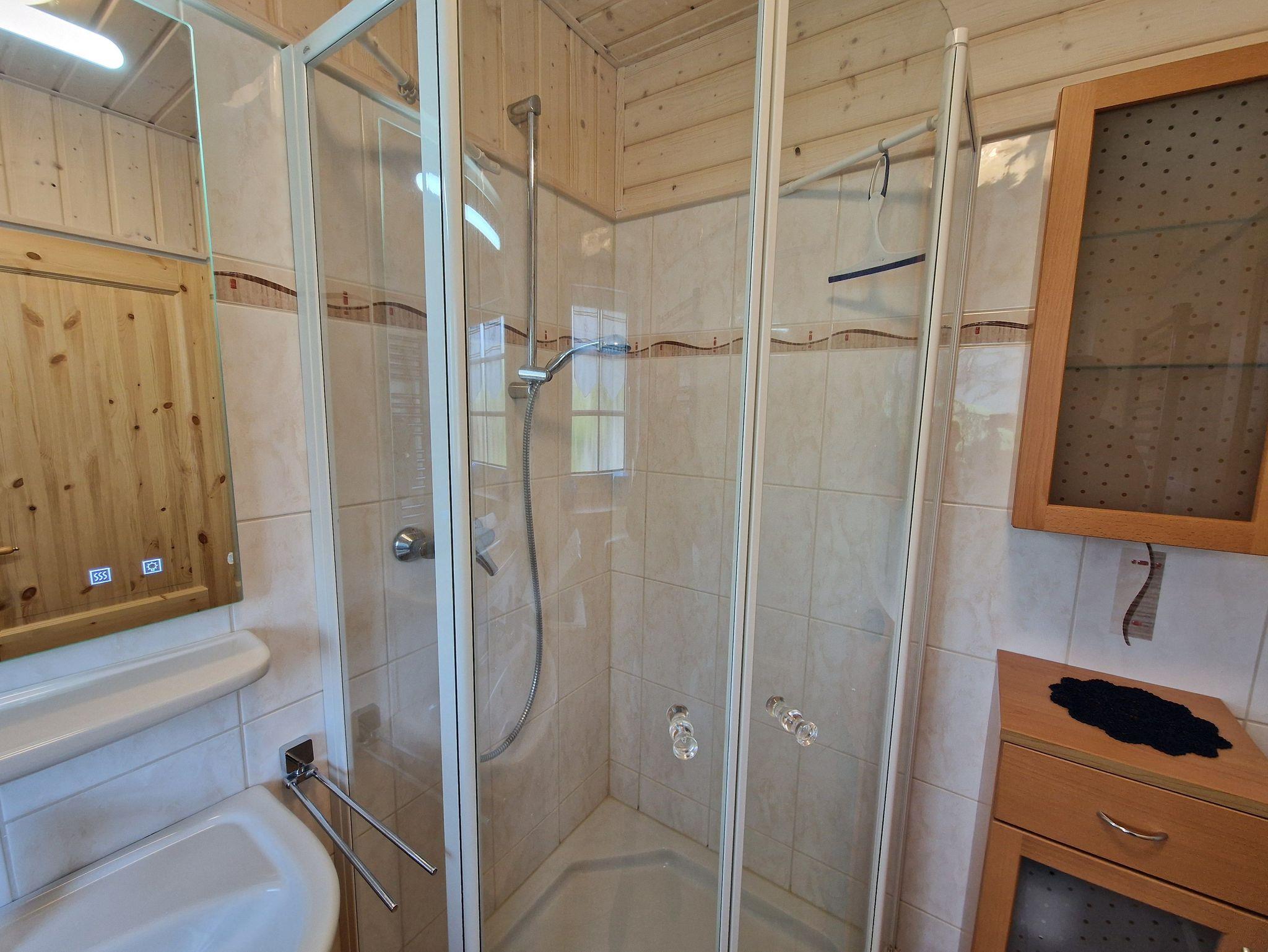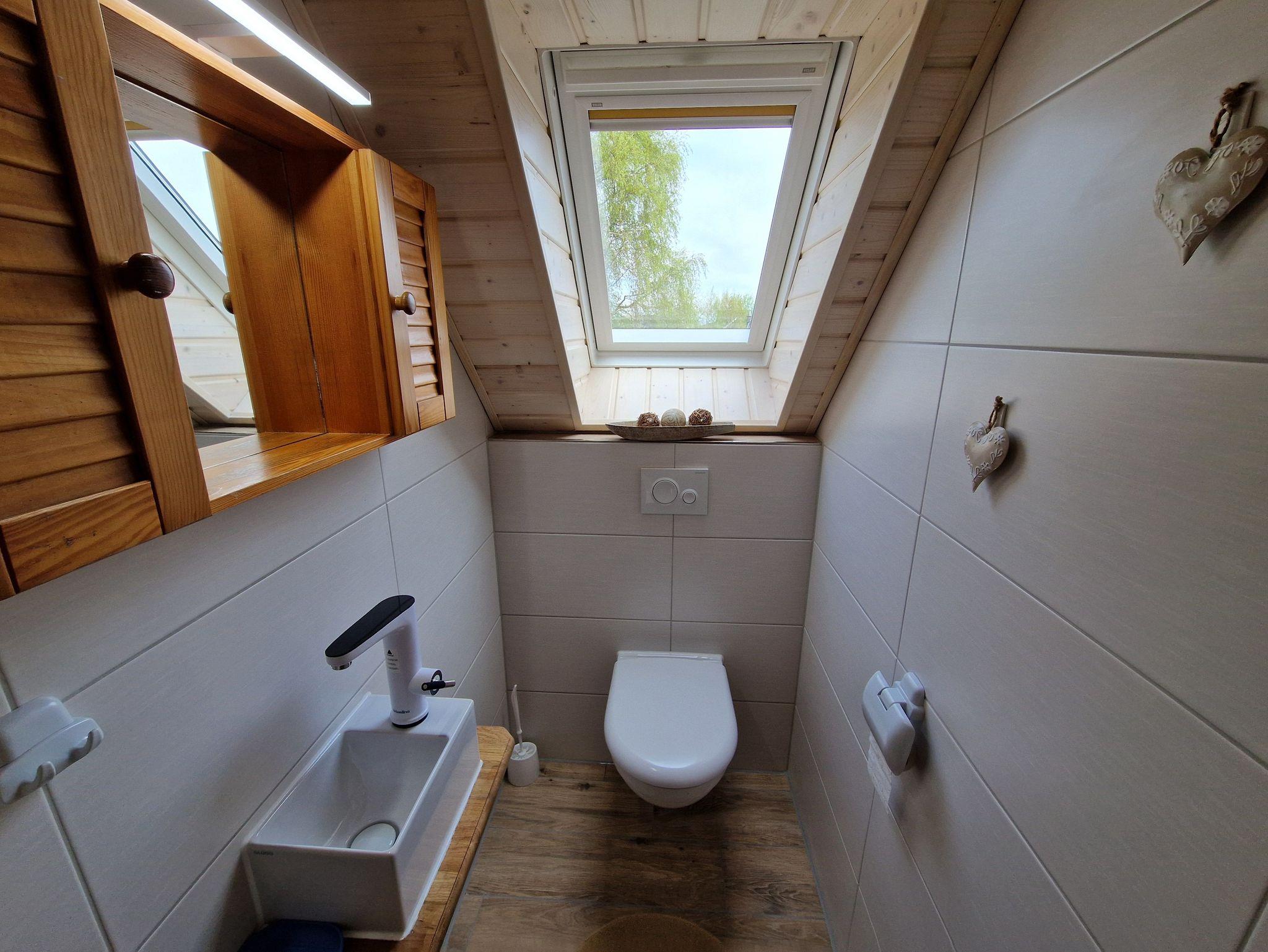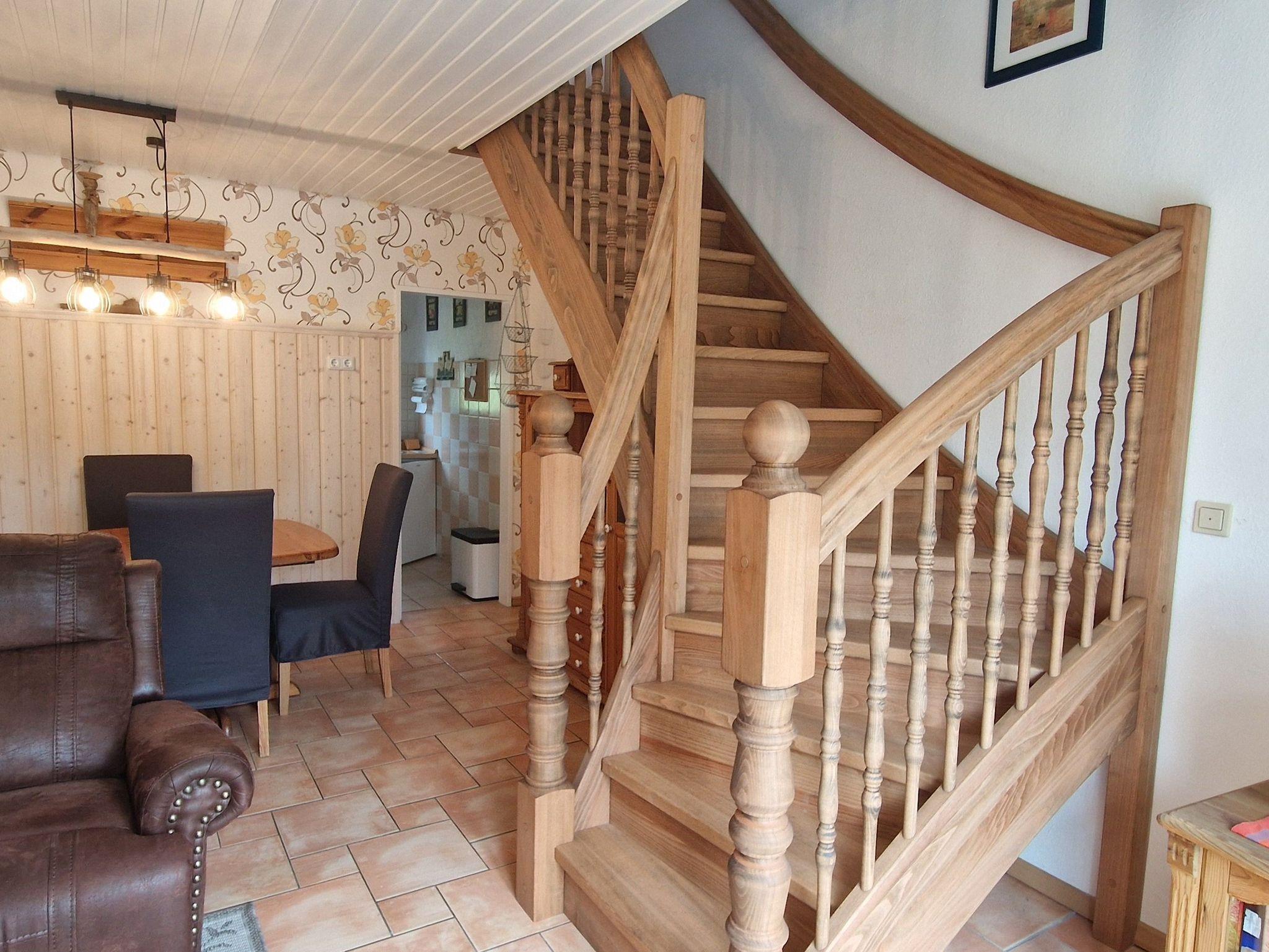 Im Erdgeschoss befinden sich ein Dusch/WC, ein Wohnraum mit Essecke und eine separate Kochnische. Eine Holztreppe führt ins Obergeschoss, in dem sich ein Schlafzimmer mit einem Doppelbett, sowie ein Schlafzimmer mit zwei Einzelbetten befinden. Beide Zimmer verfügen jeweils über einen Fernseher. Das Obergeschoss ist mit Korkboden ausgelegt. Das Ferienhaus ist mit einer E-Heizung ausgestattet.