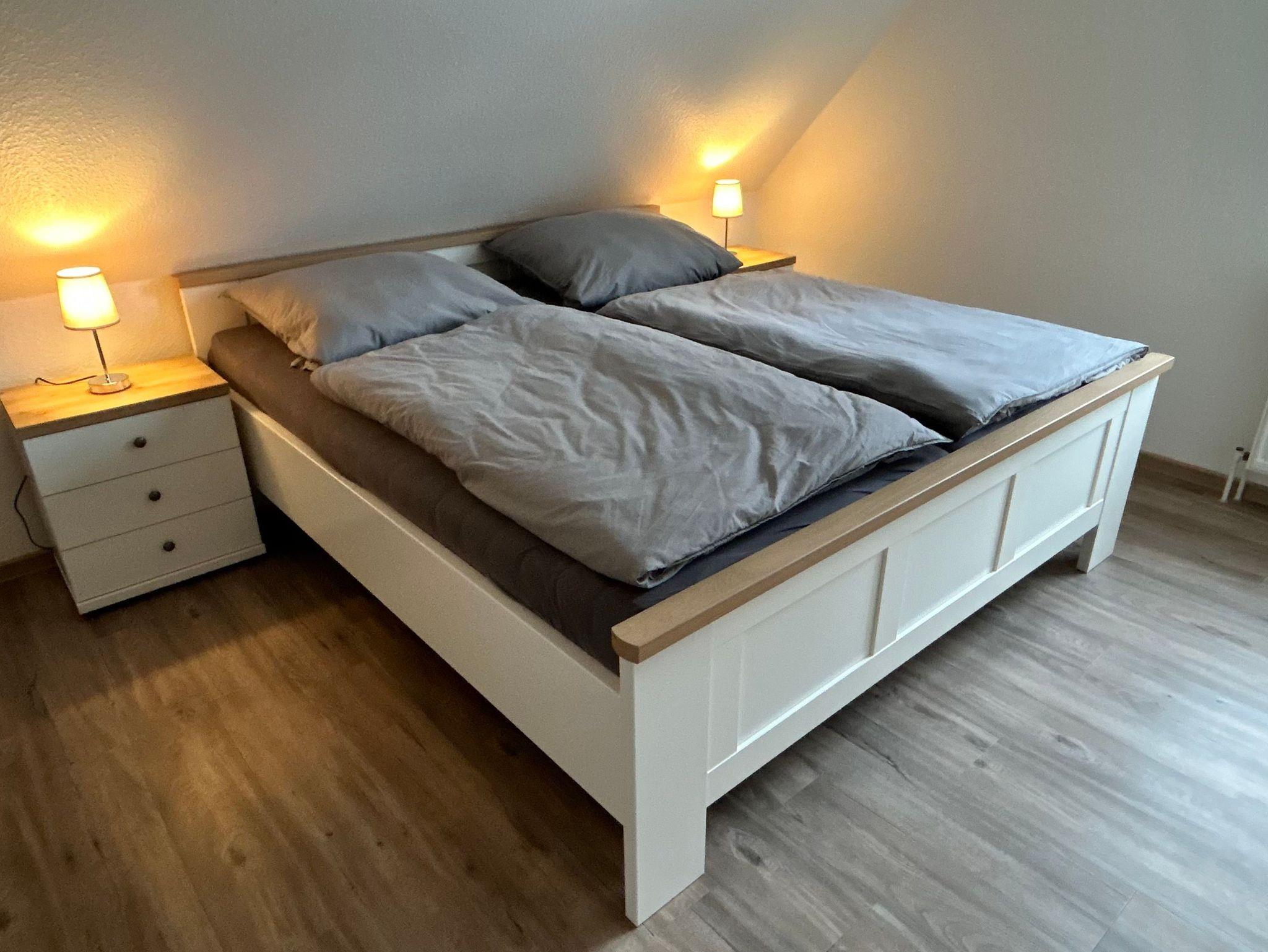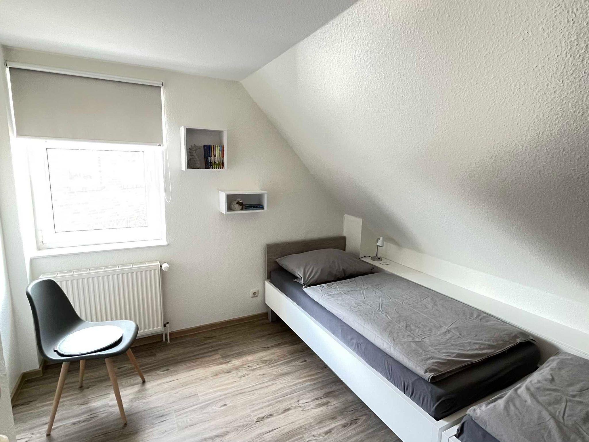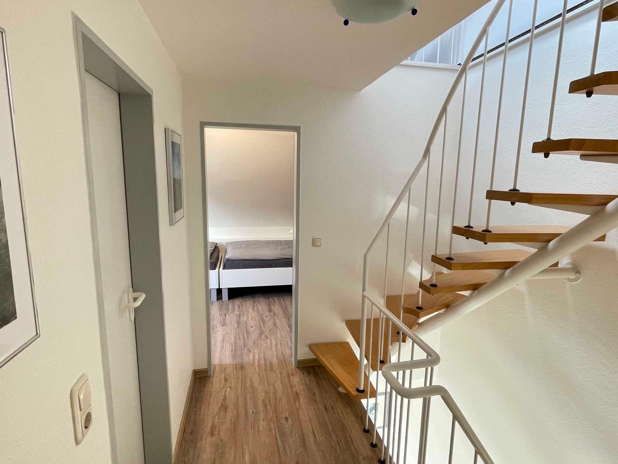 Im Erdgeschoss des ca. 70m² großen Reihenhauses befinden sich ein großzügiger und geschmackvoll eingerichteter Wohn- und Essbereich mit einer Küchenzeile sowie ein Gäste-WC. Vom Wohnraum führt eine offene Treppe ins Obergeschoss. Hier stehen ein Schlafzimmer mit einem Doppelbett, ein Schlafzimmer mit zwei Einzelbetten und ein Duschbad mit WC zur Verfügung. Die Böden im Erdgeschoss sind mit Fliesen ausgelegt.
