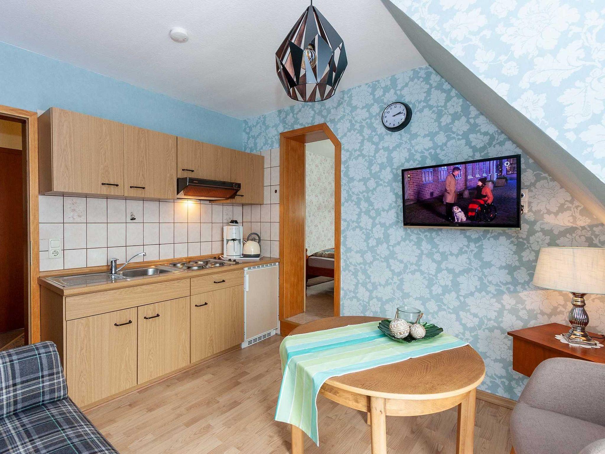 Kleine Obergeschosswohnung mit Balkon, geeignet für 2 Personen. Wohnzimmer mit SAT-TV und integrierter Küchenzeile. Schlafzimmer mit Doppelbett. Bad mit Dusche/WC.