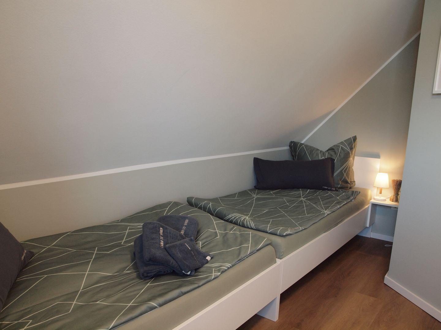 Das zweite Schlafzimmer ist mit zwei Einzelbetten (90x200 cm) ausgestattet. Gerne stellen wir auch für die ganz kleinen Gäste ein Babybett und einen Hochstuhl kostenfrei zur Verfügung.