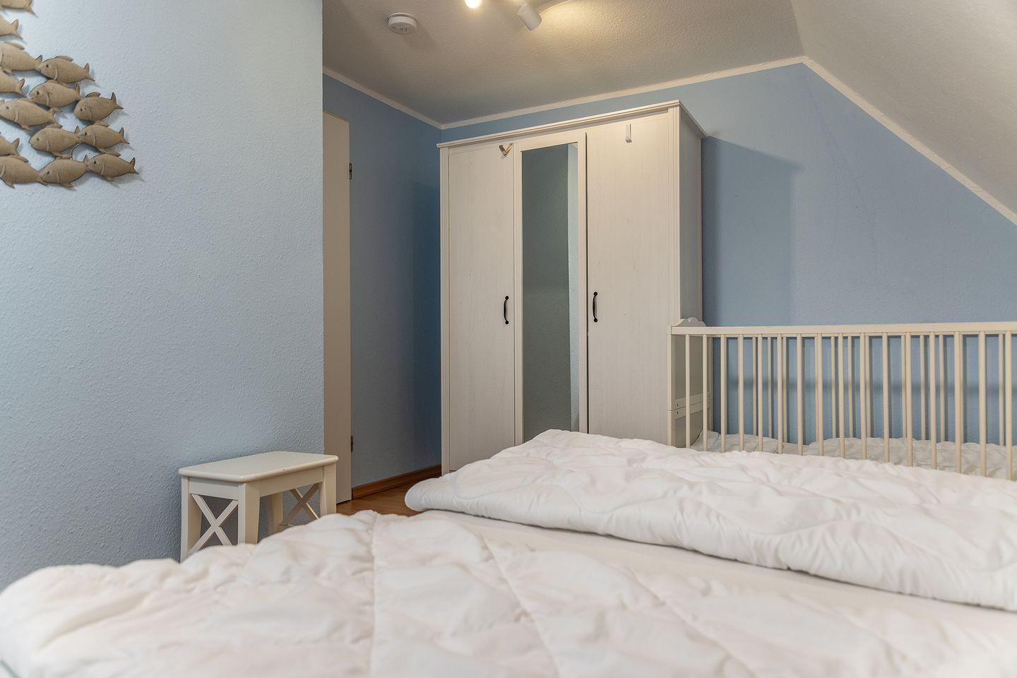 - Großes Schlafzimmer mit Doppelbett und Kinder-/Babybett, Nachtschränken und geräumigem Kleiderschrank