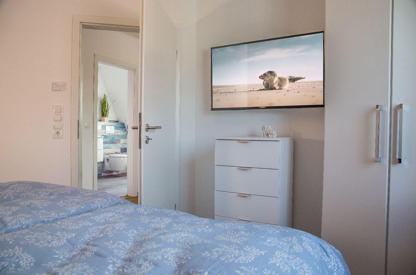 Schlafzimmer (1x Doppelbett, 1x2 Einzelbetten) inkl. TV und ein großzügiges Bad mit bodengleicher Dusche. Alle Fenster sind