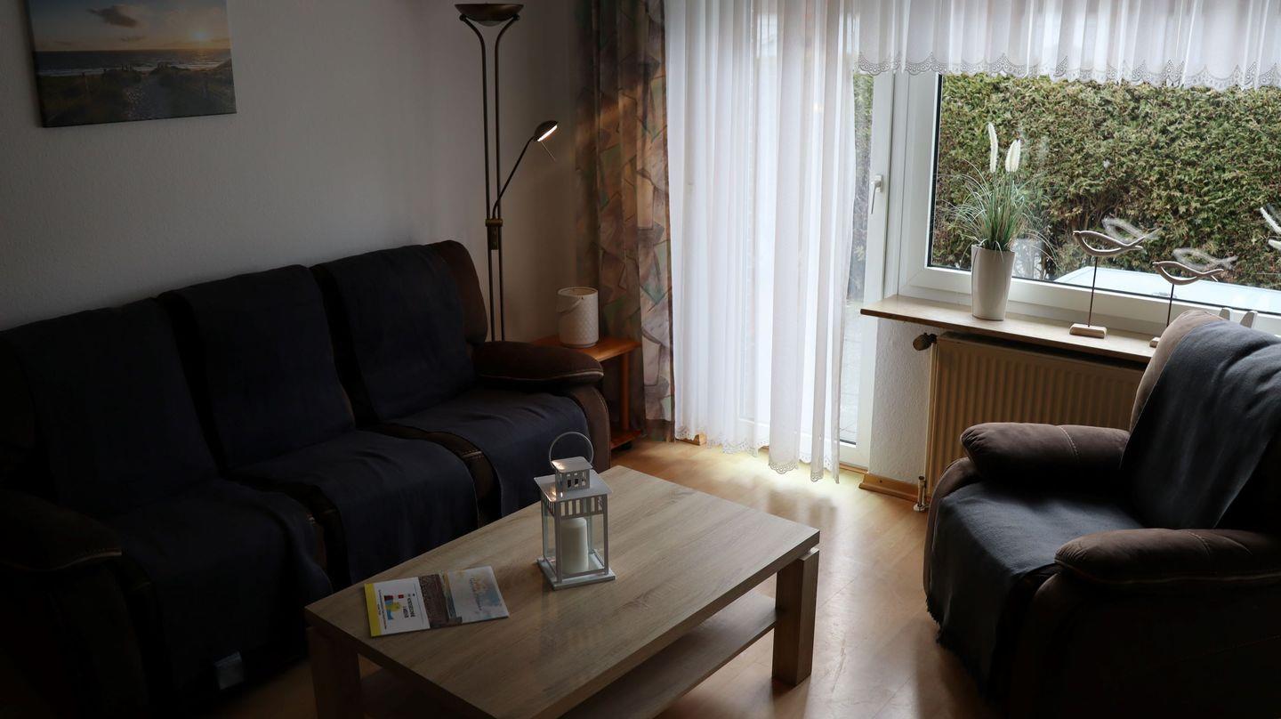 gemütliches Wohnzimmer mit Zugang zu einer kleinen Terrasse