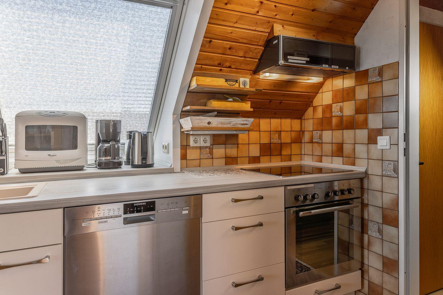 Die Küche ist vollausgestattet mit einem Kühlschrank, Mikrowelle, Geschirrspüler etc.