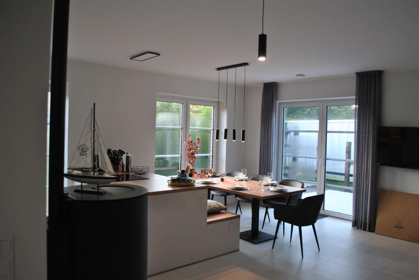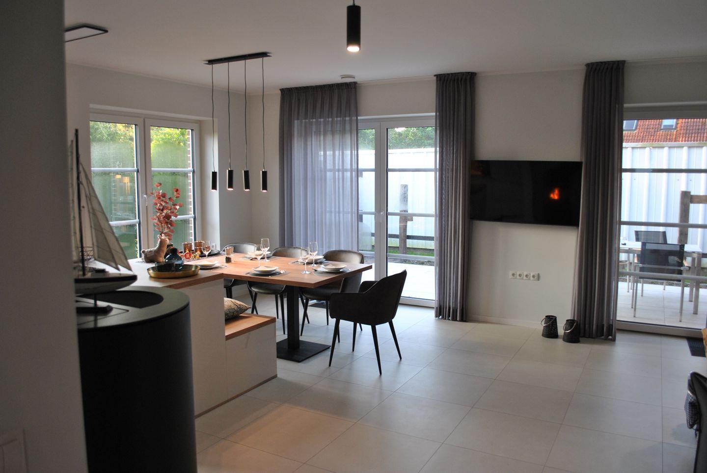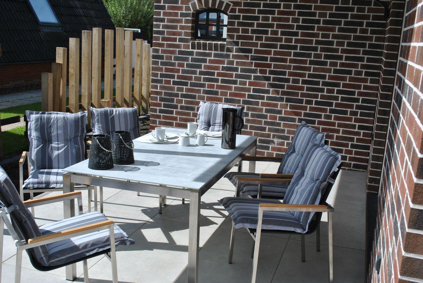 Durch die bodentiefen Fenster betritt man die großzügige, teilweise überdachte Terrasse, mit Blick in den friesisch gestalteten Garten.