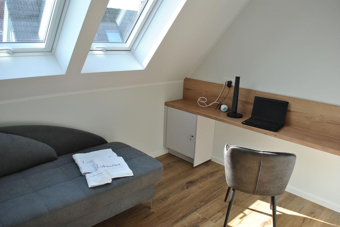 Im Dachgeschoss gibt es ein weiteres Schlafzimmer mit einem Boxspringbett mit einer Liegefläche von 2 x 2m.