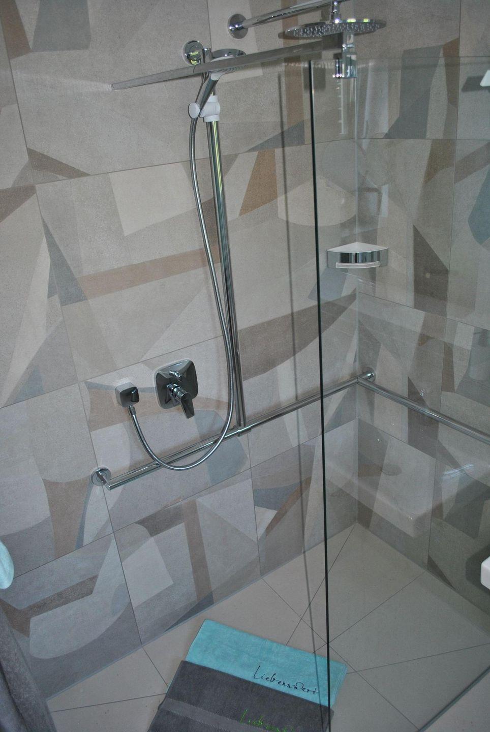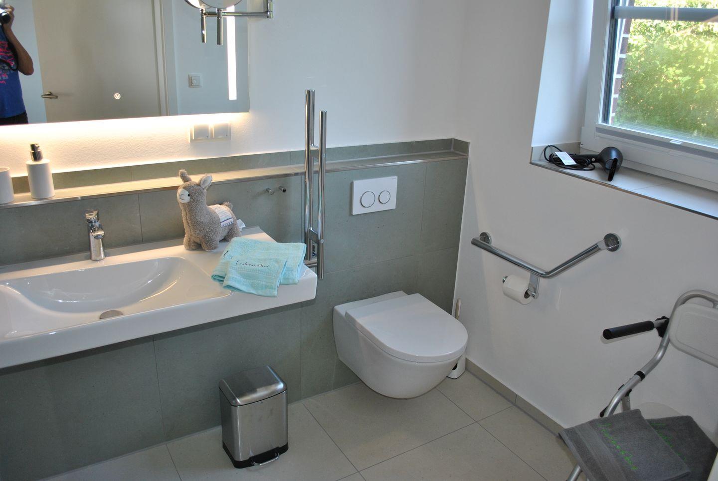 Das Badezimmer ist mit einer bodengleichen Dusche und einem Duschrollstuhl ausgestattet. Durch verschiedene, zusätzliche Haltegriffe in der Dusche und an der Toilette, ist das Badezimmer auch für Menschen mit Handicap, geeignet.