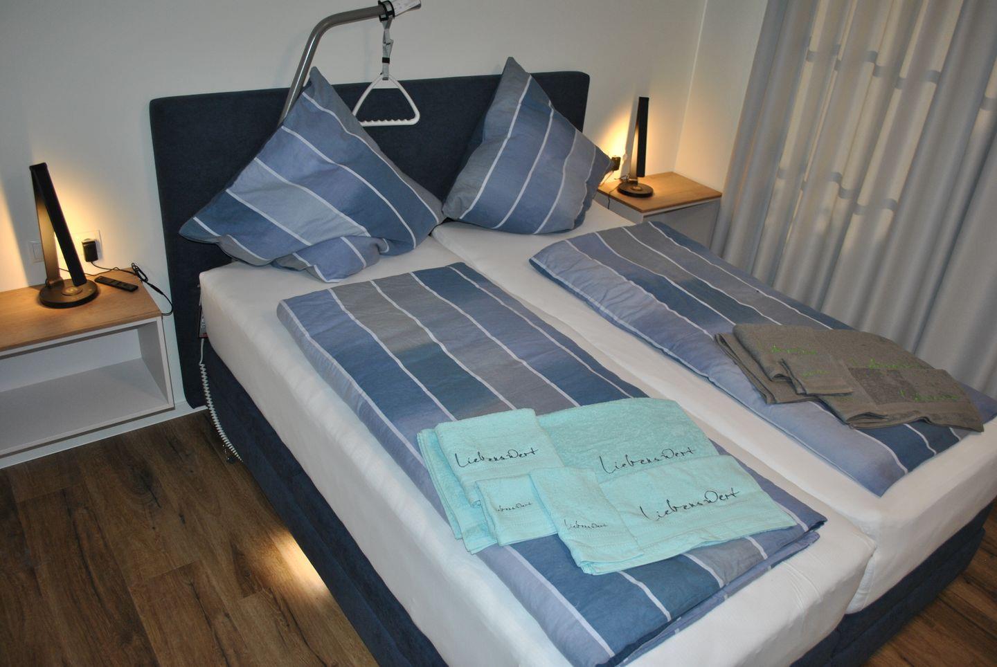 Das Schlafzimmer ist mit hochwertigen Boxspringbetten, die auch als Pflegebetten benutzt und individuell angepasst werden können, ausgestattet.