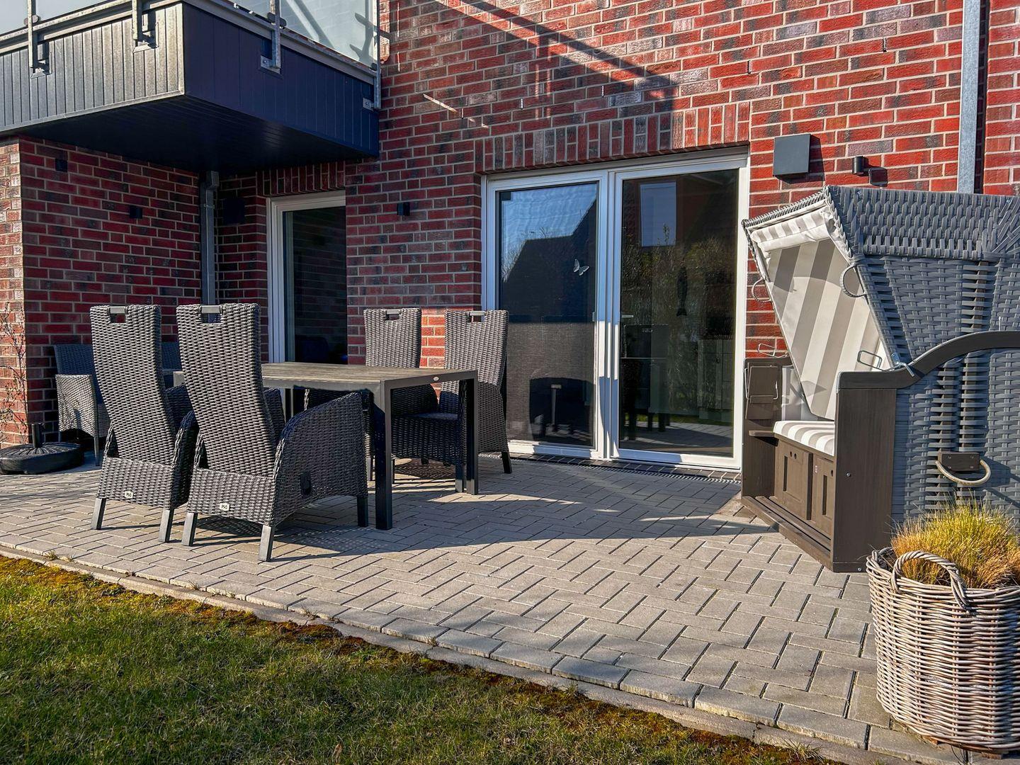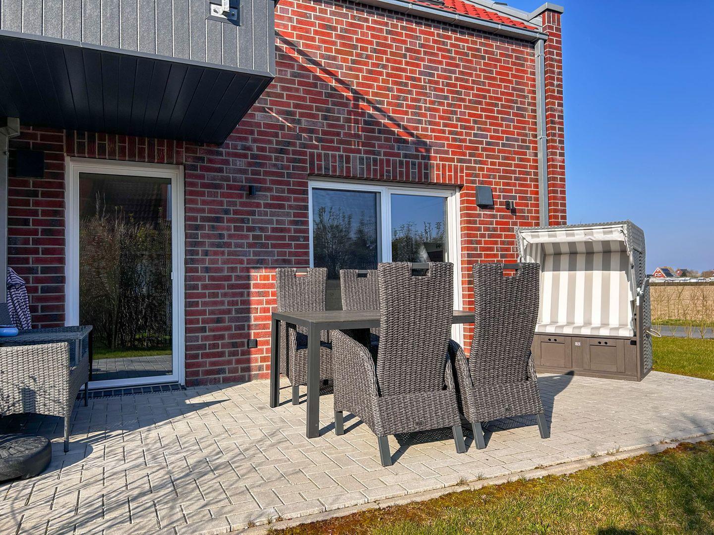 Die eigene Terrasse mit Gartenmöbeln und Sonnenschirm lädt zum Verweilen ein, während die ruhige Lage und der nahe Deich den perfekten Rahmen für entspannte Spaziergänge, Fahrradtouren oder Nordseeabenteuer bieten. Privatparkplatz inklusive.