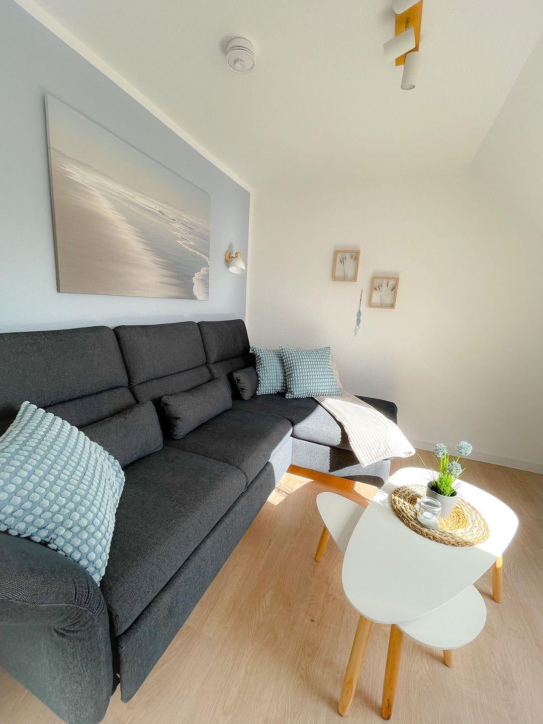Diese geschmackvoll und modern eingerichtete Wohnung bietet einen durchdachten Wohnraum, ideal für ein bis zwei Personen, oder eine kleine Familie. Die Wohnung verfügt über ein gemütliches, kleines Wohnzimmer sowie eine separate Küche. Das Schlafzimmer ist hell und einladend gestaltet.