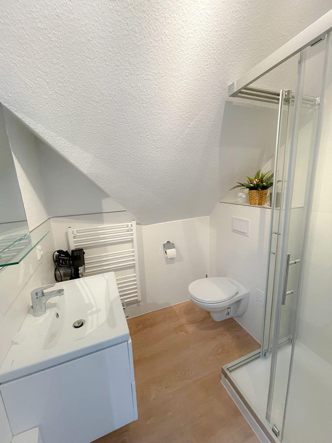 Das Badezimmer ist mit einer Dusche, einem Waschtisch und WC ausgestattet und erfüllt alle Anforderungen an Komfort und Funktionalität.