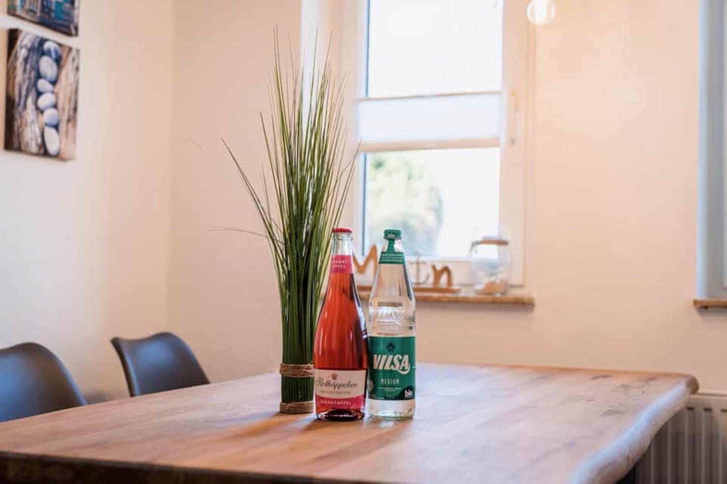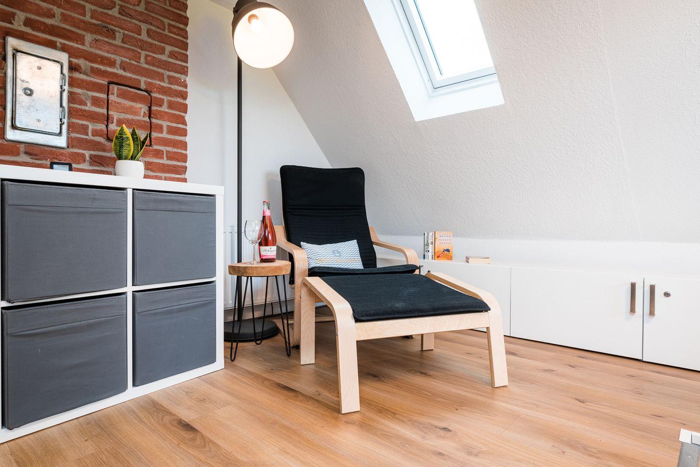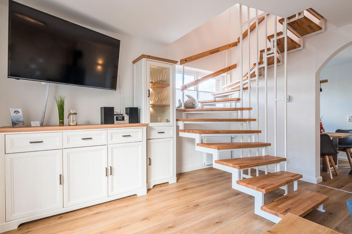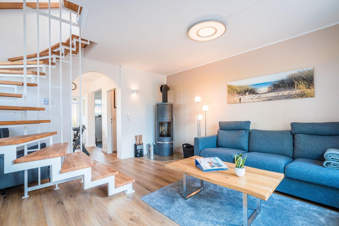 - Großes, geschmackvoll eingerichtetes Wohnzimmer mit Smart-TV, Stereo-Anlage mit Bluetooth und AUX-Anschluss, gemütlicher Kaminofen
