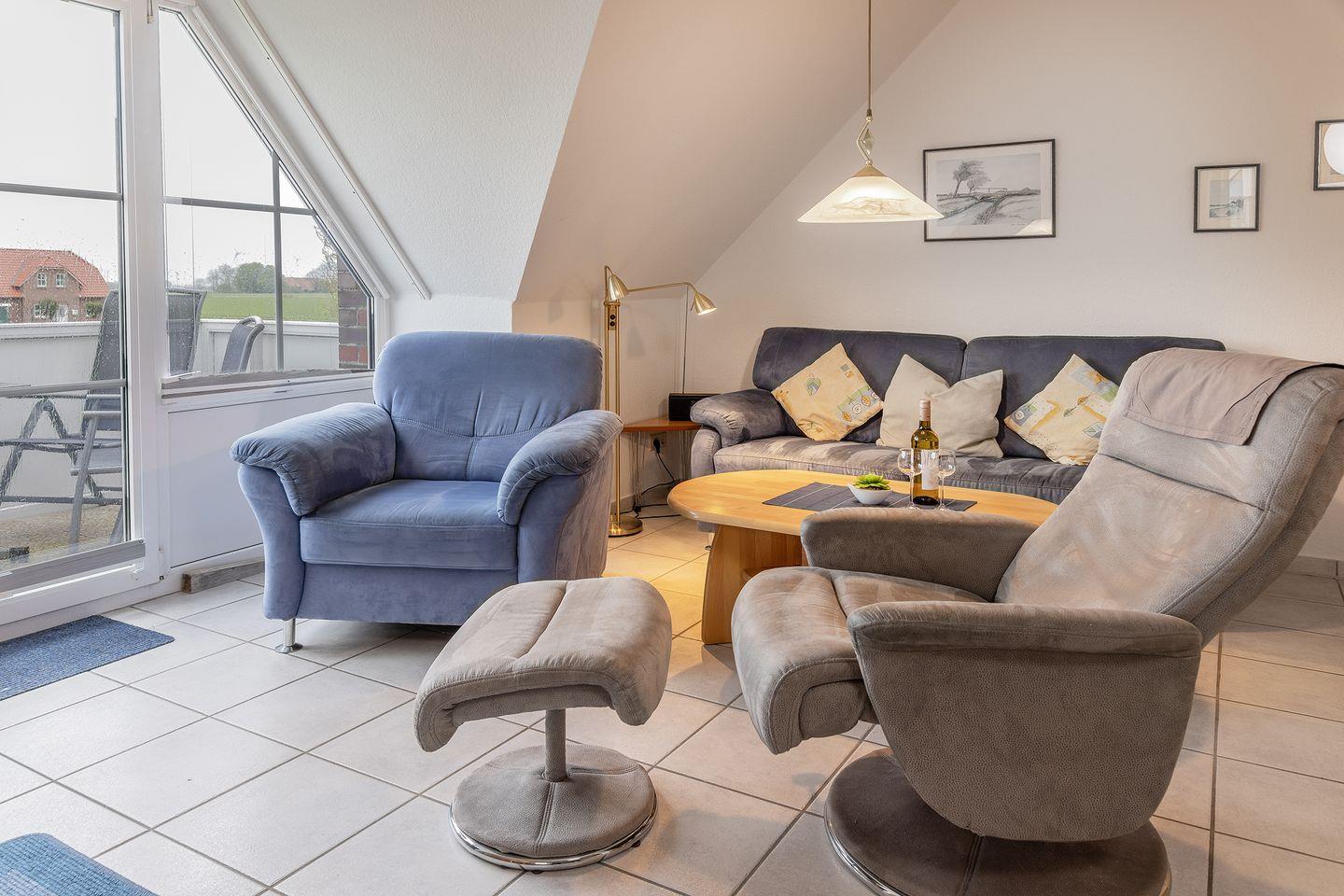 Adrett und behaglich: Diese schicke Obergeschosswohnung mit seinen ca. 54 qm hält Platz für 4 bis 5 Personen und bietet einen fantastischen Blick vom Balkon aus über die satten, grünen Felder Ostfrieslands.