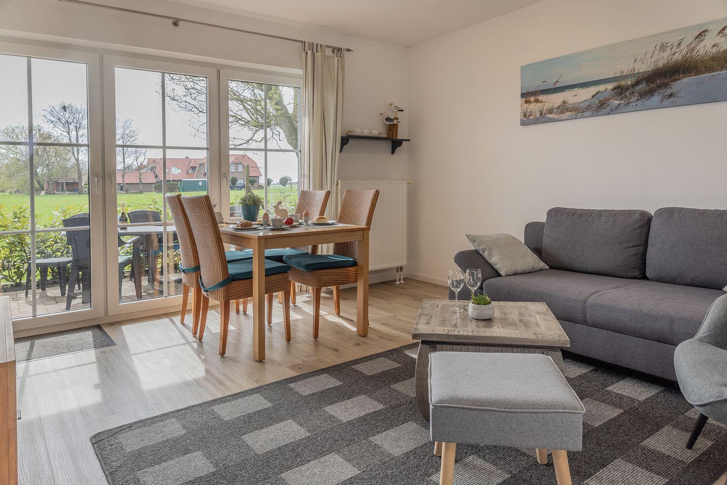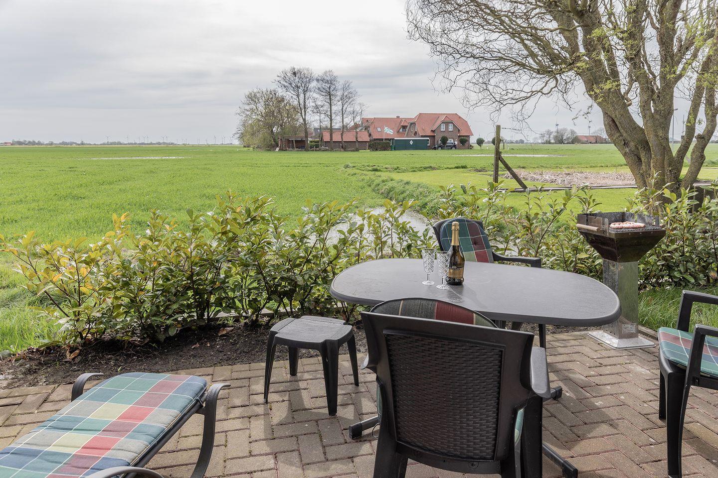 Einfach mal ausspannen und nichts tun: Diese ruhig gelegene Ferienunterkunft von ca. 50 qm hat eine fabelhafte Terrasse mit unverbautem Blick auf die grünen Felder Ostfrieslands.