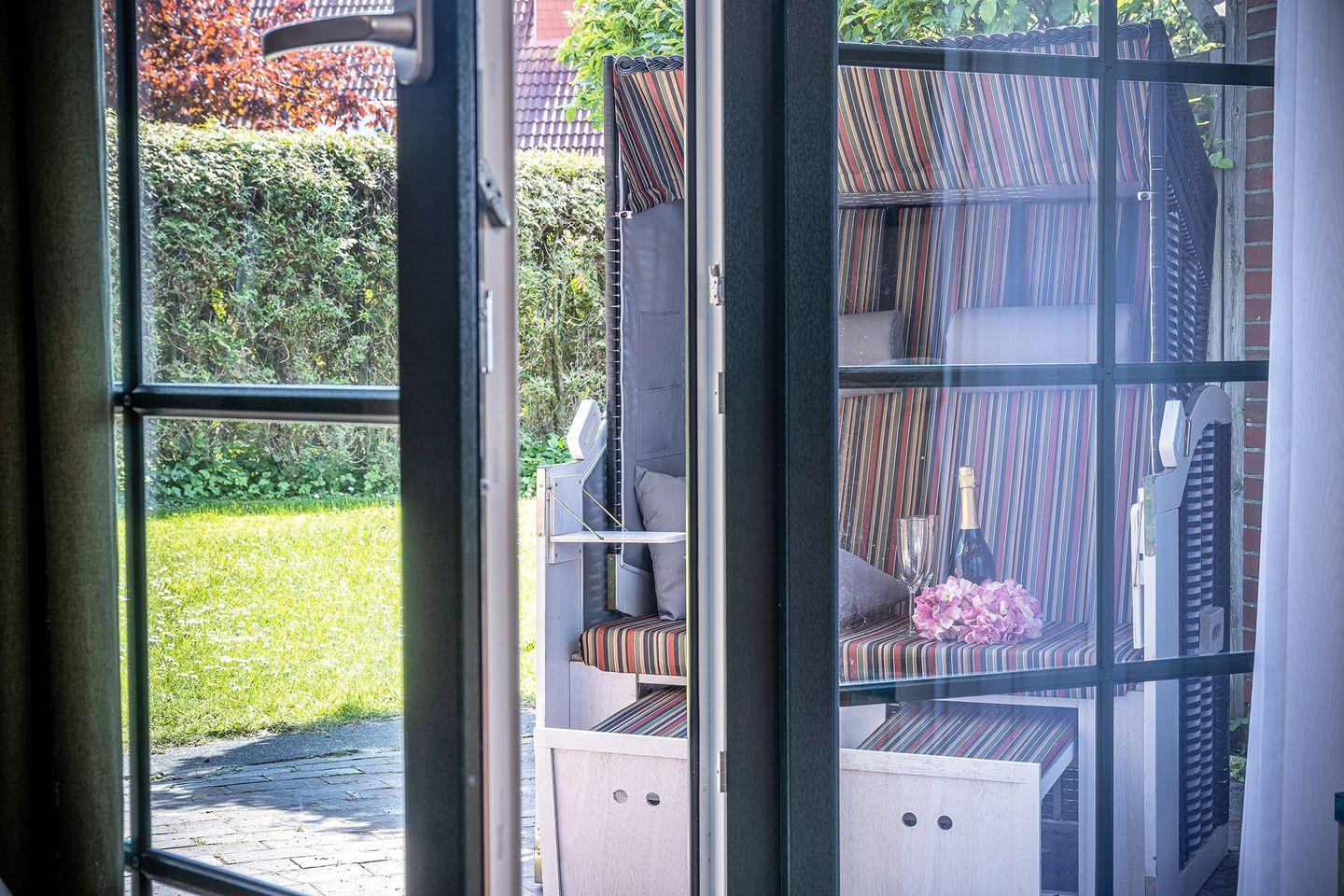 Zugang zur Terrasse mit Strandkorb und zum großen Garten