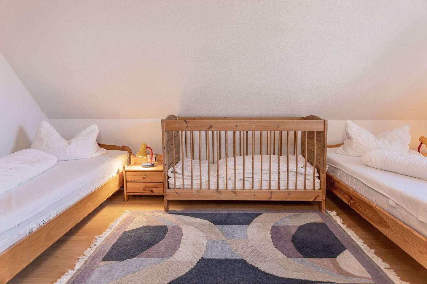 1 Schlafzimmer mit zwei Einzelbetten, Kinderbett.