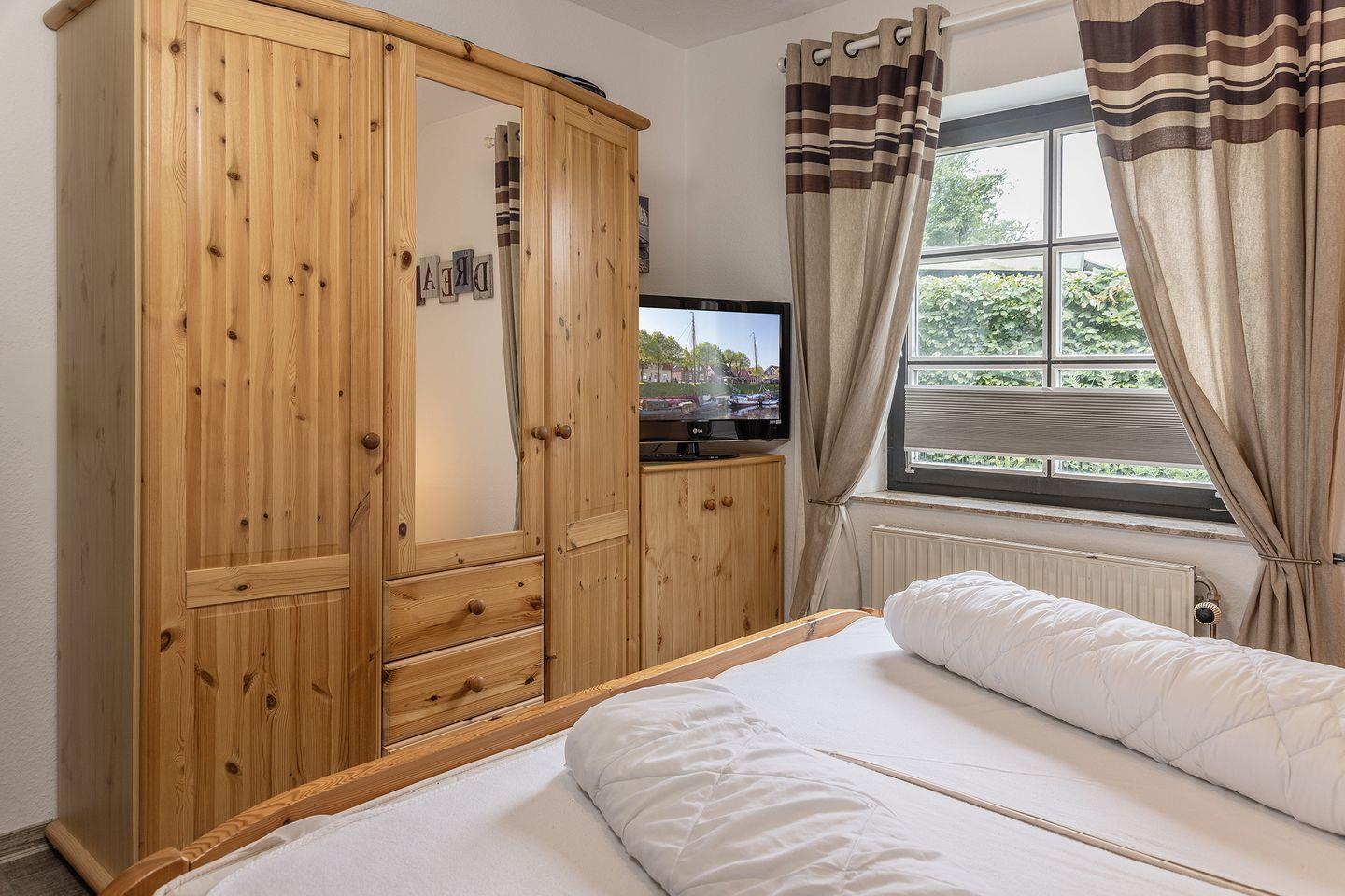 1 Schlafzimmer mit Doppelbett und TV