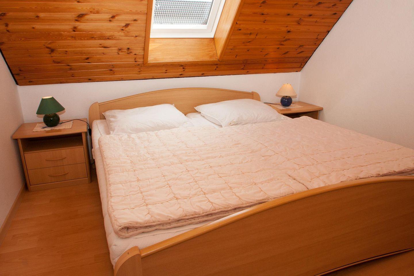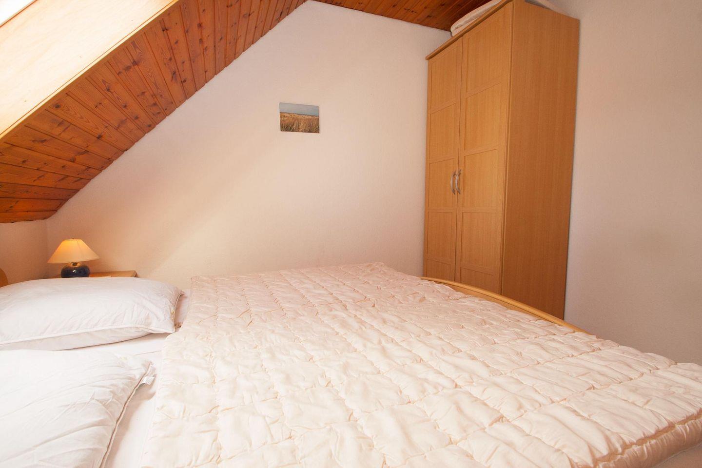 Zwei Schlafzimmer mit je einem Doppelbett und einem Kleiderschrank, zustellbares Kinderreisebett.