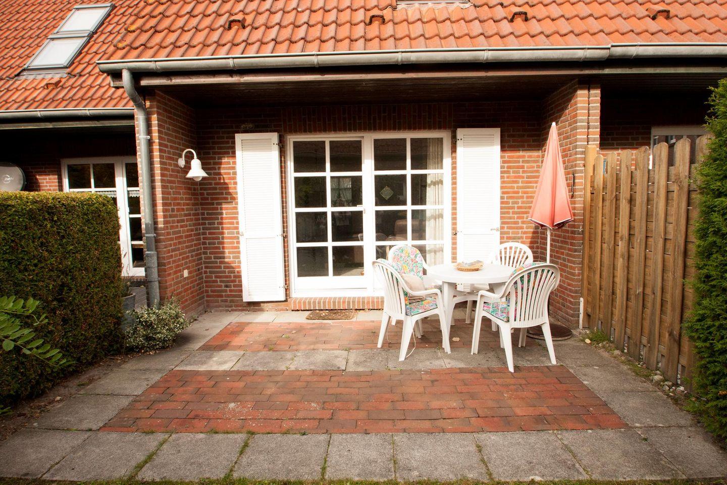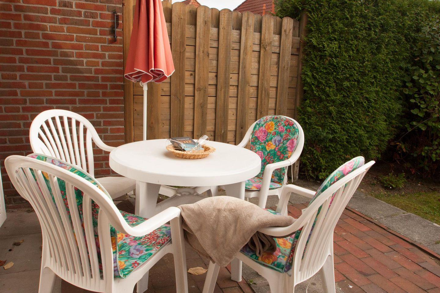 Gäste-WC, Abstellraum, Terrasse mit kleinem Garten in Südlage, Gartenmöbel.
