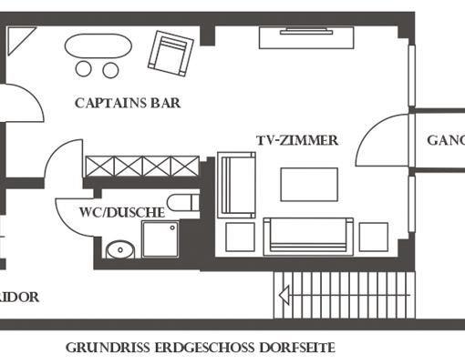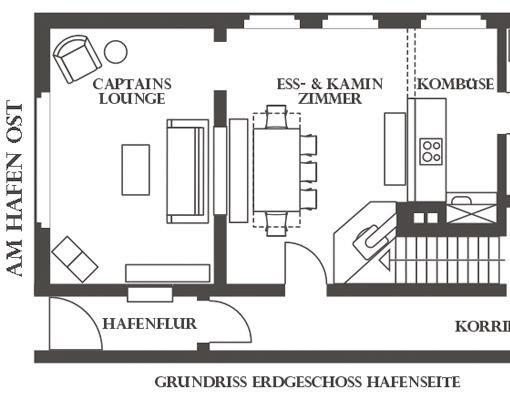 Bar-Lounge, Esszimmer, gut ausgestattete Küche „Kombüse“ (offen zum Essbereich),