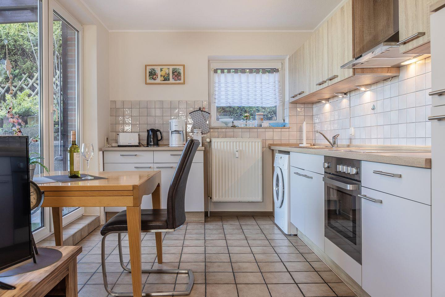 Geräumiges Wohnzimmer mit Sat-TV, Kinderhochstuhl, angrenzende Küche mit Essplatz, komplette Küchenzeile mit integrierter Waschmaschine.