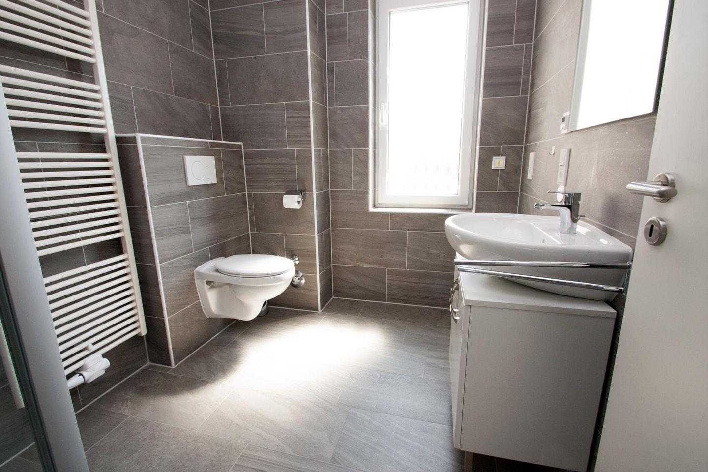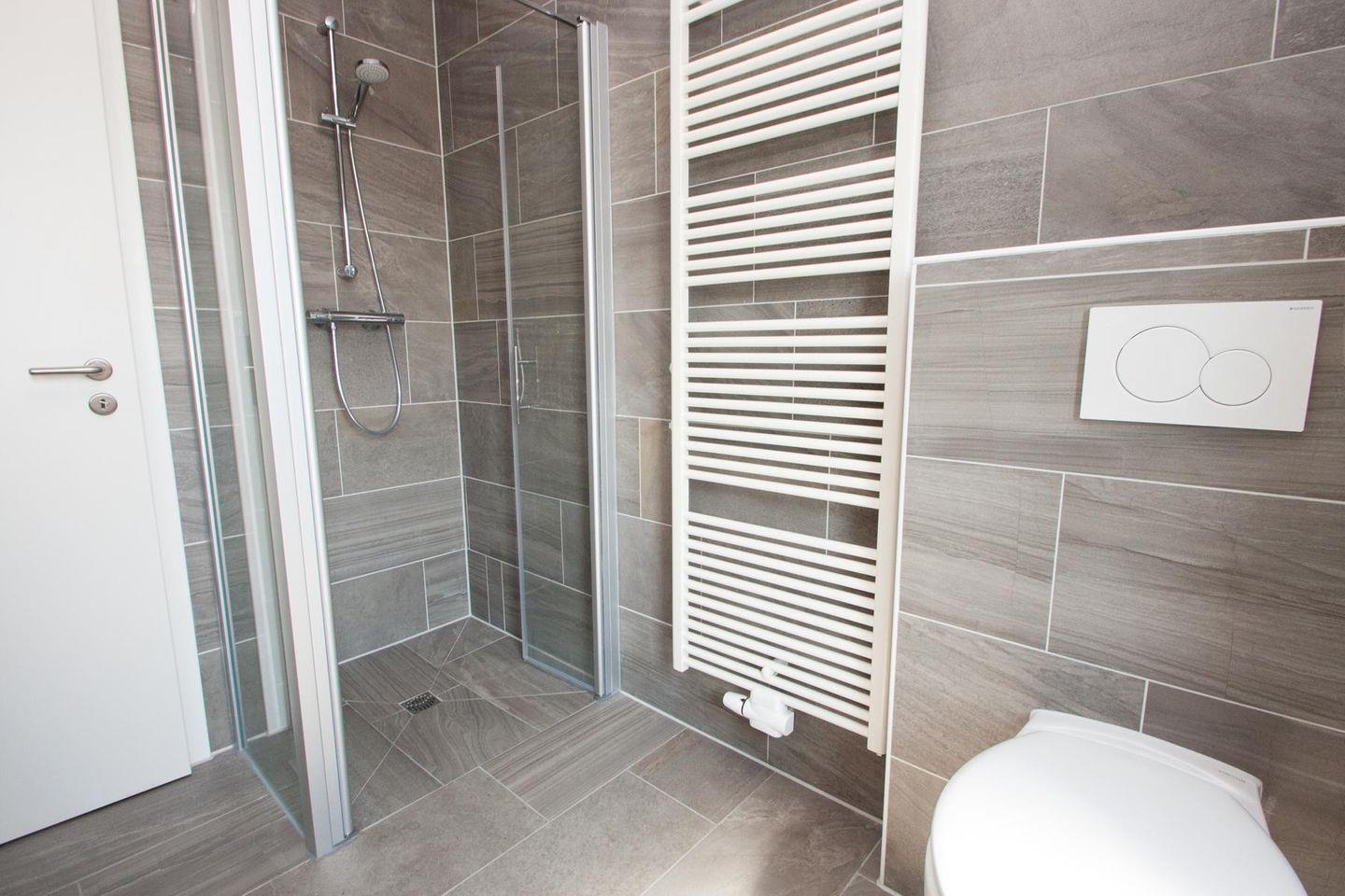 Bad mit ebenerdiger Dusche (inkl. Duschsitz) und WC.