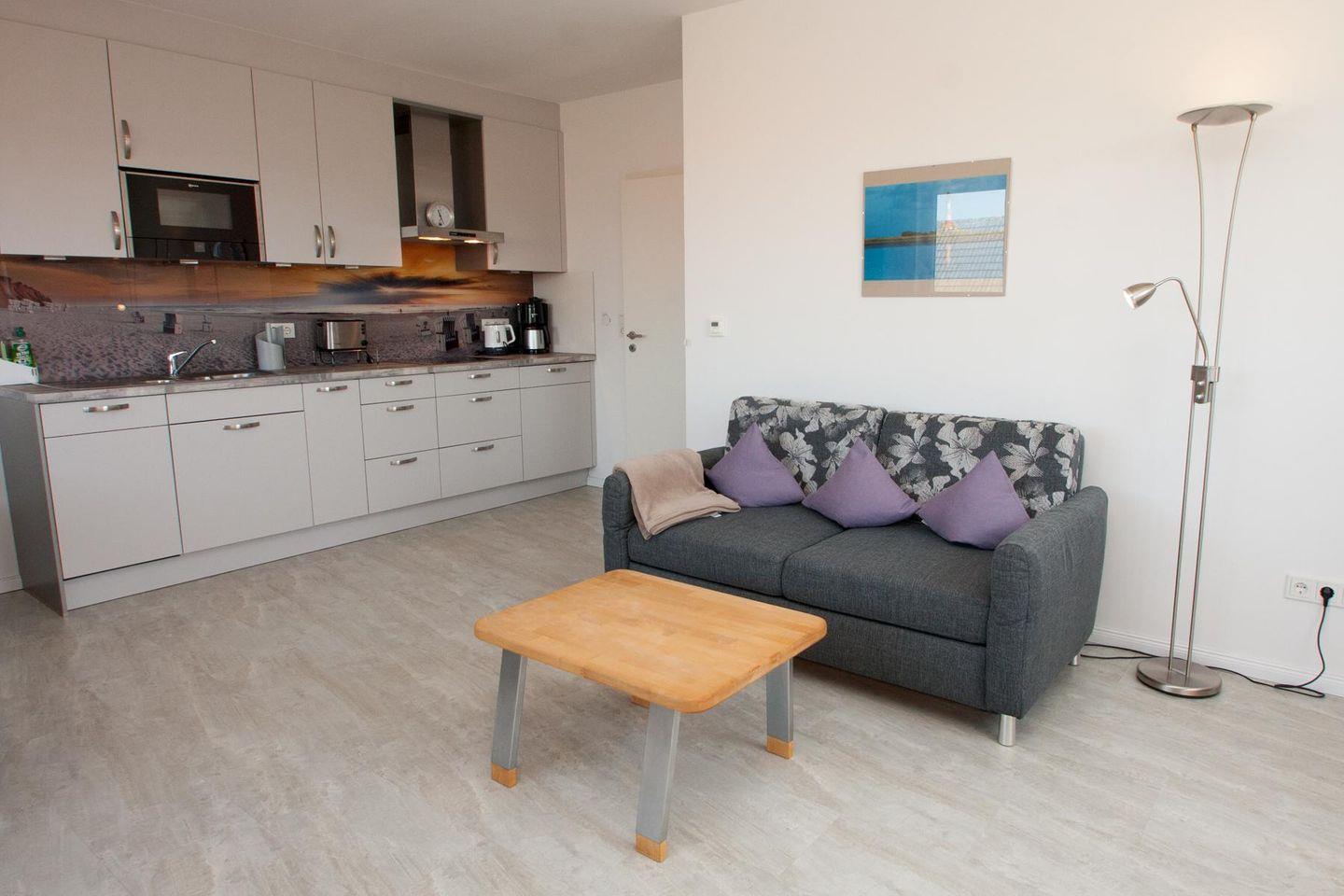 Hell und offen: Die wohnliche und im Jahr 2017 fertig erstellte Obergeschosswohnung mit ihren ca. 59 qm bietet Unterkunft für 3 Erwachsene und 1 Kleinkind. Auf dem herrlichen Balkon kann man es gemütlich angehen lassen.