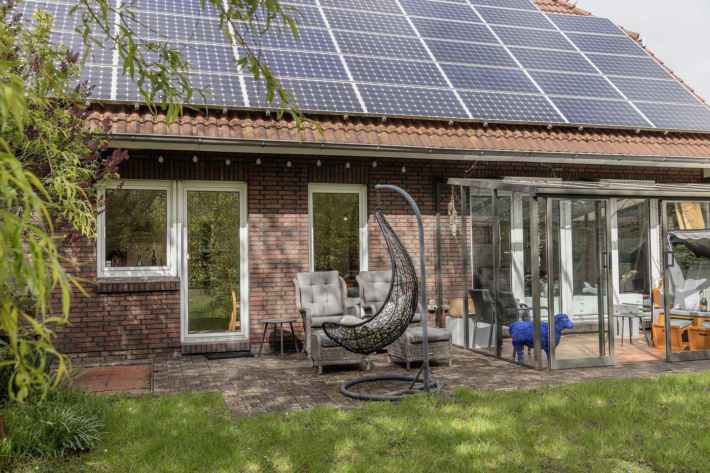 Großes Wohnzimmer mit Kaminofen und angeschlossenem Wintergarten.