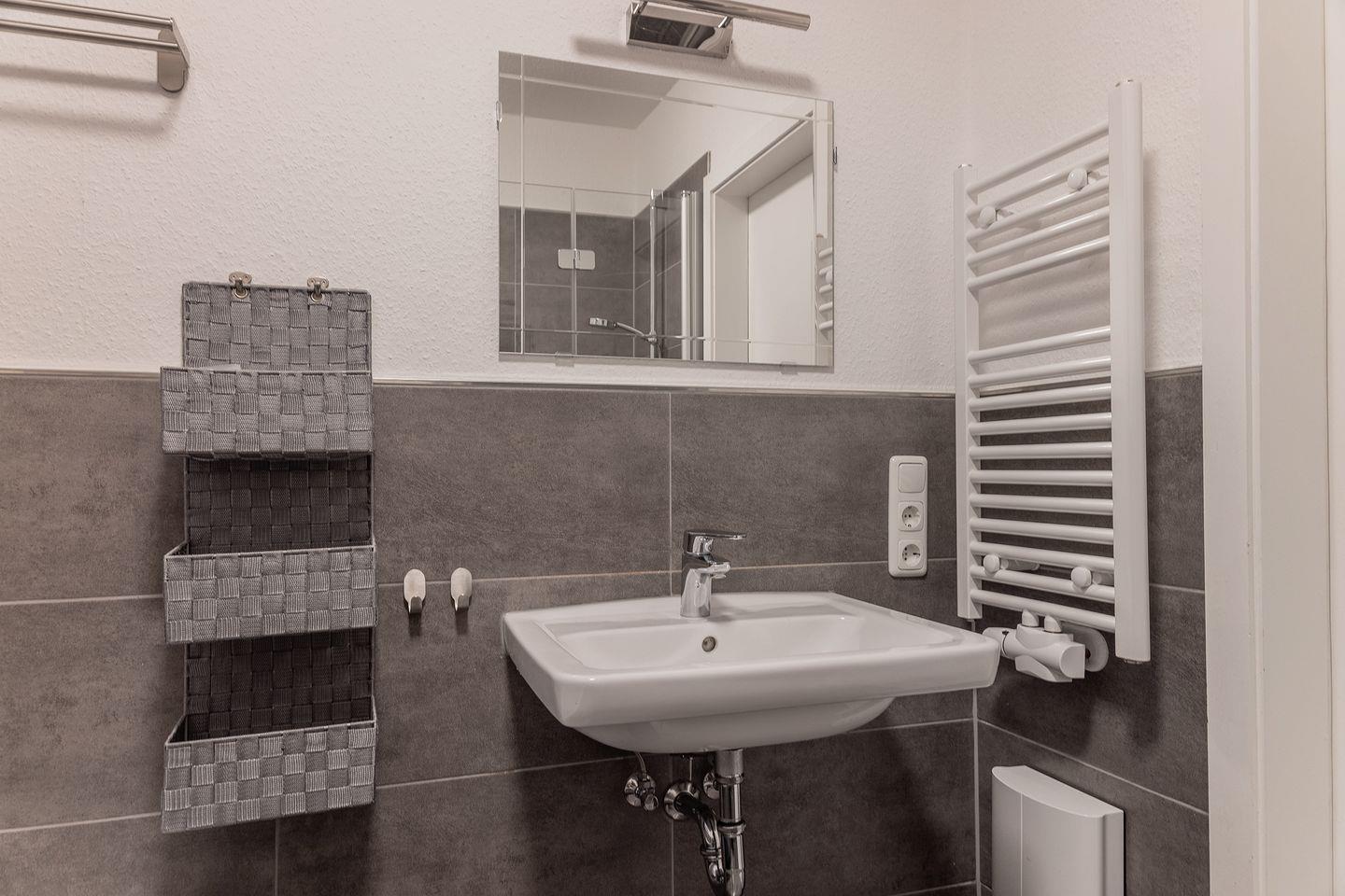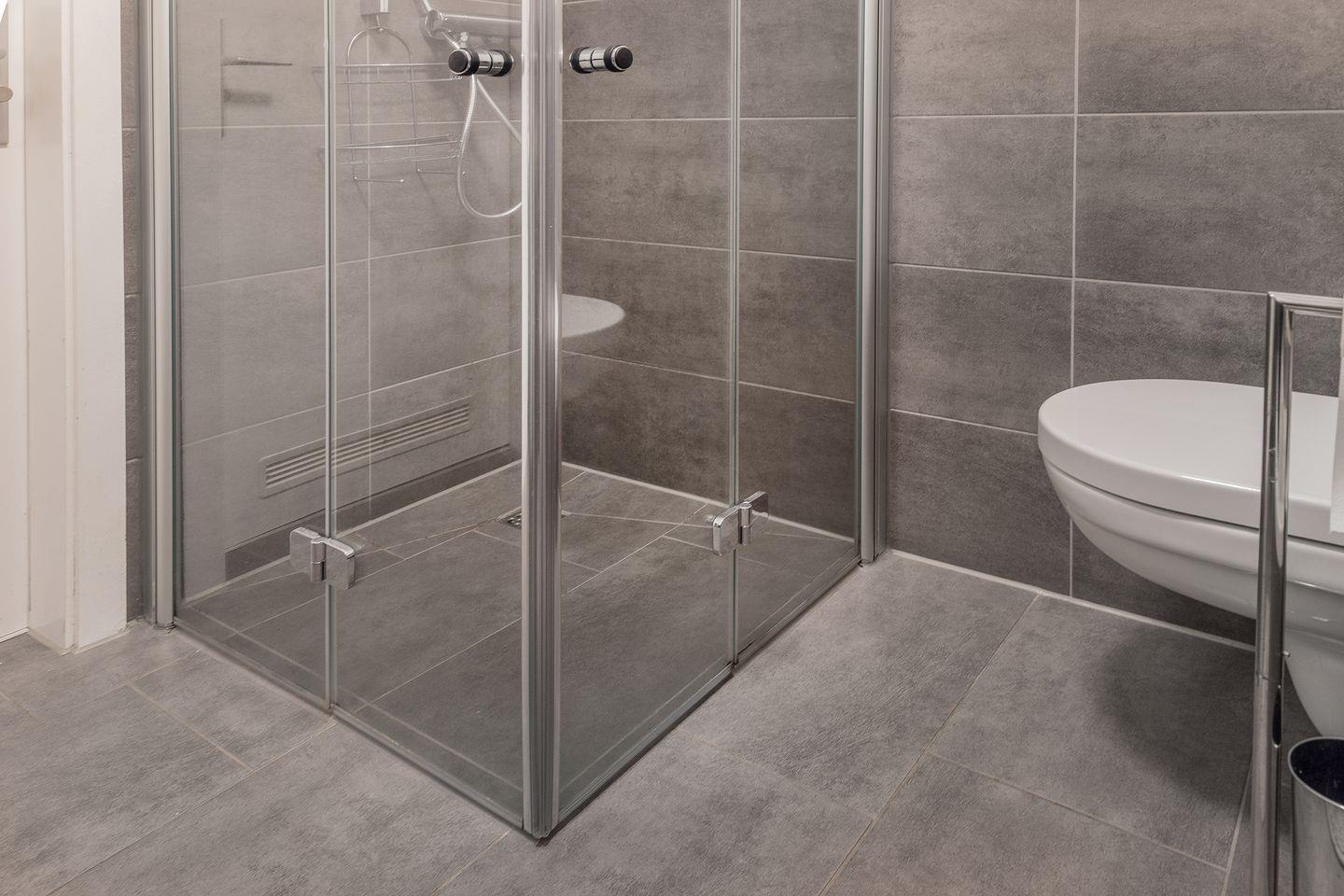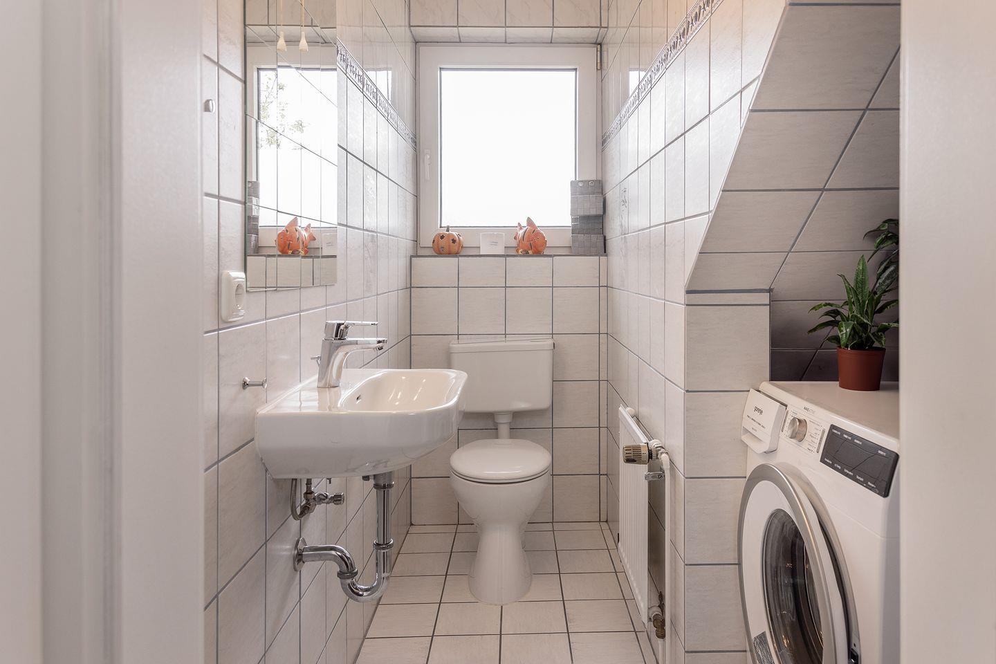 Modernes Bad mit bodengelicher Dusche, Badewanne und WC. Zusätzliches Gäste-WC mit Waschmaschine.