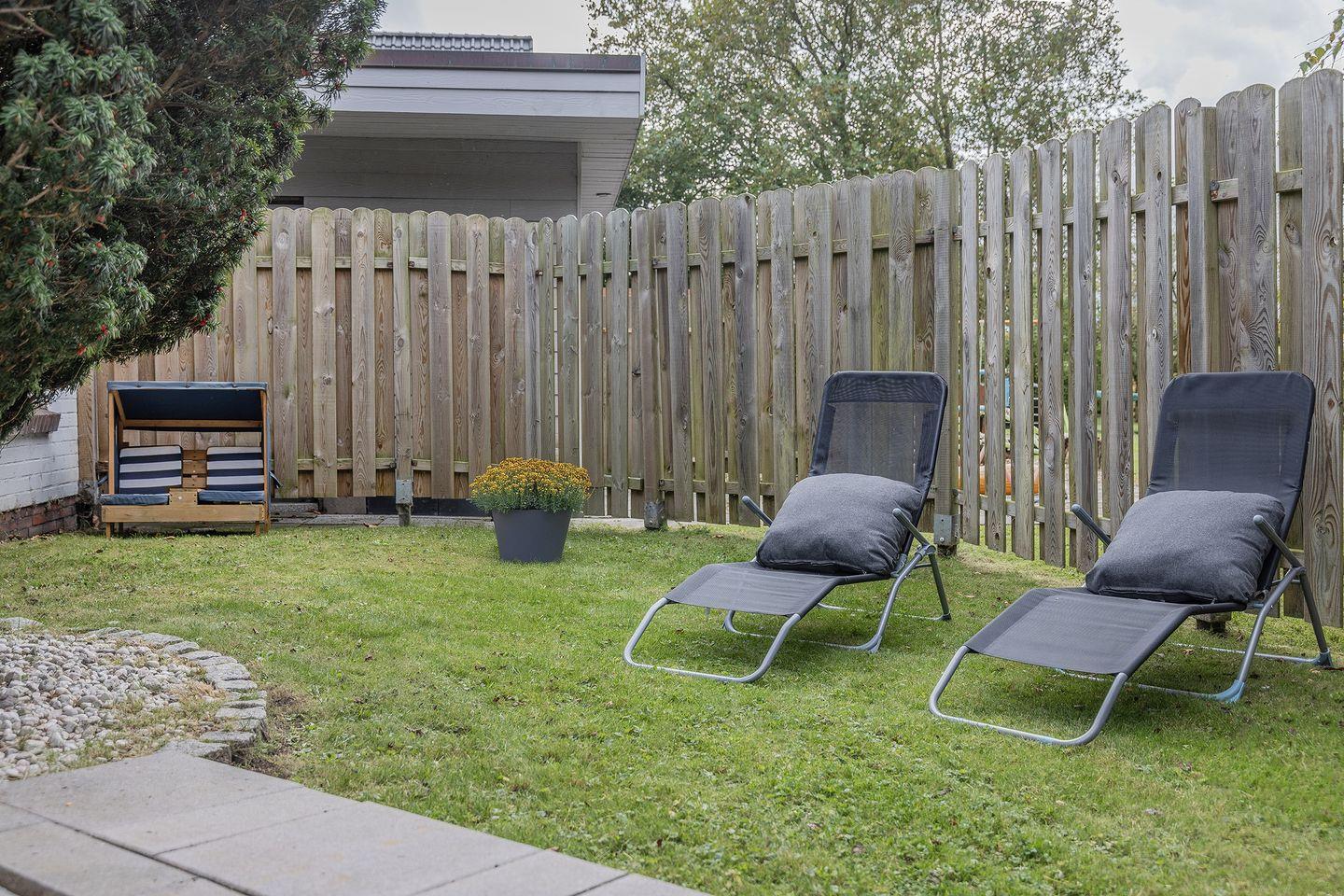 private Terrasse mit Gartenmöbeln, zwei Sonnenliegen und Sonnenschirm