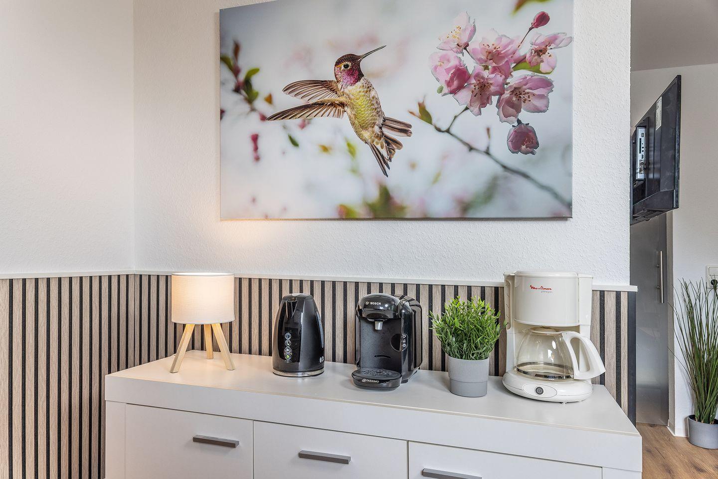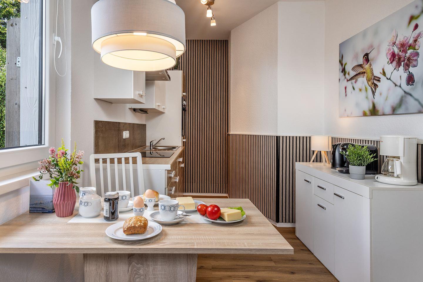 Essgruppe und komplett ausgestattete Küchenzeile u.a. mit Herd, Backofen, Spülmaschine, Kühlschrank mit Gefrierfach, Mikrowelle, Kapselkaffeeautomat, Filterkaffeemaschine und weiteres Küchenzubehör