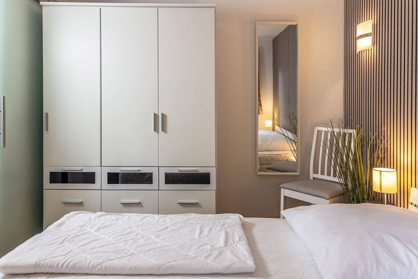 Schlafzimmer mit Doppelbett 1,80 x 2,00m, Kleiderschrank, Radiowecker