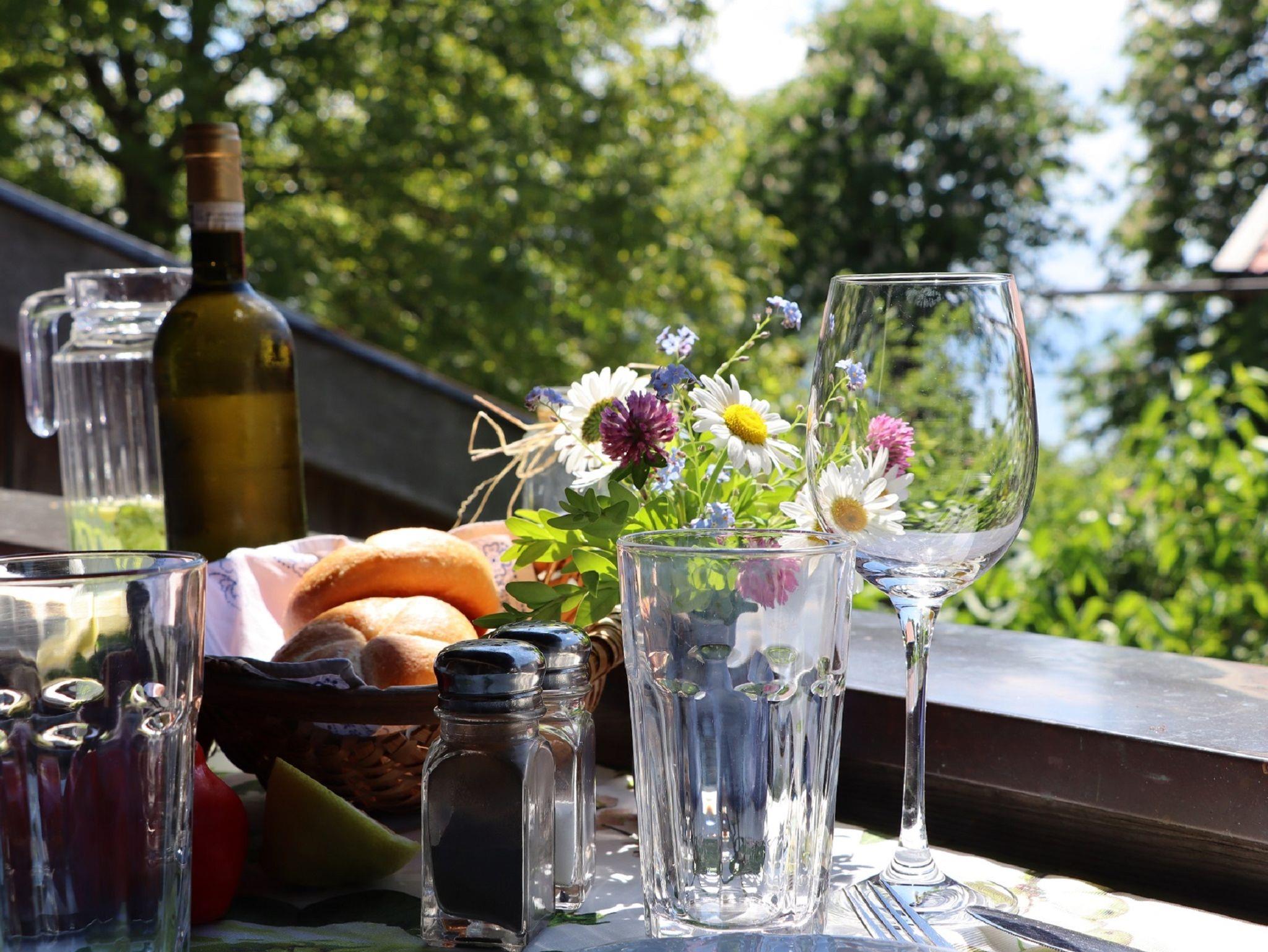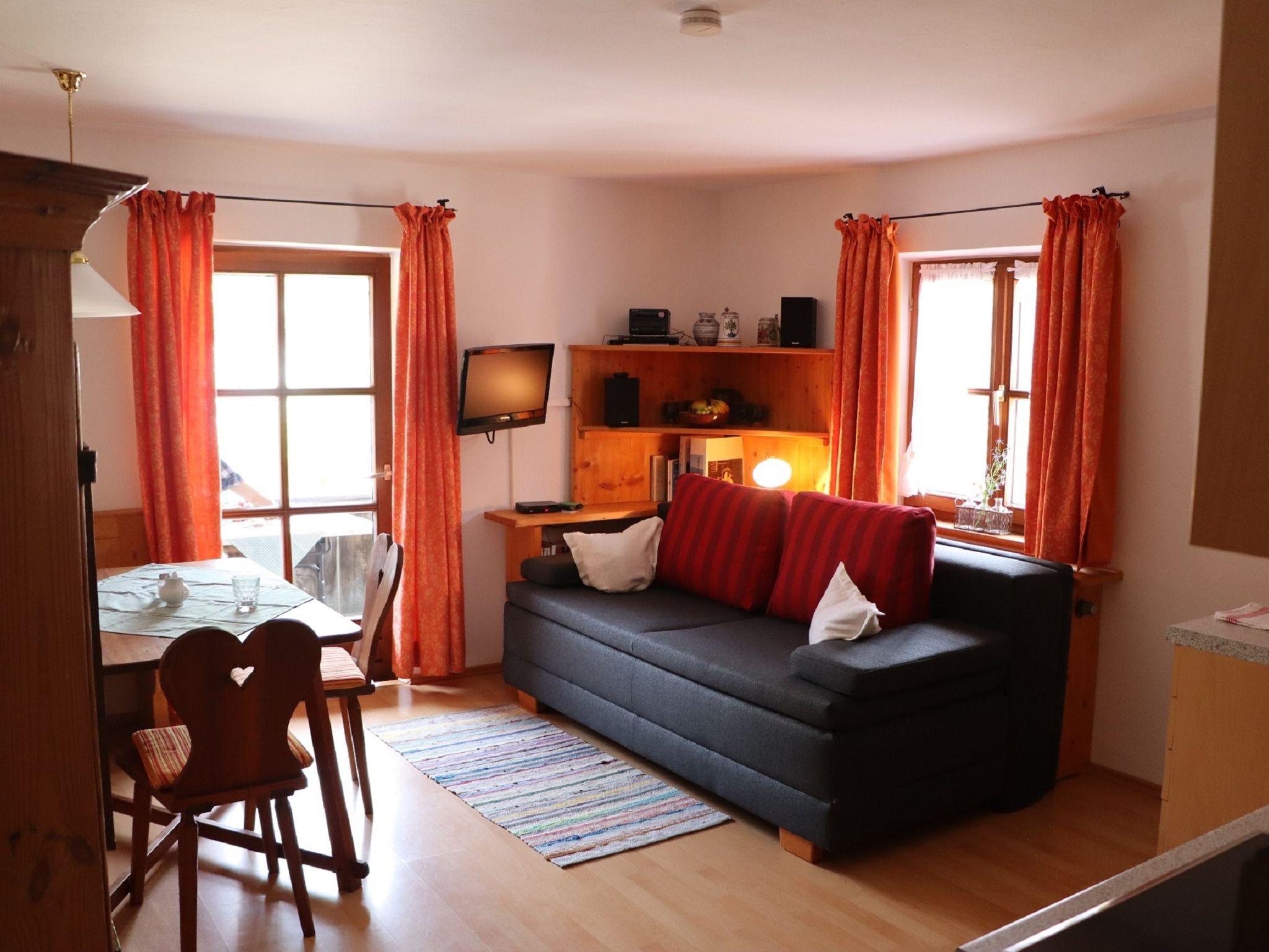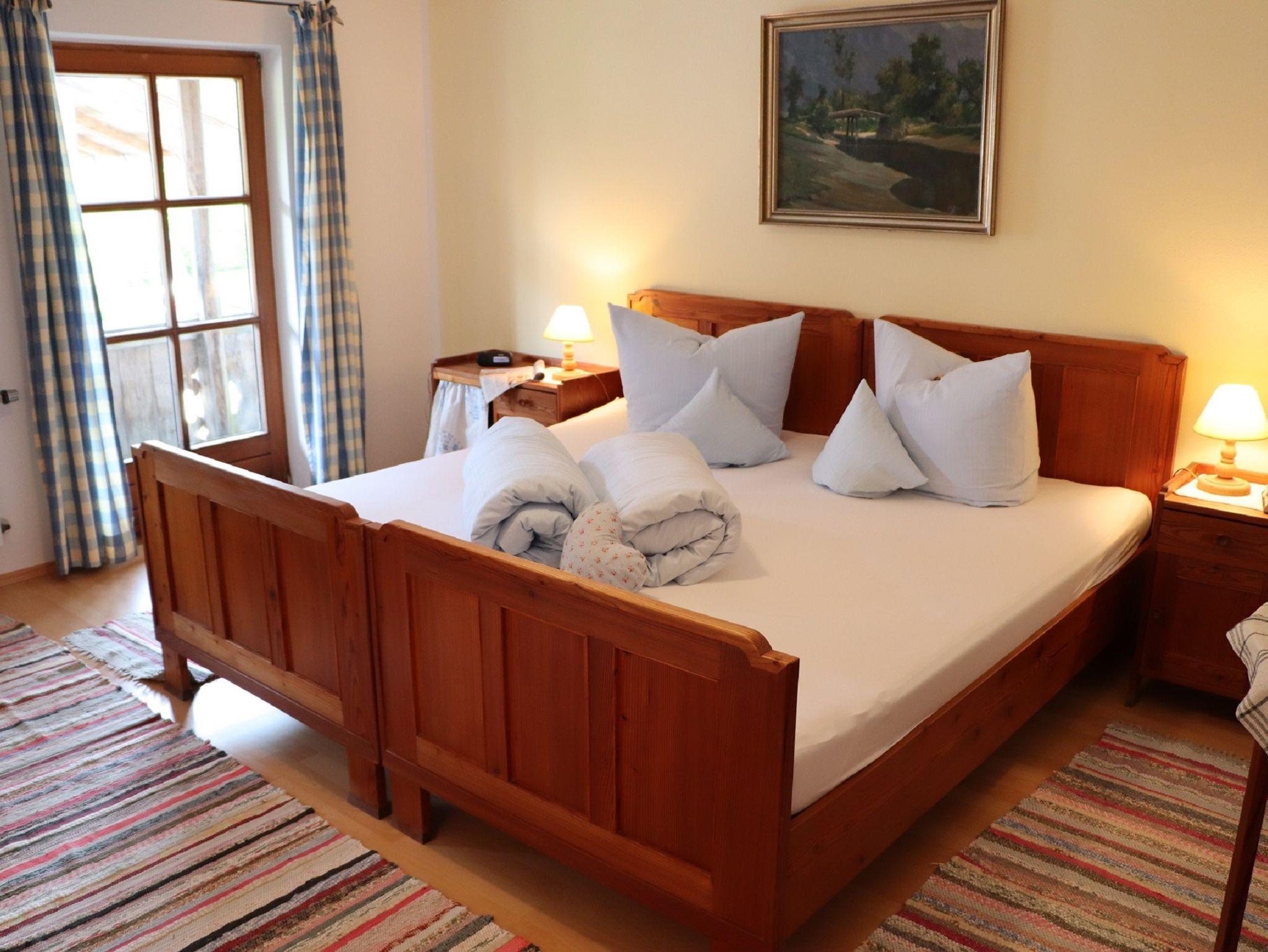 Die Ferienwohnung liegt über der Garage mit großem westseitigen Balkon mit Abendsonne. Eine gemütliche Wohnküche mit typisch bayerischer Essecke mit Eckbank, Ausziehcouch. Im separaten Schlafzimmer steht ein zusätzliches drittes Bett.