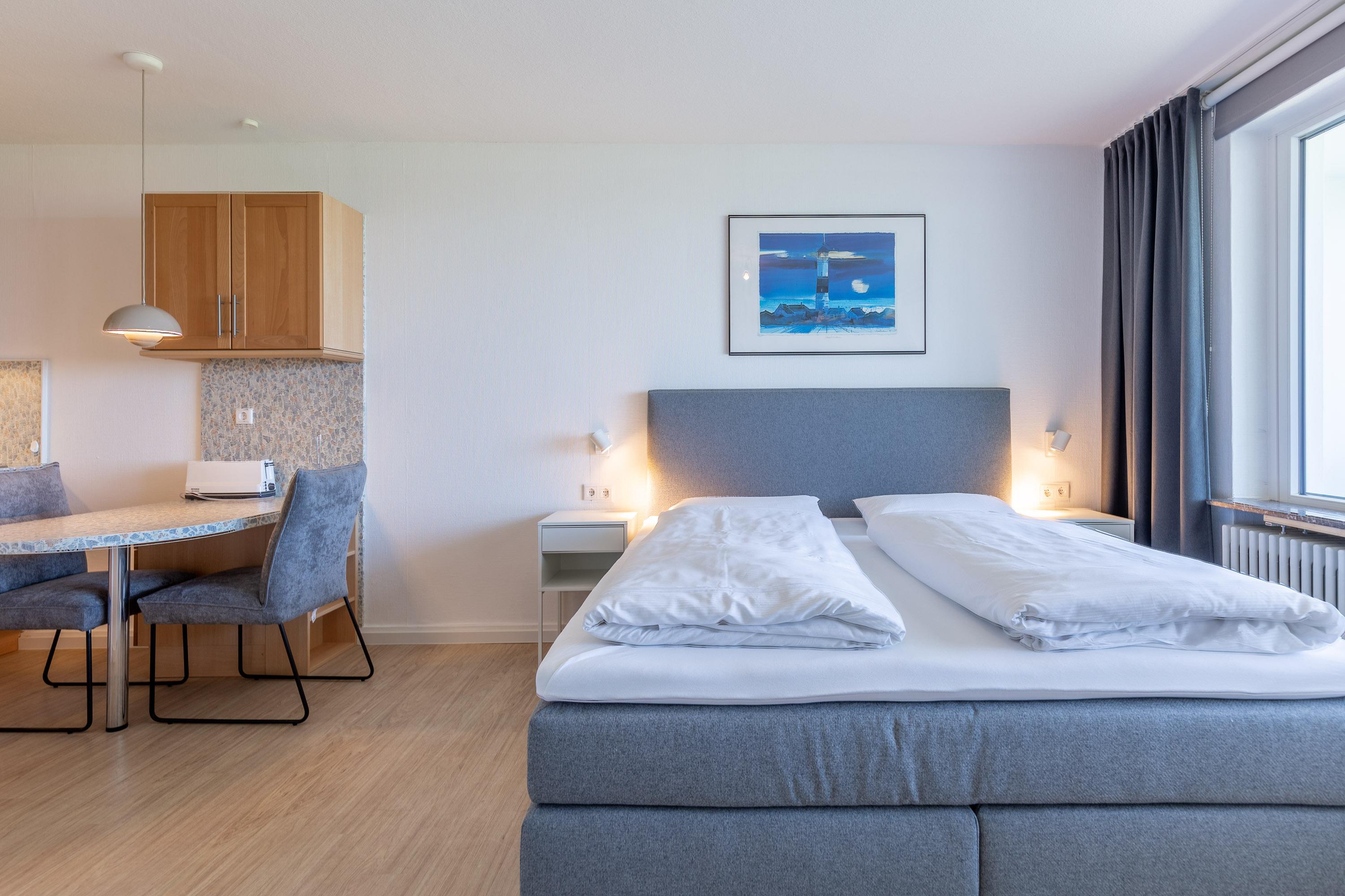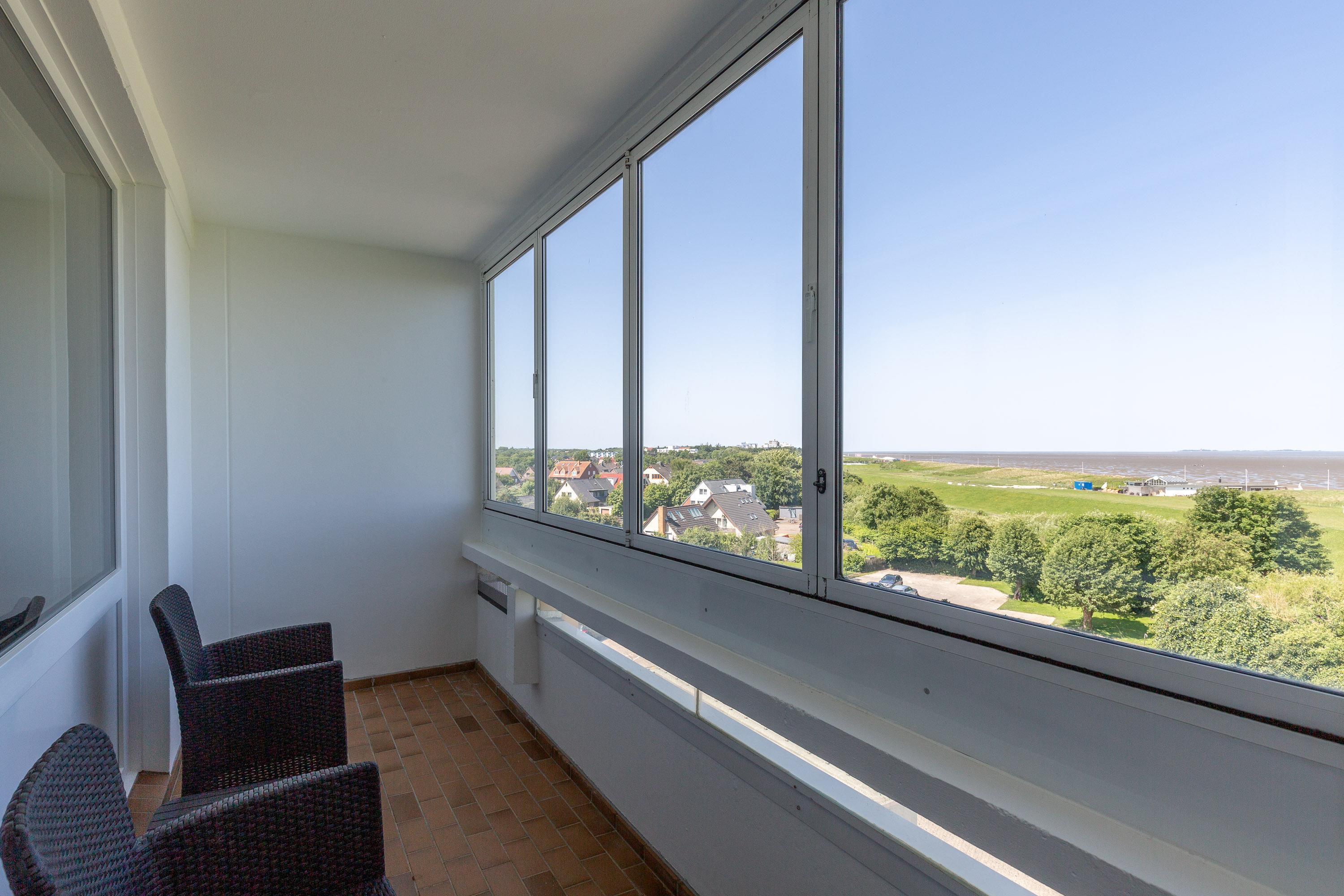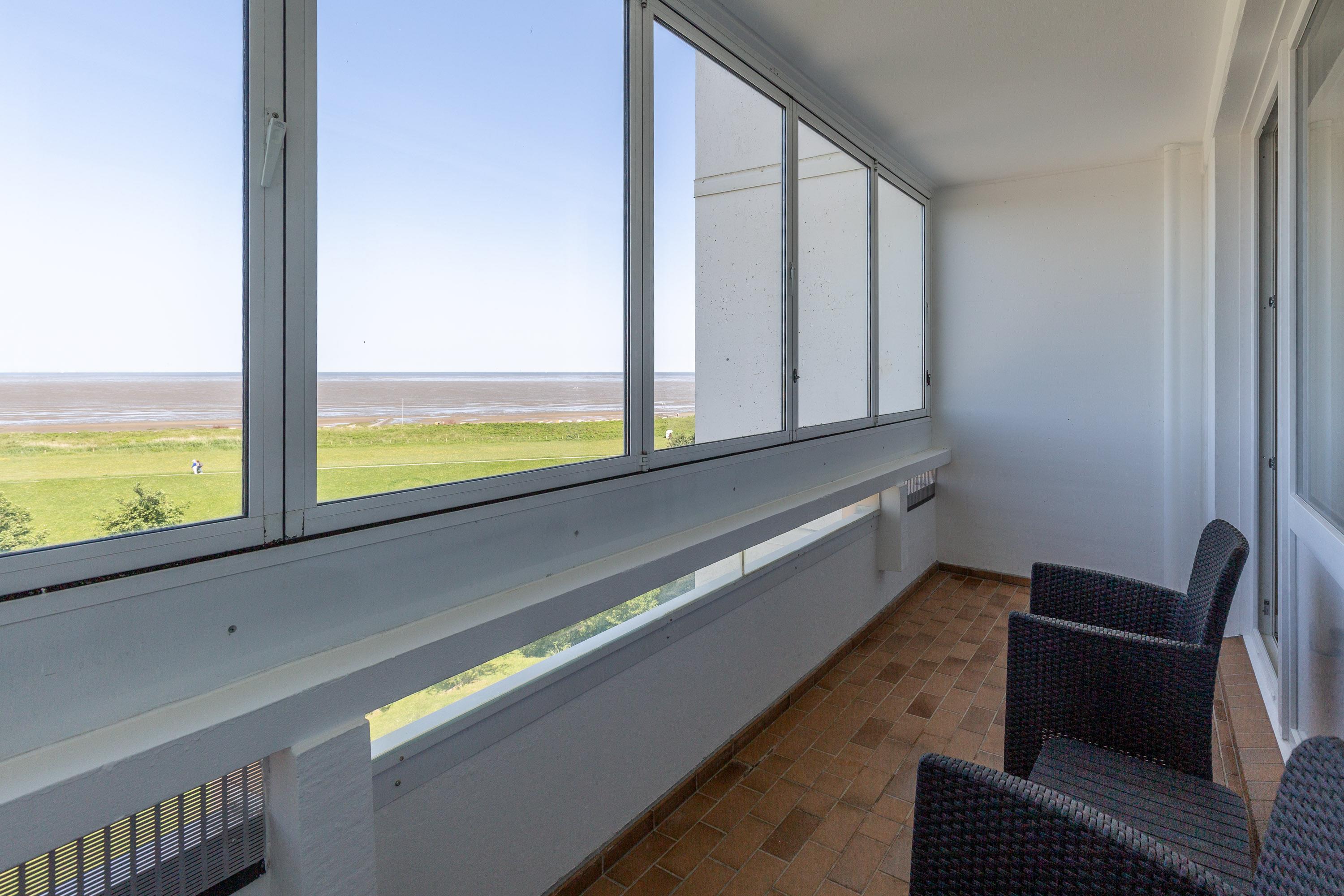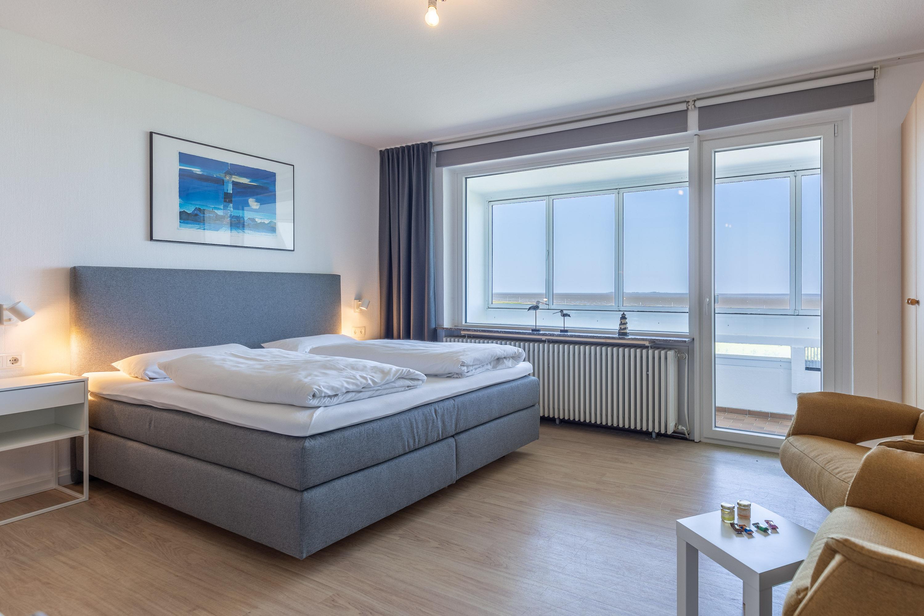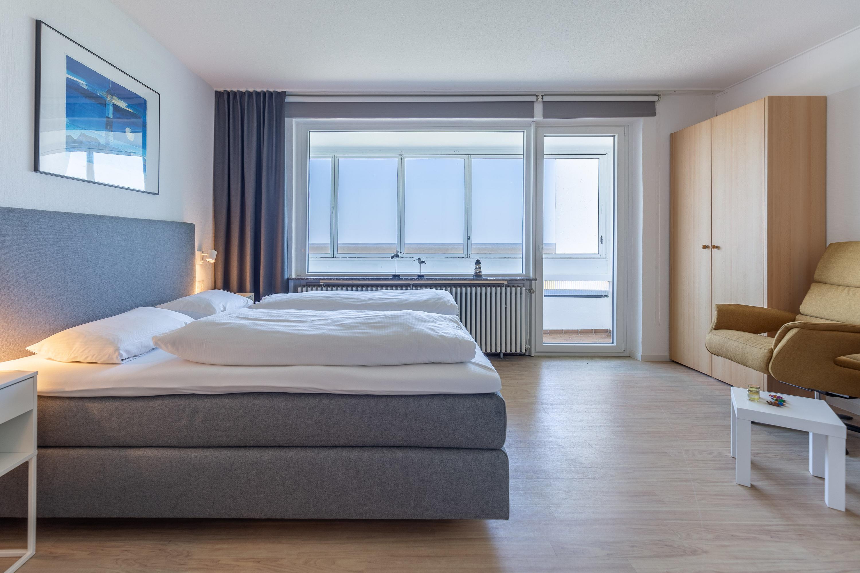 Die Wohnung bietet ausreichend Platz für zwei Personen. Im kombinierten Wohn- und Schlafbereich sorgt ein komfortables Doppelbett für erholsamen Schlaf. Schon beim Aufwachen genießen Sie ganz entspannt vom Bett aus den Blick auf die Nordsee, das UNESCO-Weltnaturerbe Wattenmeer und die Insel Neuwerk. Zwei gemütliche Relaxsessel im lichtdurchfluteten Wohnbereich laden zum Zurücklehnen ein. Für Unterhaltung sorgen ein Flachbildfernseher sowie kostenloses WLAN. Die integrierte Küchenzeile ist mit einem 2-Zonen-Cerankochfeld und einem Kühlschrank ausgestattet. Ideal für die Zubereitung kleiner Mahlzeiten. Auf dem möblierten Balkon können Sie jederzeit den traumhaften Ausblick aufs Meer genießen. Ein modernes Badezimmer mit Dusche und WC sowie ein eigener KFZ-Stellplatz runden das Angebot ab.