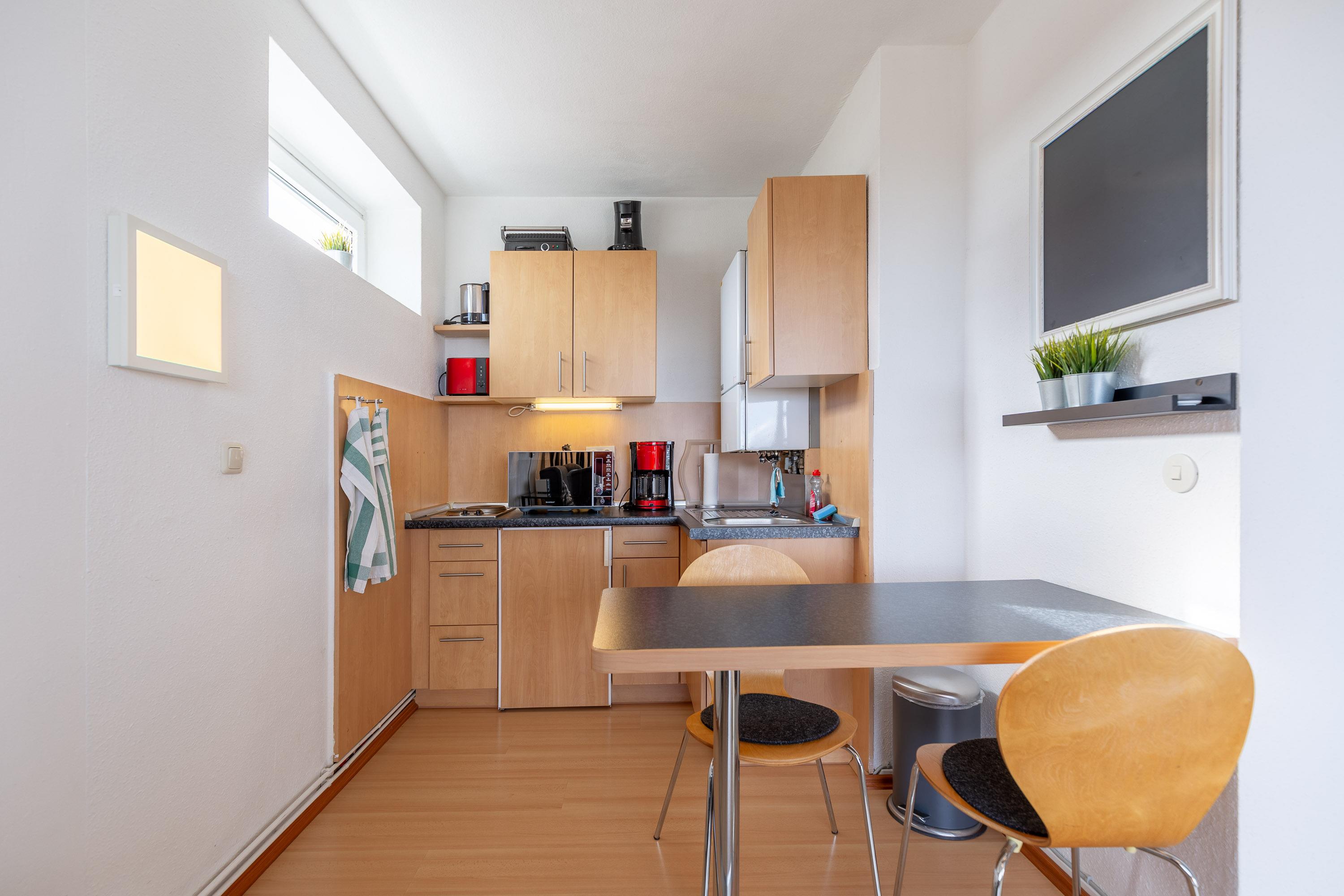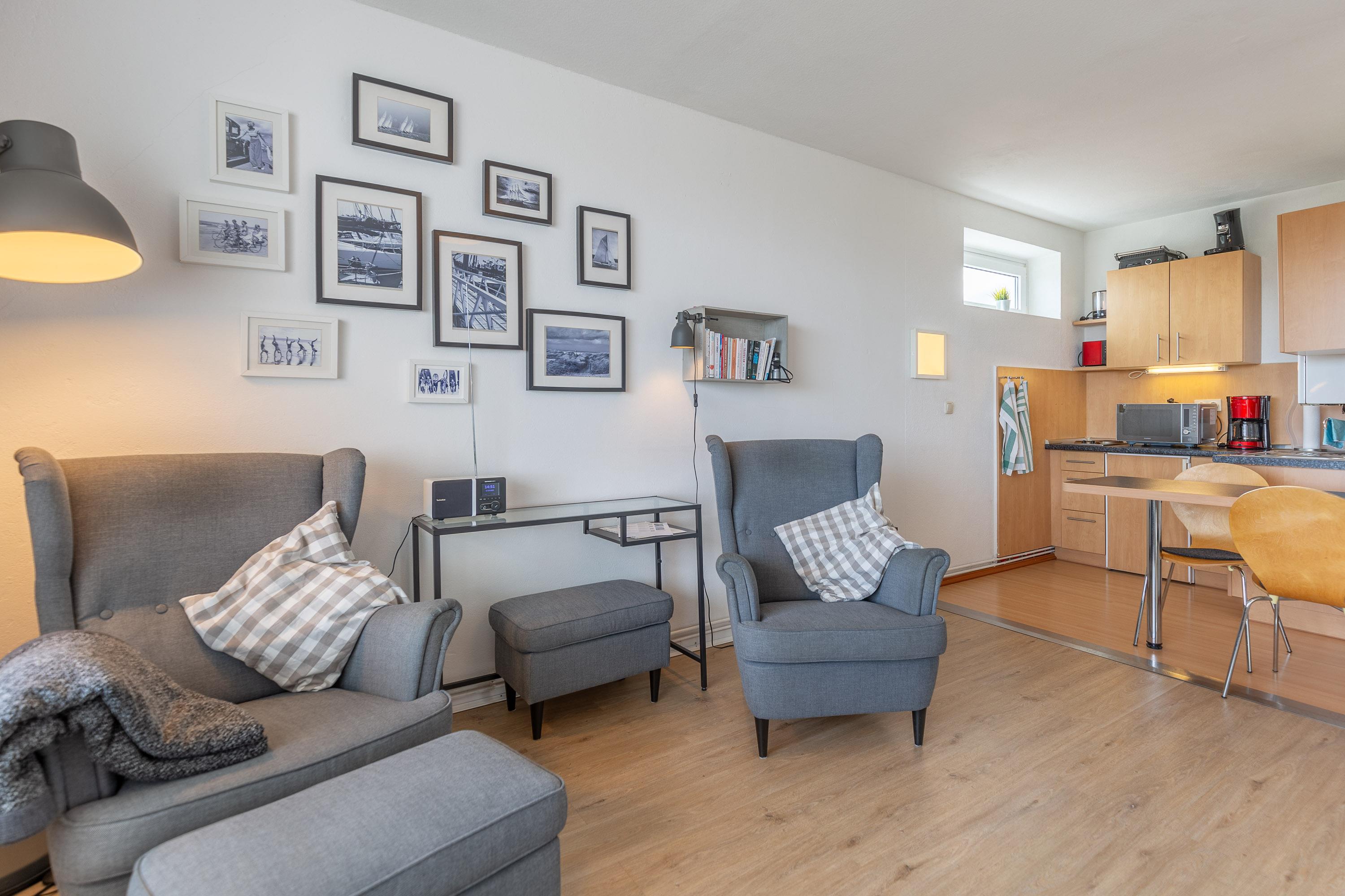 Die 32 m² Ferienwohnung bietet ausreichend Platz für 2 Personen. Der kombinierte Wohn- und Schlafbereich ist mit einem Doppelbett ausgestattet. Die beiden Relaxsessel gewährleisten, dass Sie sich entspannt zurücklehnen können, während Sie den faszinierenden Meerblick oder das Abendprogramm auf dem Flachbildfernseher genießen. Die integrierte Küche ist mit einem 2-Plattenkochfeld, einem Sandwich Toaster sowie einem Kühlschrank mit Gefrierfach ausgestattet. Ferienwohnung 612 verfügt über ein modernes Bad mit Dusche und WC. Während Ihres Urlaubs steht Ihr Auto sicher in der zugehörigen Garage.