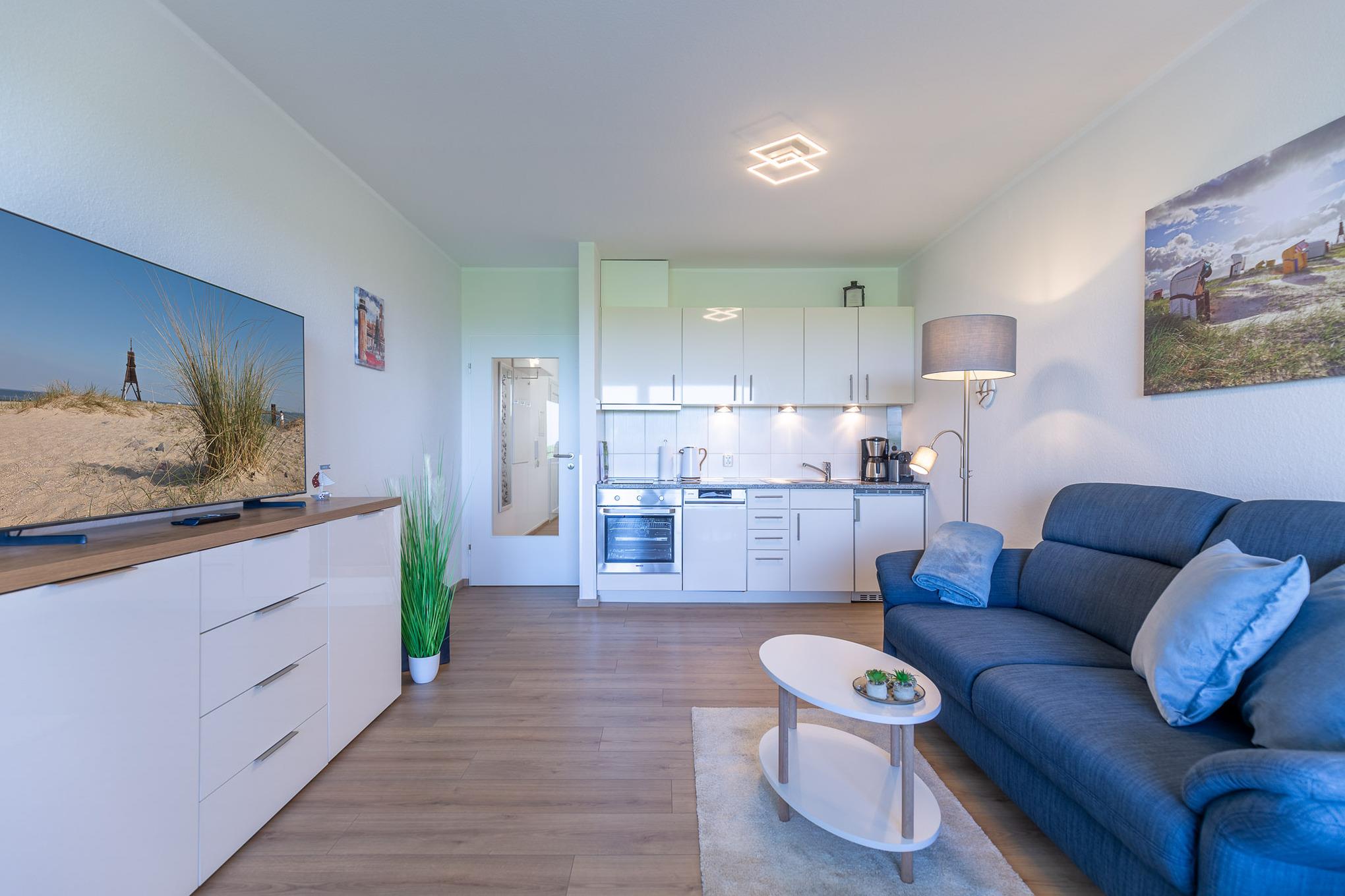 Die vollausgestattete Küchenzeile bietet neben einem 2-Zonenherd, einen Backofen und einen Geschirrspüler sowie alle Annehmlichkeiten, die Sie in Ihrem Urlaub erwarten. Ein Smart-TV und kostenloses WLAN sorgen für beste Unterhaltung. Ein komfortables Doppelbett im Schlafzimmer gewährleistet, dass Sie sich auch im Schlaf erholen. Auch vom möblierten Balkon genießen Sie den traumhaften Meerblick. Die Wohnung verfügt über ein modernes Bad mit ebenerdiger Dusche.