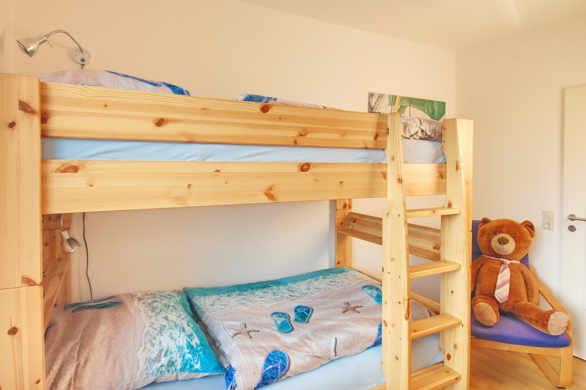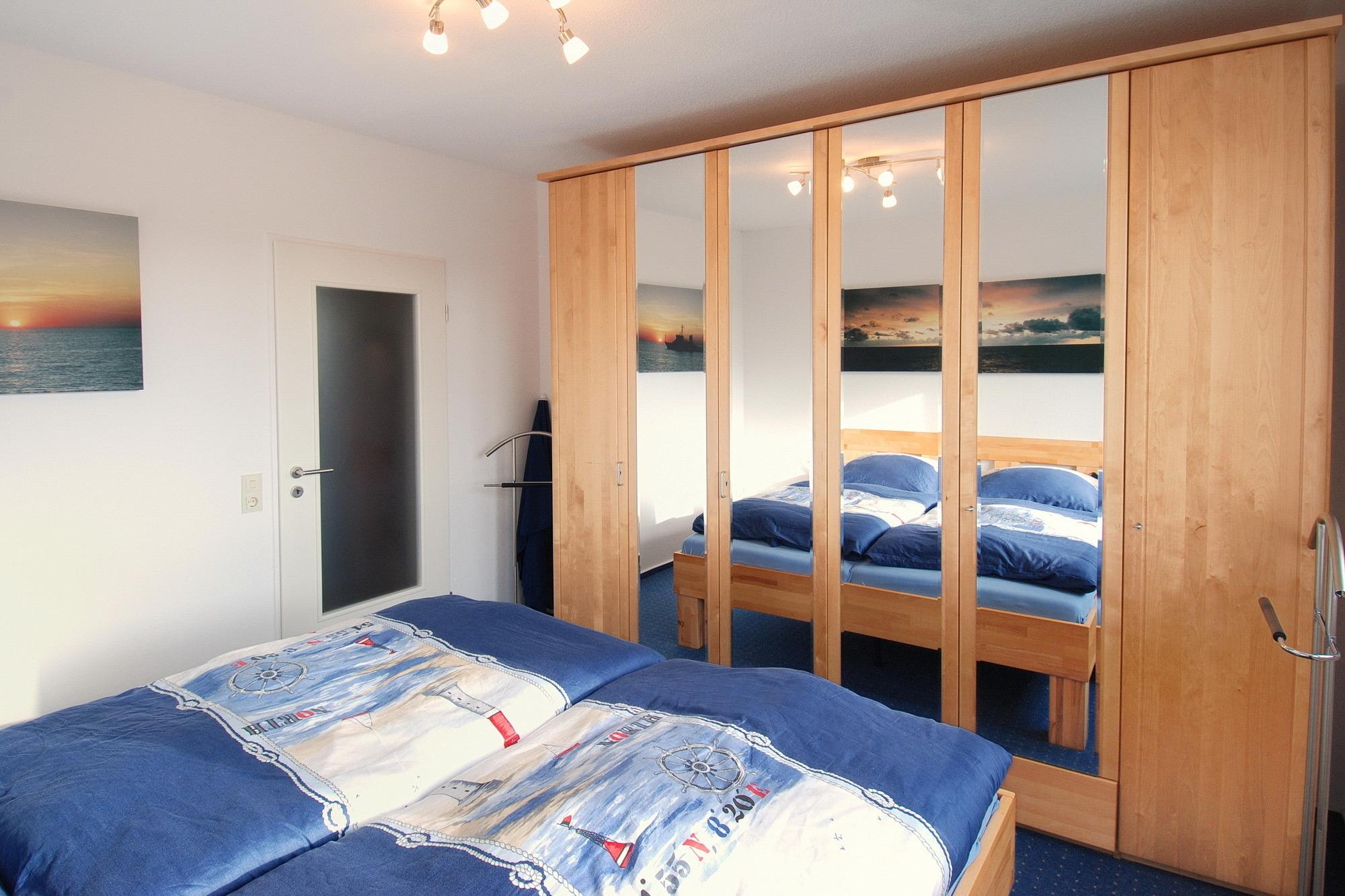 Die separate Küche ist mit einem Backofen, einem Ceranfeld mit 4-Kochstellen, einem Geschirrspüler, einer Mikrowelle, einer Kaffeemaschine, sowie einem Kühlschrank mit Gefrierfach ausgestattet. Das erste Schlafzimmer verfügt über ein komfortables Doppelbett in Überlänge und Komforthöhe (2x90x220). Das zweite Schlafzimmer ist mit einem Etagenbett (2x90x200) ausgestattet. Die separaten Schlafzimmer gewährleisten einen erholsamen Schlaf. Neben einem modernen Bad mit WC und Dusche verfügt Ferienwohnung Grimmershörn 31 über ein zusätzliches Gäste-WC.