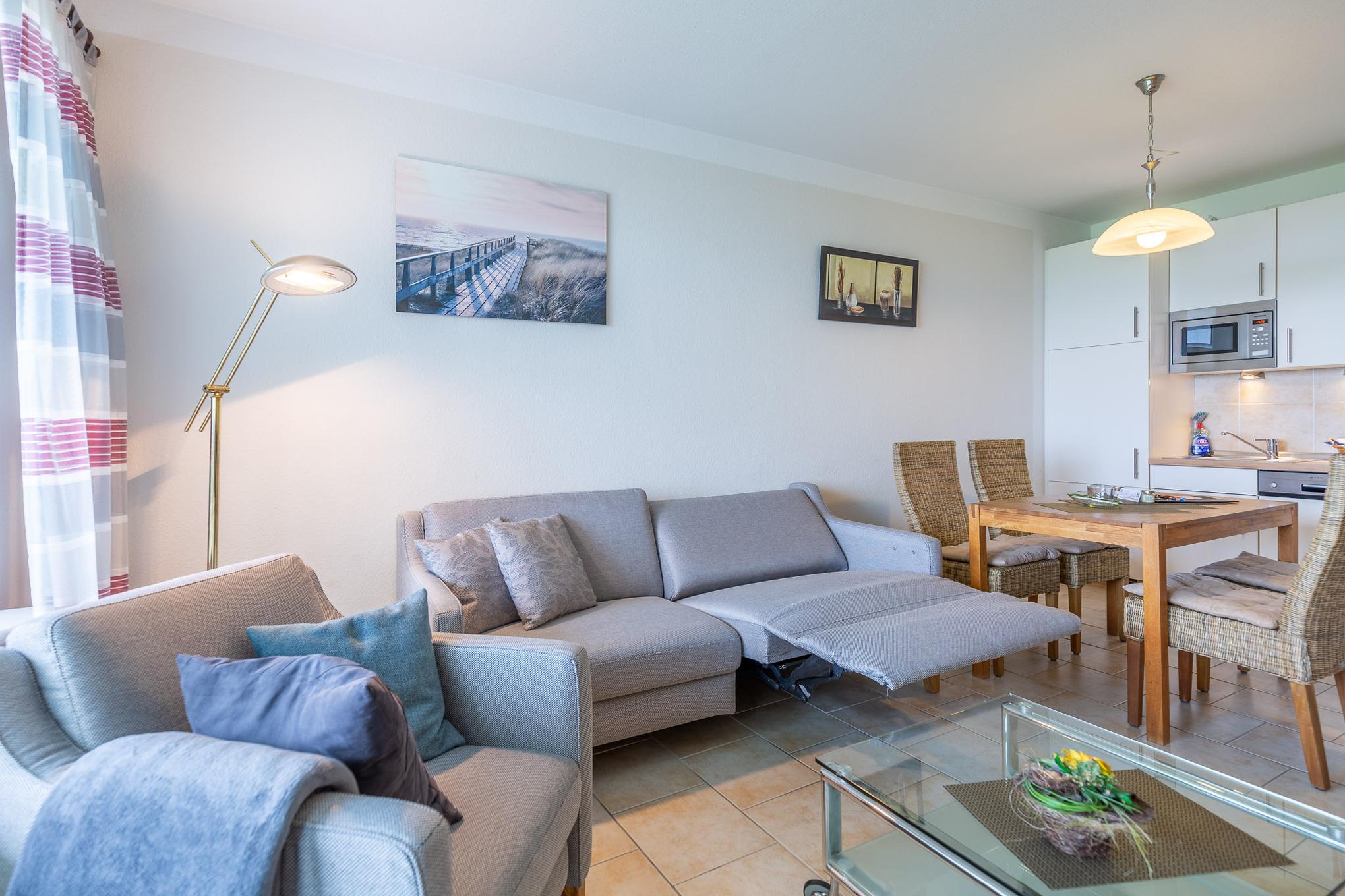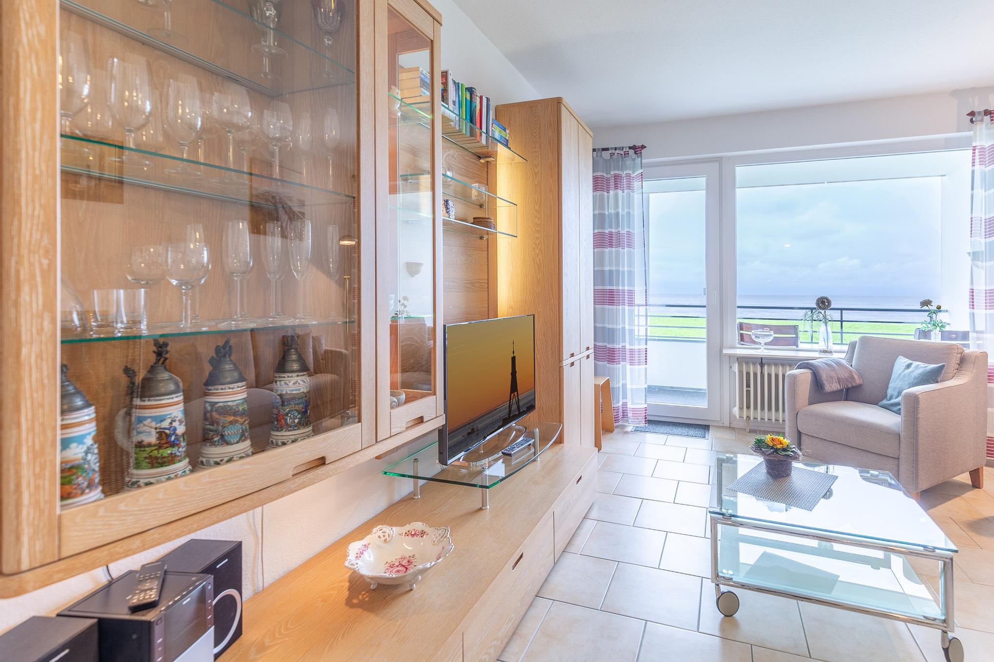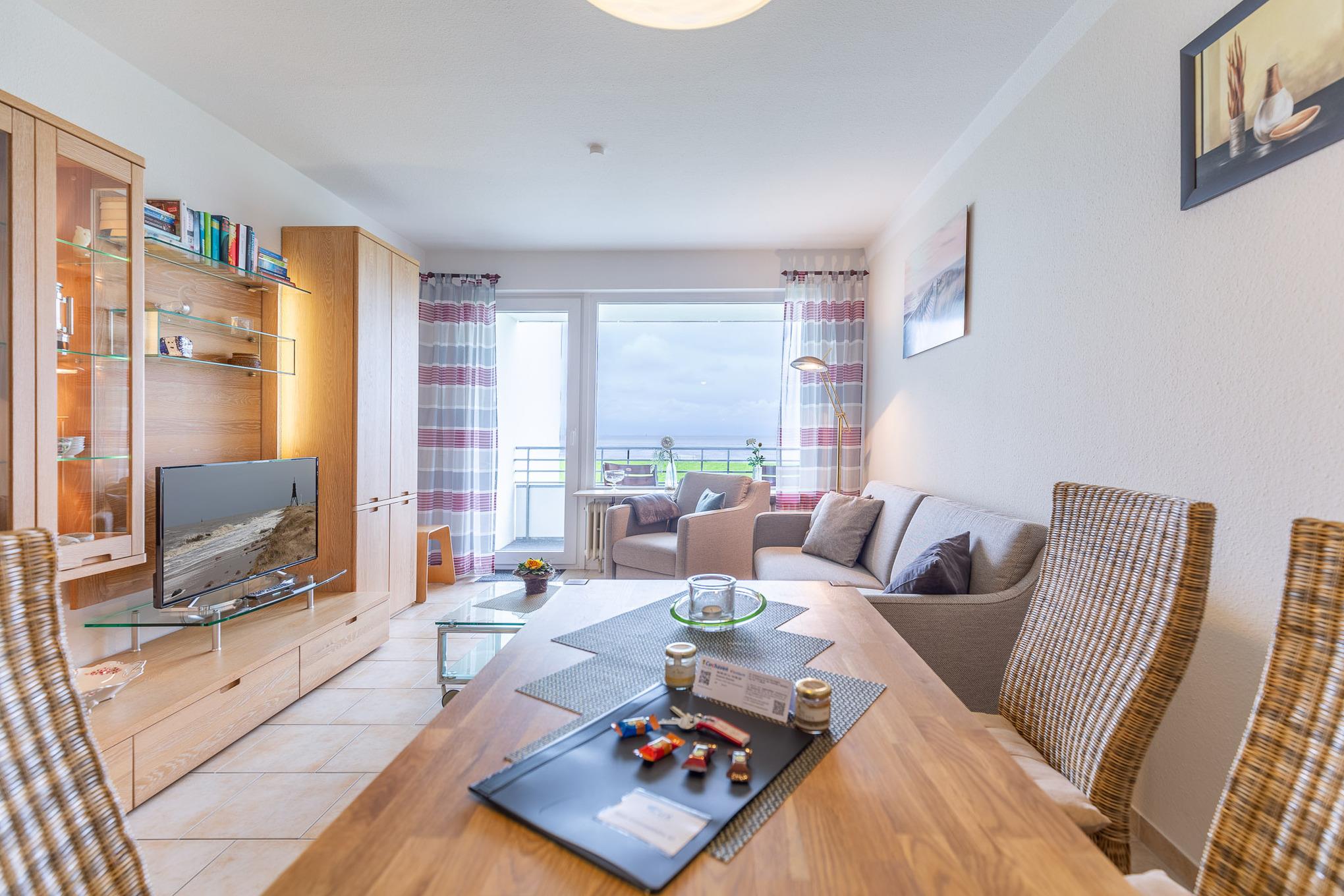 Der Flachbildfernseher im Wohnbereich gewährleistet, dass Sie auch im Urlaub nicht auf Ihre Lieblingsserie verzichten müssen. Darüber hinaus bietet der kombinierte Wohn- und Essbereich eine Küchenzeile mit Geschirrspüler, 2-Plattenherd, Kaffeemaschine, Mikrowelle, Wasserkocher und weiteren Küchenutensilien. Des Weiteren verfügt Ferienwohnung Nordseeluft über ein separates Schlafzimmer mit zwei Einzelbetten. Das separate Schlafzimmer mit Verdunklungsmöglichkeit garantiert einen geruhsamen Schlaf. Im Wohnbereich lädt ein Sofa und Sessel zu einem gemütlichem Verweilen ein. Das moderne sowie seniorengerechte Bad ist mit einer ebenerdigen Dusche ausgestattet. Zudem können Sie auf dem Balkon die frische Nordseeluft spüren, den Ausblick genießen und die Zeit vergessen.