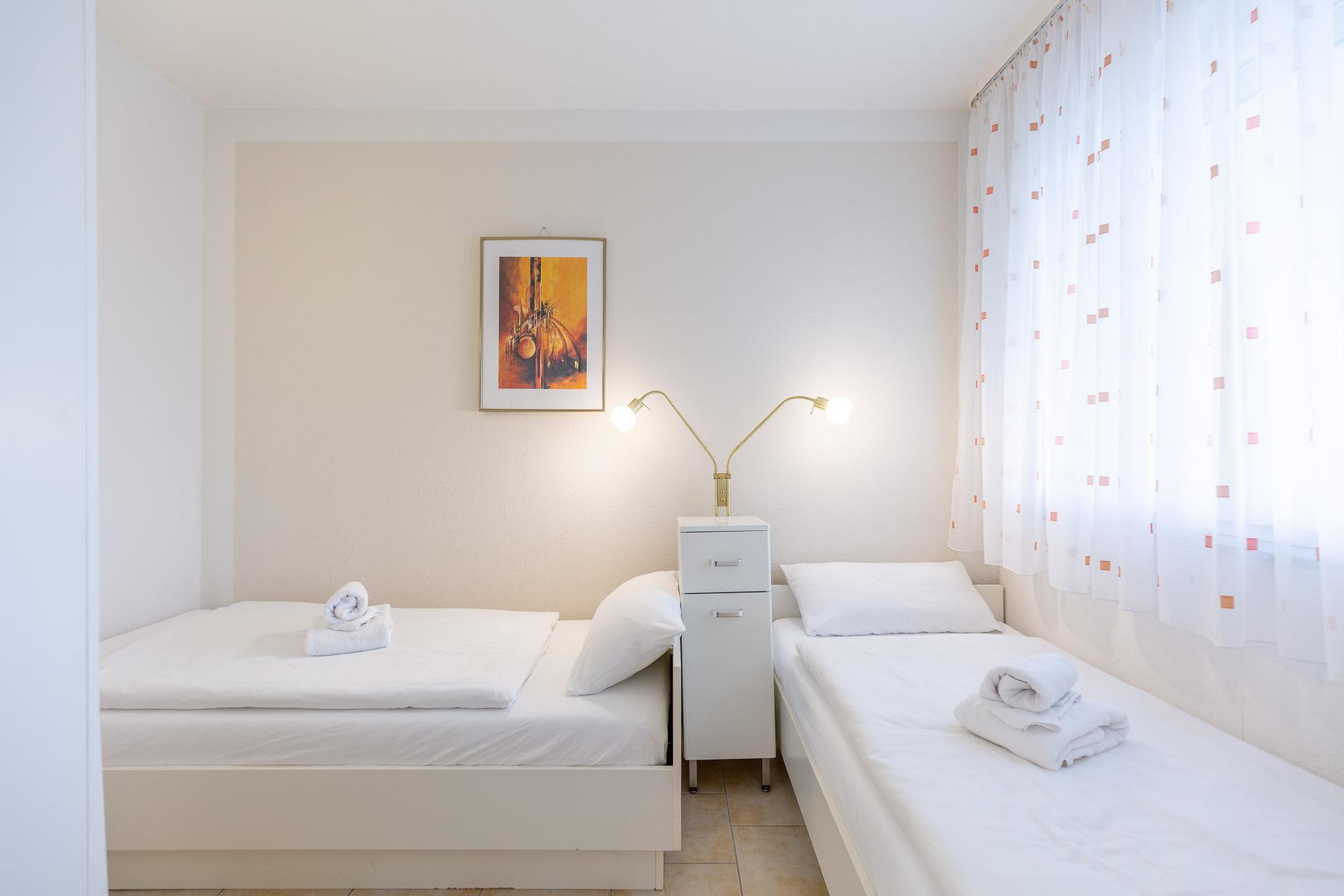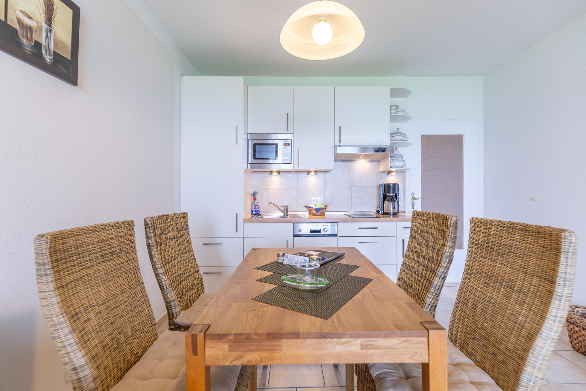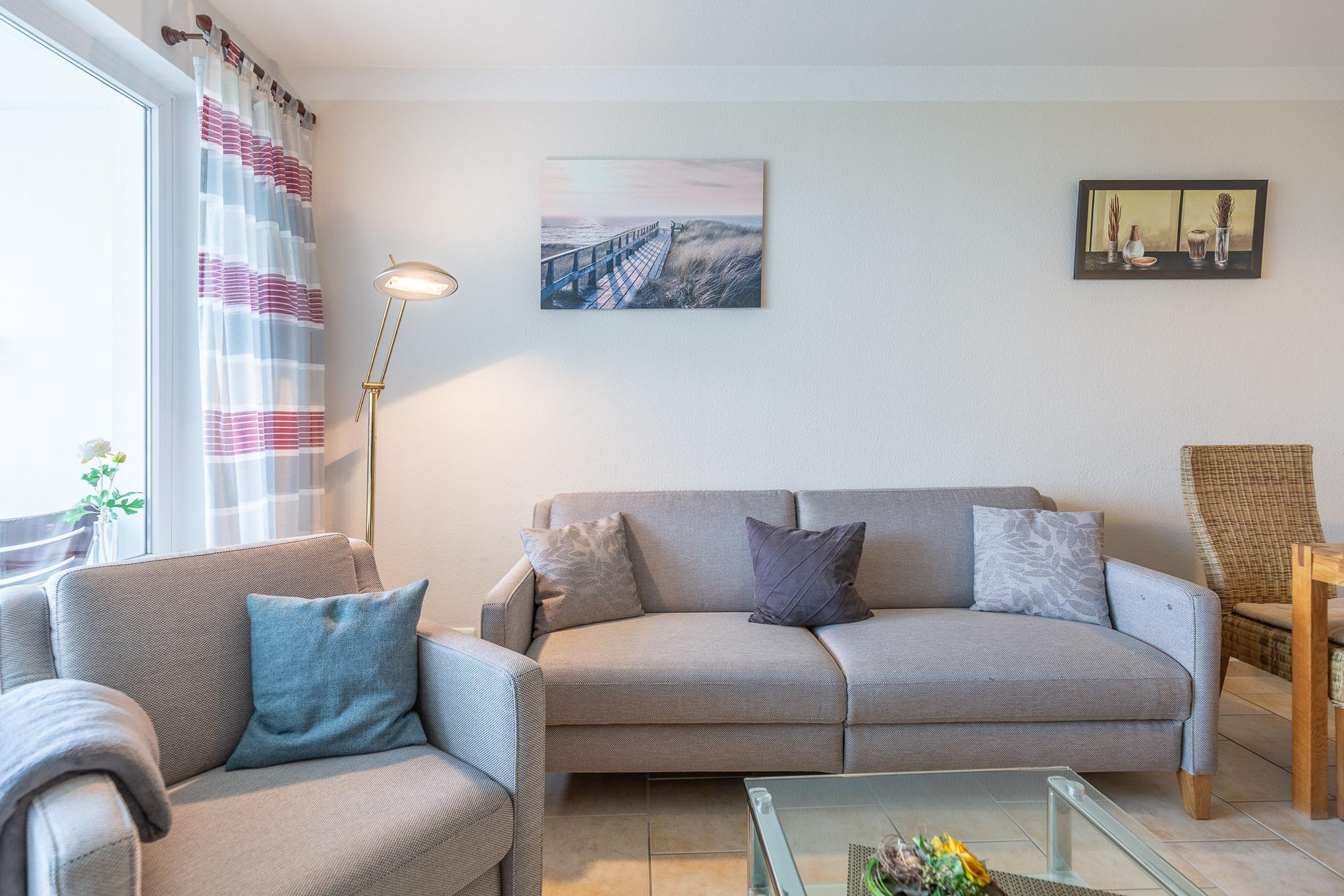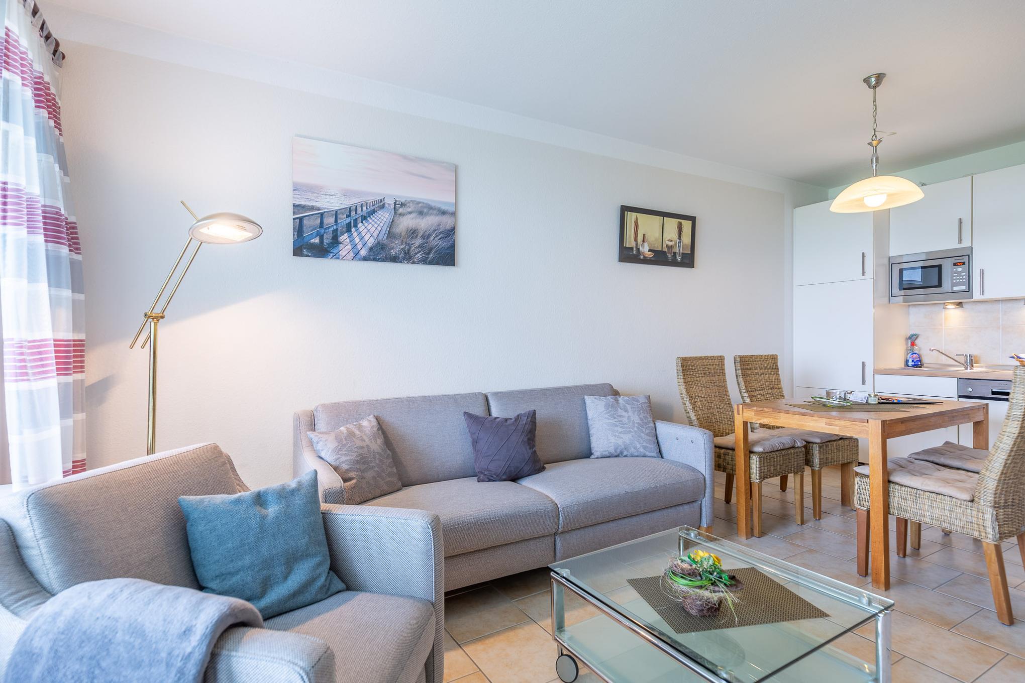 Der Flachbildfernseher im Wohnbereich gewährleistet, dass Sie auch im Urlaub nicht auf Ihre Lieblingsserie verzichten müssen. Darüber hinaus bietet der kombinierte Wohn- und Essbereich eine Küchenzeile mit Geschirrspüler, 2-Plattenherd, Kaffeemaschine, Mikrowelle, Wasserkocher und weiteren Küchenutensilien. Des Weiteren verfügt Ferienwohnung Nordseeluft über ein separates Schlafzimmer mit zwei Einzelbetten. Das separate Schlafzimmer mit Verdunklungsmöglichkeit garantiert einen geruhsamen Schlaf. Im Wohnbereich lädt ein Sofa und Sessel zu einem gemütlichem Verweilen ein. Das moderne sowie seniorengerechte Bad ist mit einer ebenerdigen Dusche ausgestattet. Zudem können Sie auf dem Balkon die frische Nordseeluft spüren, den Ausblick genießen und die Zeit vergessen.
