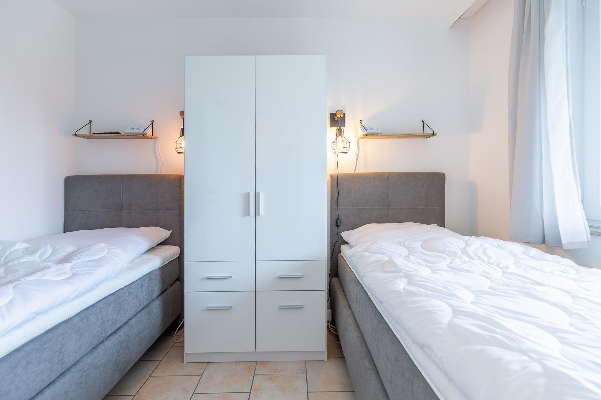 Der Flachbildfernseher im Wohnbereich gewährleistet, dass Sie auch im Urlaub nicht auf Ihre Lieblingsserie verzichten müssen. Die Küchenzeile ist mit einem Geschirrspüler, 2-Plattenherd, Kühlschrank und allen notwendigen Küchenutensilien ausgestattet. Ein separates Schlafzimmer mit komfortablen Betten gewährleistet einen erholsamen Schlaf. Elektrische Außenjalousien sorgen dafür, dass Sie nicht von der Morgensonne geweckt werden. Das Bad ist mit Dusche und WC ausgestattet. Zudem können Sie auf dem Balkon die frische Nordseeluft spüren, den Ausblick genießen und die Zeit vergessen. Zur Ferienwohnung gehört eine Garage (2,06 m Höhe, 2,20 m Breite (Garagentor) und ca. 5,00 m Länge).