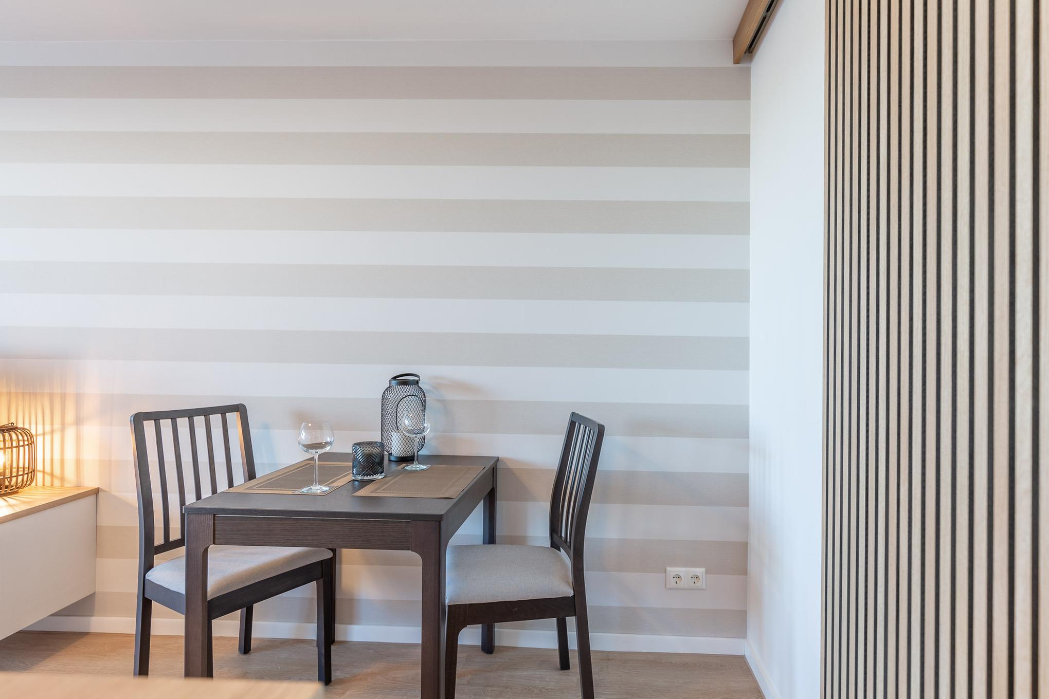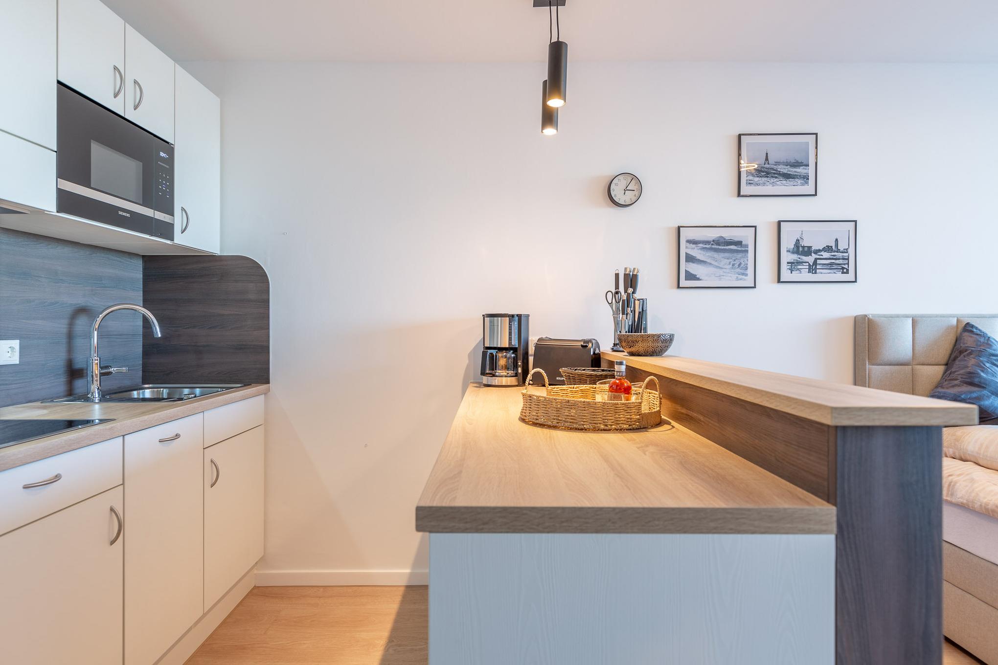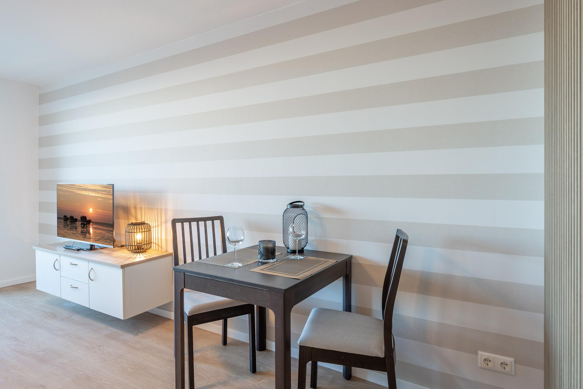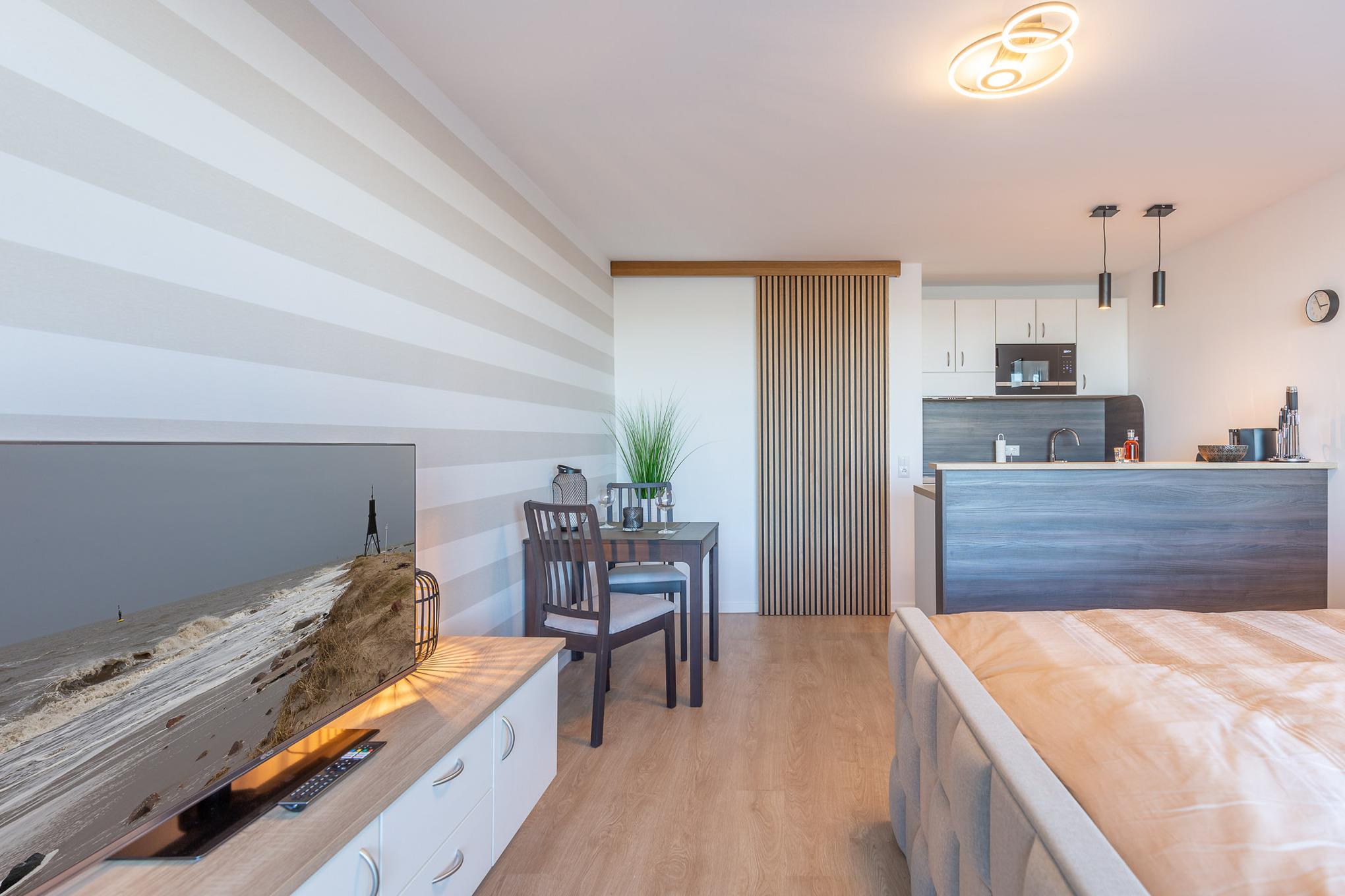 Klein, aber fein! Die 35 m² Ferienwohnung ist schlicht, modern, handfest – mit allem, was es für einen erholsamen Urlaub braucht. Nicht mehr und nicht weniger. Gediegene Farben treffen auf klares Design und warme Holztöne. Und mittendrin: Da steht ein gemütliches Doppelbett in Komfortliegehöhe mit Wohlfühlfaktor und Blick auf den Deich. Ein Smart TV sorgt dafür, dass Sie auch im Urlaub nicht auf Ihre Lieblingsserie verzichten müssen. Dank kostenlosem WLAN können Sie Urlaubsfotos direkt mit Freunden teilen.
