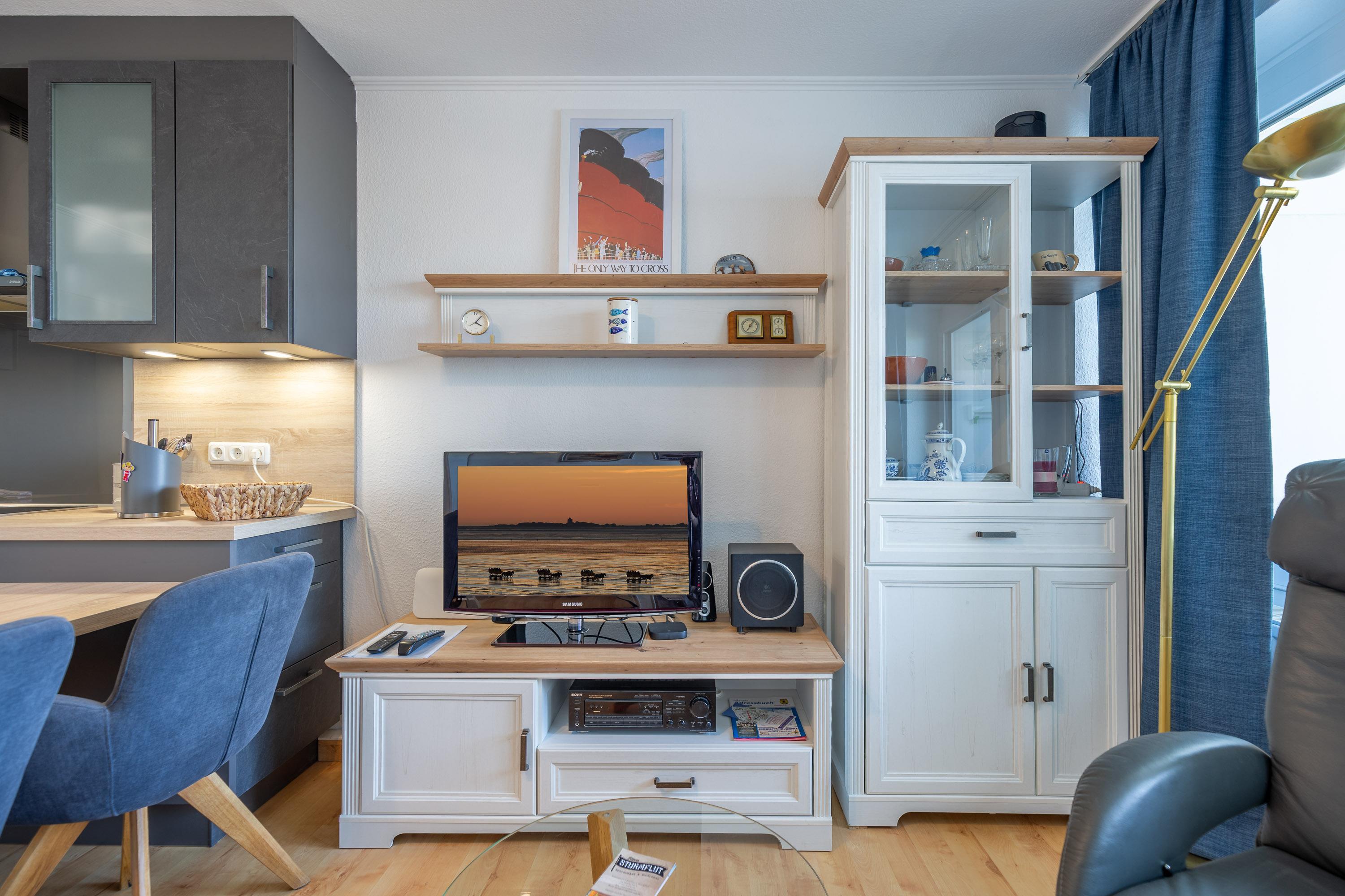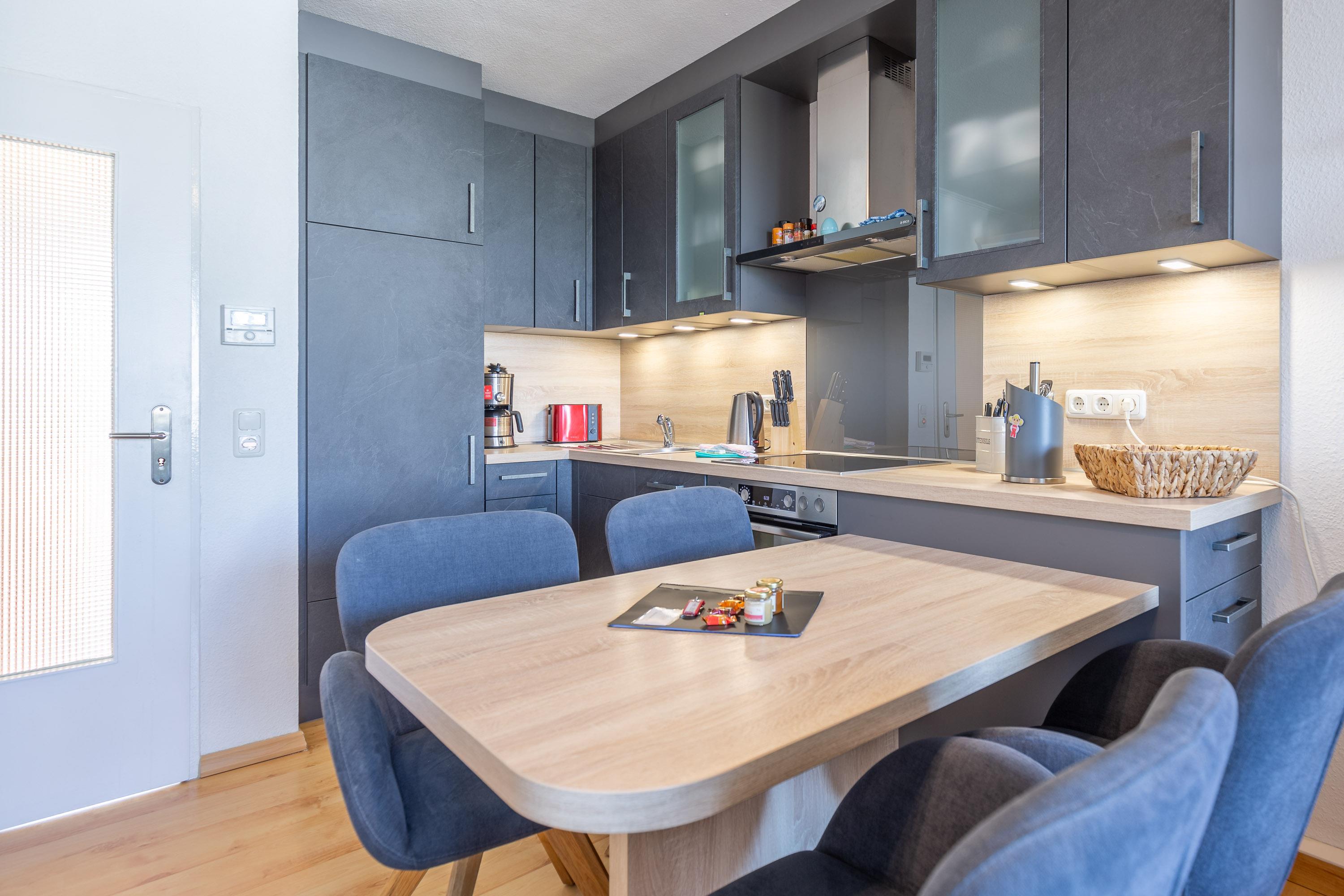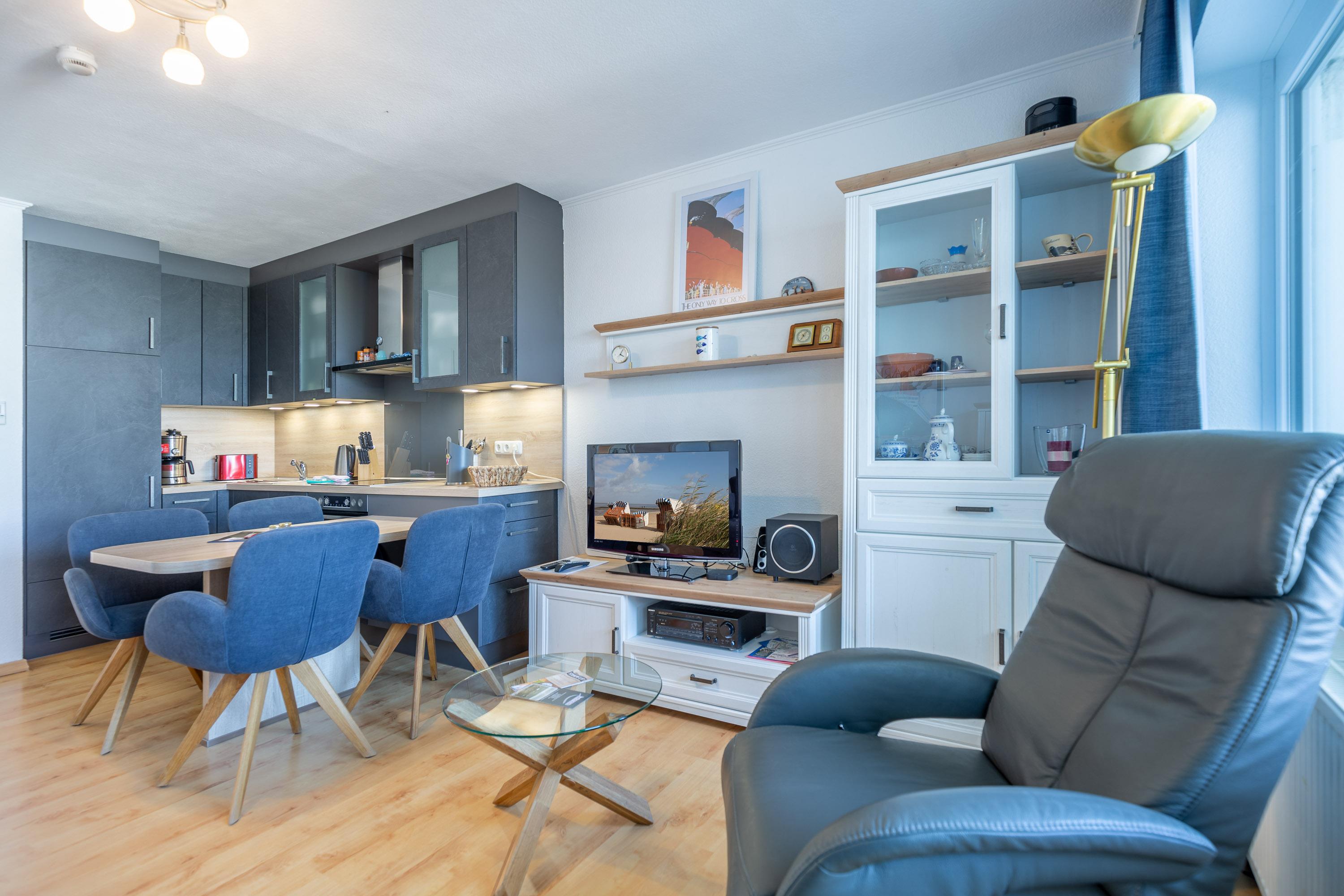 Die großzügige Küche ist vollständig mit Backofen, Geschirrspüler sowie Kühlschrank mit Gefrierfach ausgestattet und lässt für Selbstversorger keine Wünsche offen. Ein LCD-Fernseher gewährleistet, dass Sie im Urlaub nicht auf Ihre Lieblingsserie verzichten müssen. Ferienwohnung Nautic 205 ist mit elektrischen Außenjalousien ausgestattet, sodass Sie nicht von der Morgensonne geweckt werden. Der kombinierte Wohn- und Schlafbereich ist mit einem Schlafsofa ausgestattet. Ein Einzelbett im Vorraum ermöglicht getrenntes Schlafen.