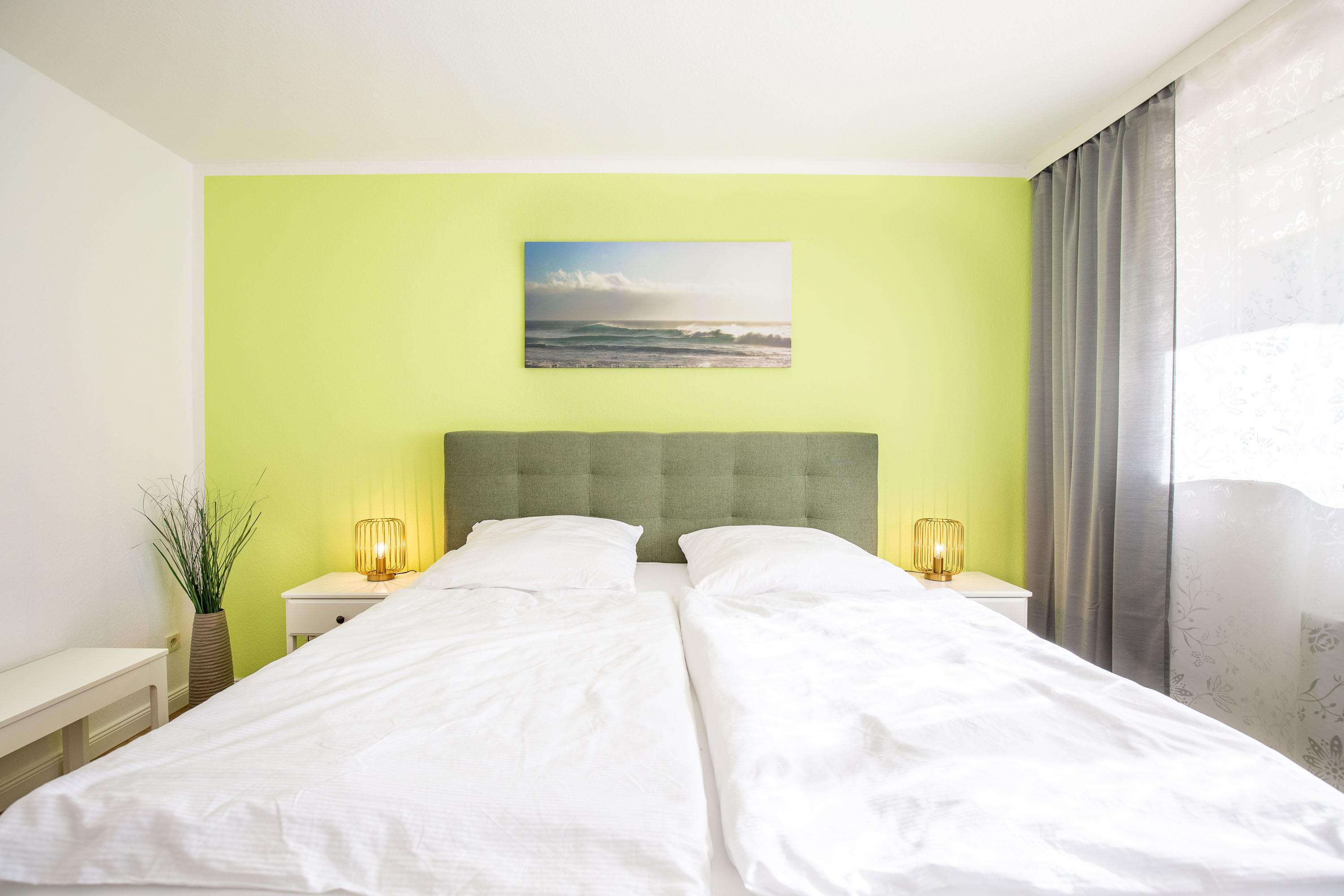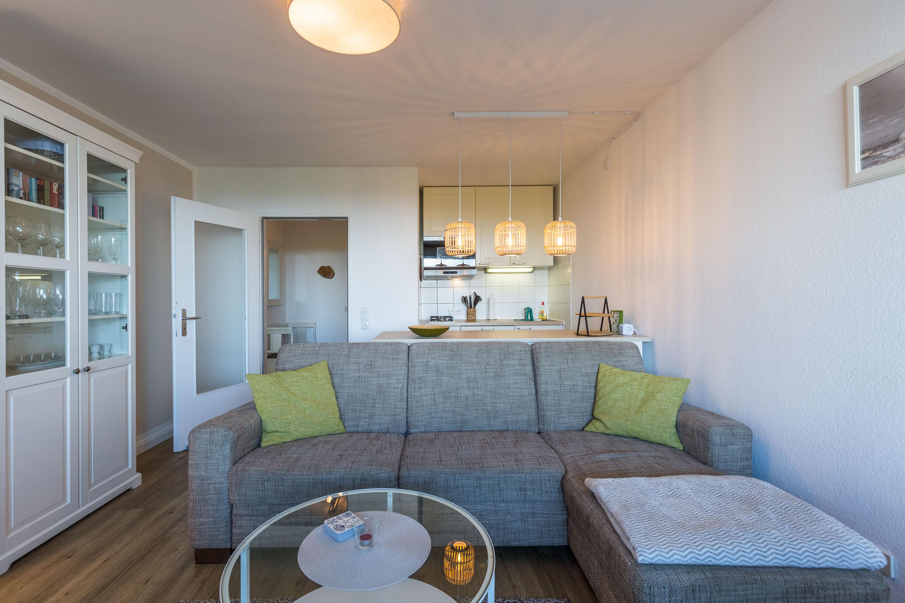 Ferienwohnung 210 verfügt über ein separates Schlafzimmer mit modernem Boxspringbett sowie ein Fenster zum Belüften. Der LCD Fernseher im Wohnbereich sorgt auch an trüben Tagen für beste Unterhaltung. Eine kleine, komplett ausgestattete Küchenzeile ist im Wohnbereich integriert. Das modern sanierte Bad mit Dusche und WC verfügt über ein Fenster zum Belüften. Der Wohnung ist ein PKW-Stellplatz zugeordnet.
