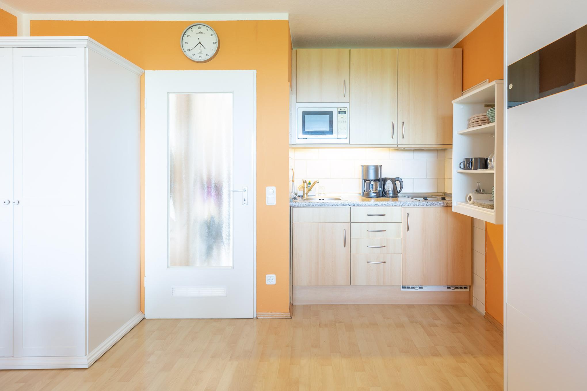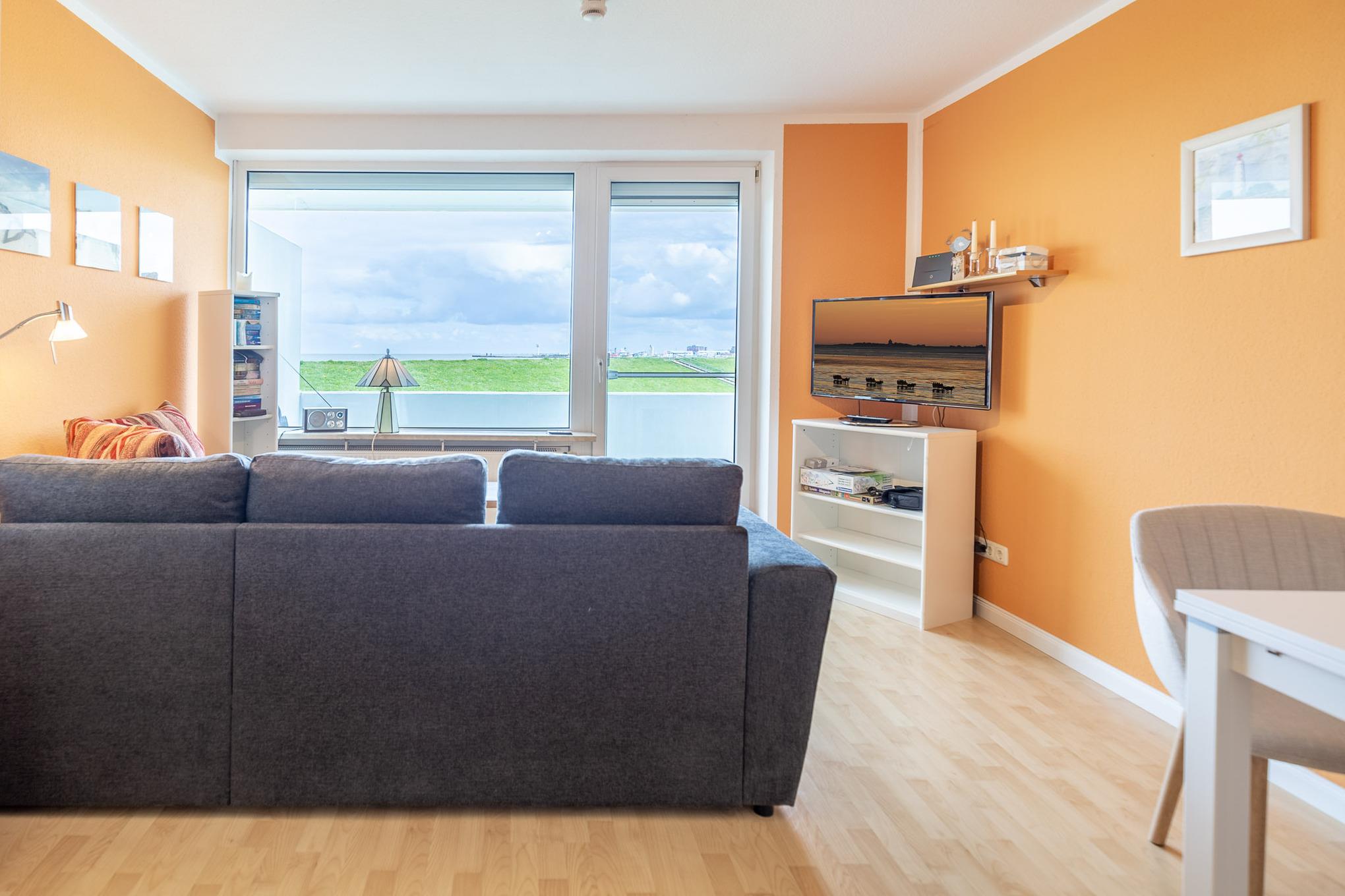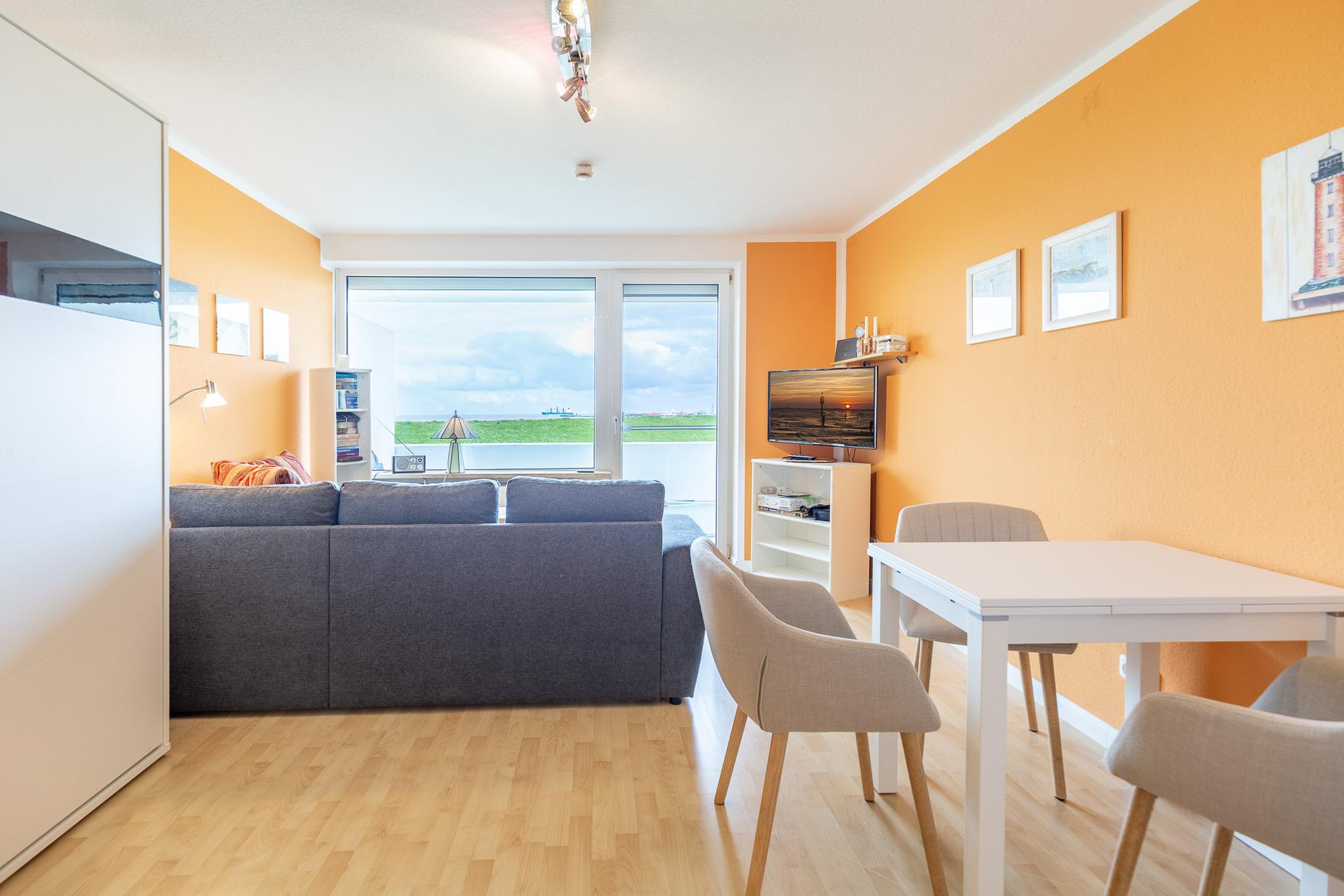 Entspannen und erholen bei wunderbarem Elbblick. Egal ob Sie am Esstisch oder auf dem komfortablen Ecksofa sitzen - immer genießen Sie den Blick auf den Weltschifffahrtsweg, den Hafen und die Grimmershörnbucht. Darüber hinaus sorgt ein LCD Fernseher dafür, dass Sie auch im Urlaub nicht auf Ihre Lieblingsserie verzichten müssen. Eine Küchenzeile mit 2-Zonen-Cerankochfeld, Kühlschrank mit Gefrierfach und einer Mikrowelle ist im Wohnbereich integriert.