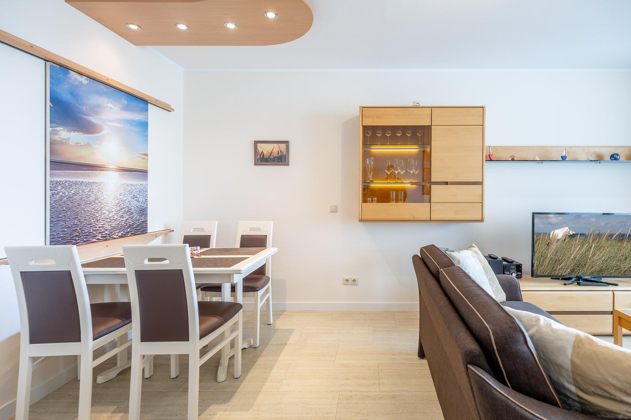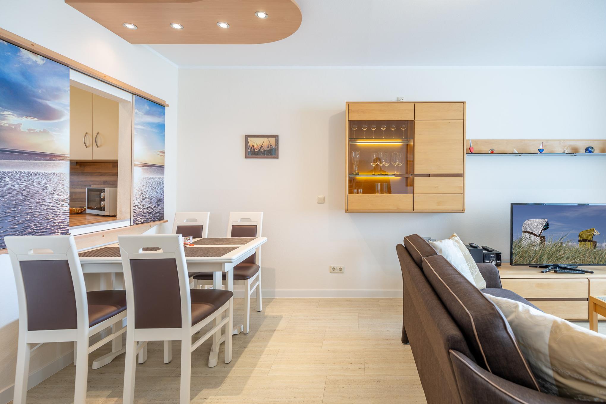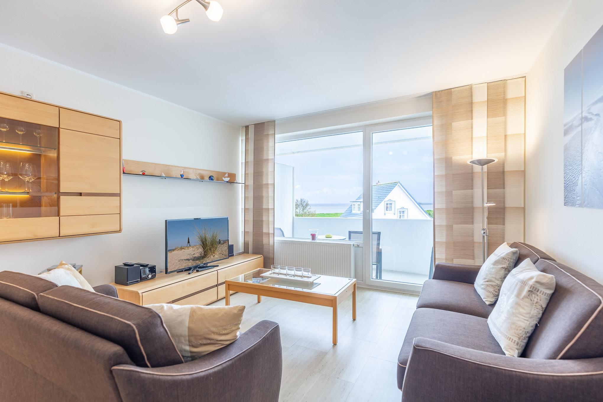 Mit 2 separaten Schlafzimmern, einer separaten Küche, einem modernen Bad, einem Wohn-/Esszimmer mit Meerblick und einem Balkon bietet die großzügige Ferienwohnung auf 70 m² genügend Platz für 2 bis 4 Personen. In der voll ausgestatteten Küche mit Durchreiche, Backofen und Geschirrspüler finden Sie jeglichen Komfort, den Sie in Ihrem Urlaub erwarten.