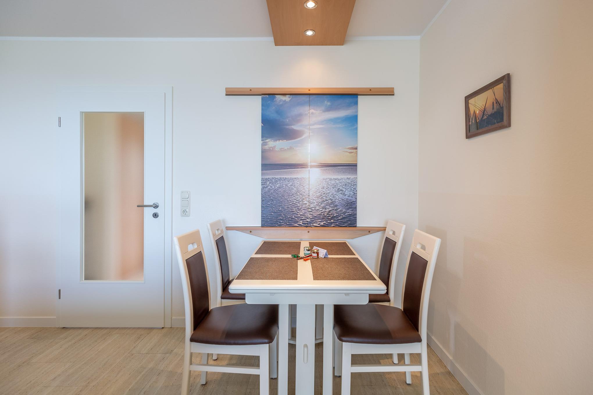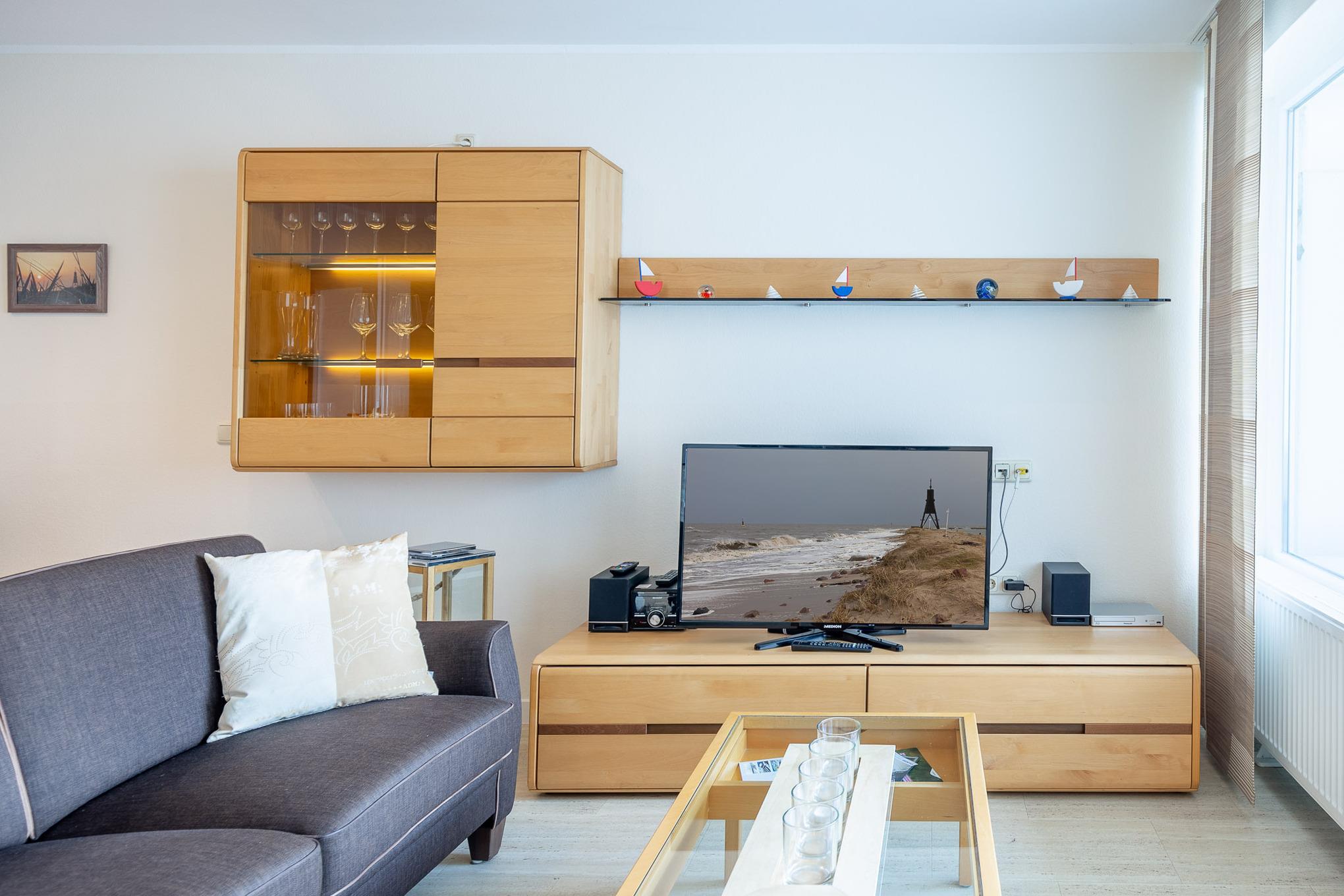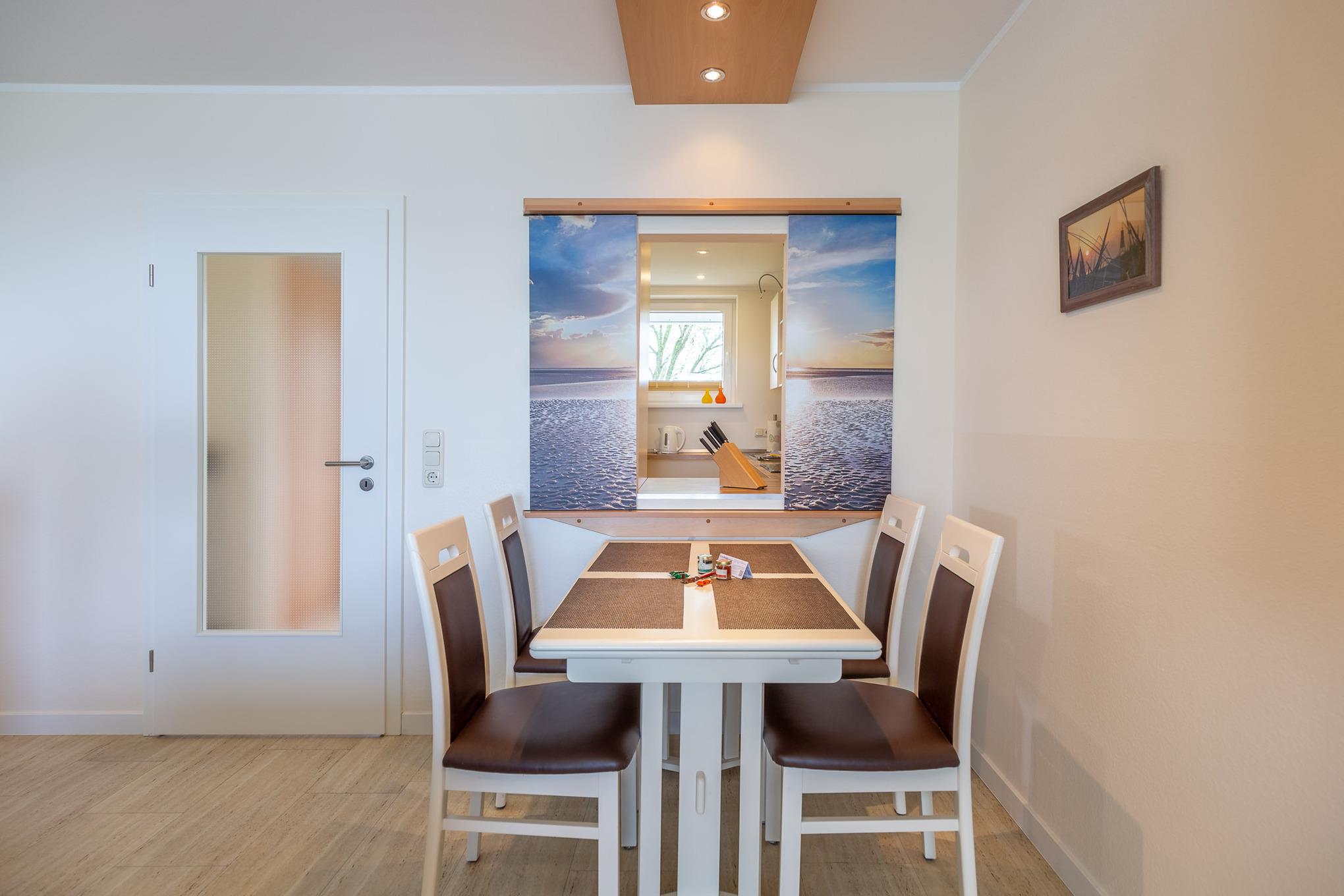 Mit 2 separaten Schlafzimmern, einer separaten Küche, einem modernen Bad, einem Wohn-/Esszimmer mit Meerblick und einem Balkon bietet die großzügige Ferienwohnung auf 70 m² genügend Platz für 2 bis 4 Personen. In der voll ausgestatteten Küche mit Durchreiche, Backofen und Geschirrspüler finden Sie jeglichen Komfort, den Sie in Ihrem Urlaub erwarten.