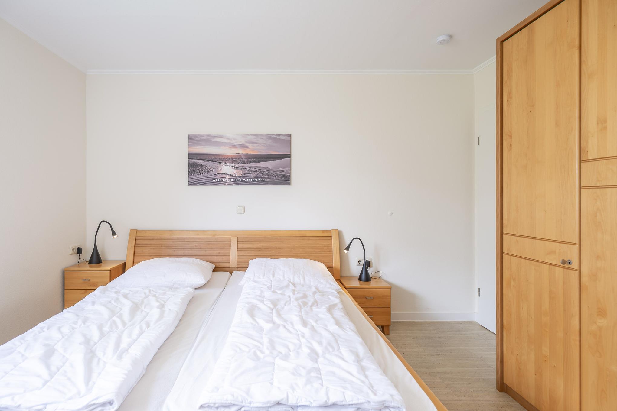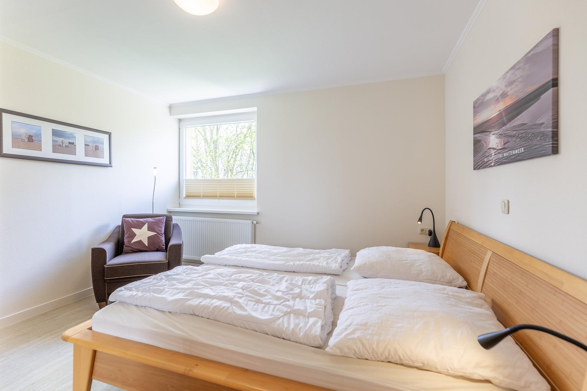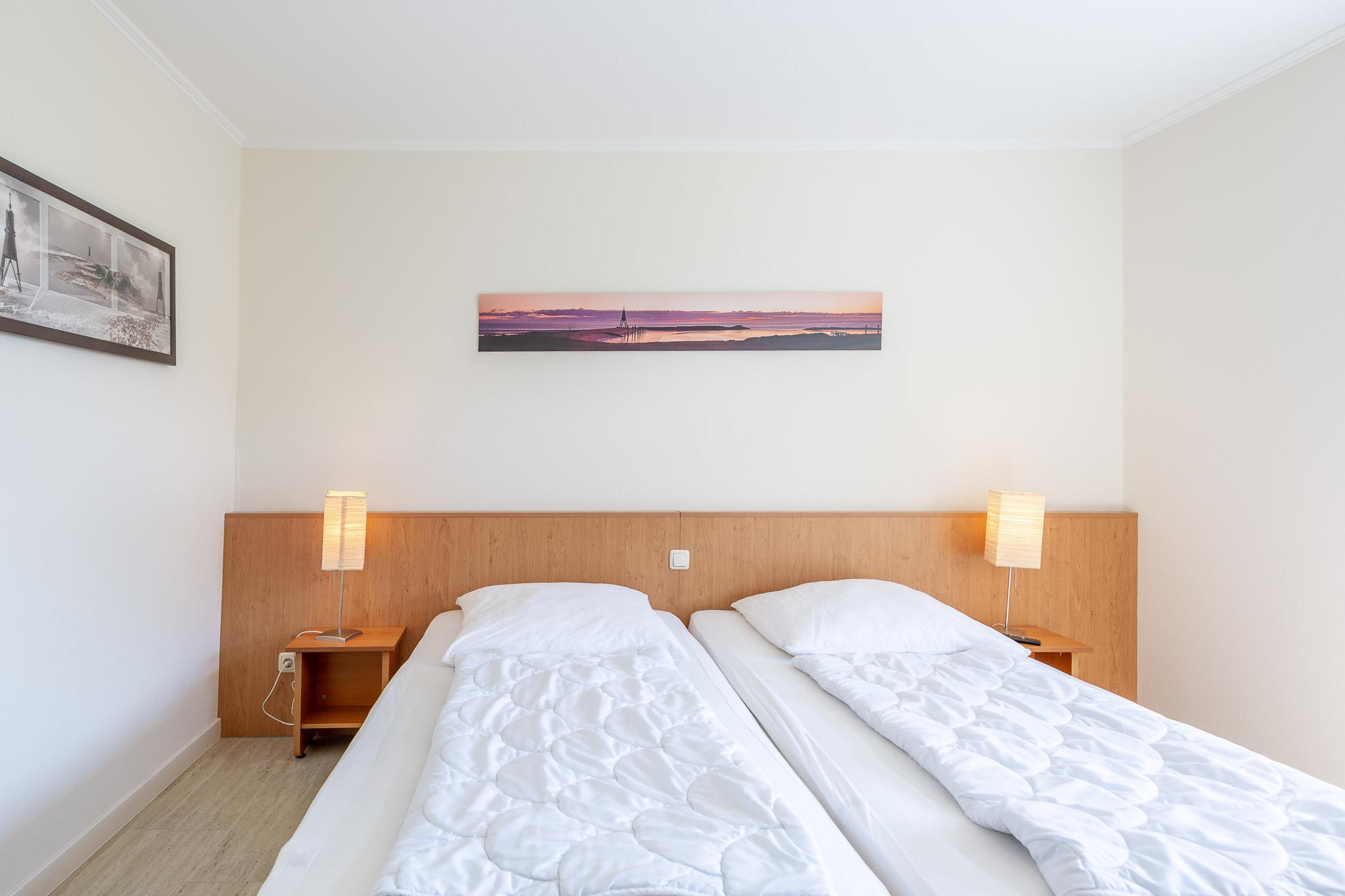 In den separaten Schlafzimmern sorgen ein großes Boxspringbett (2x100x210) und ein komfortables Kingsizebett (2x90x200) für einen erholsamen Schlaf. Darüber hinaus gehört ein modernes Bad mit flachem Duscheinstieg zum Standard dieser Ferienwohnung. Auch vom Balkon genießen Sie den schönen Meerblick. Zur Wohnung gehört ein KFZ-Stellplatz.