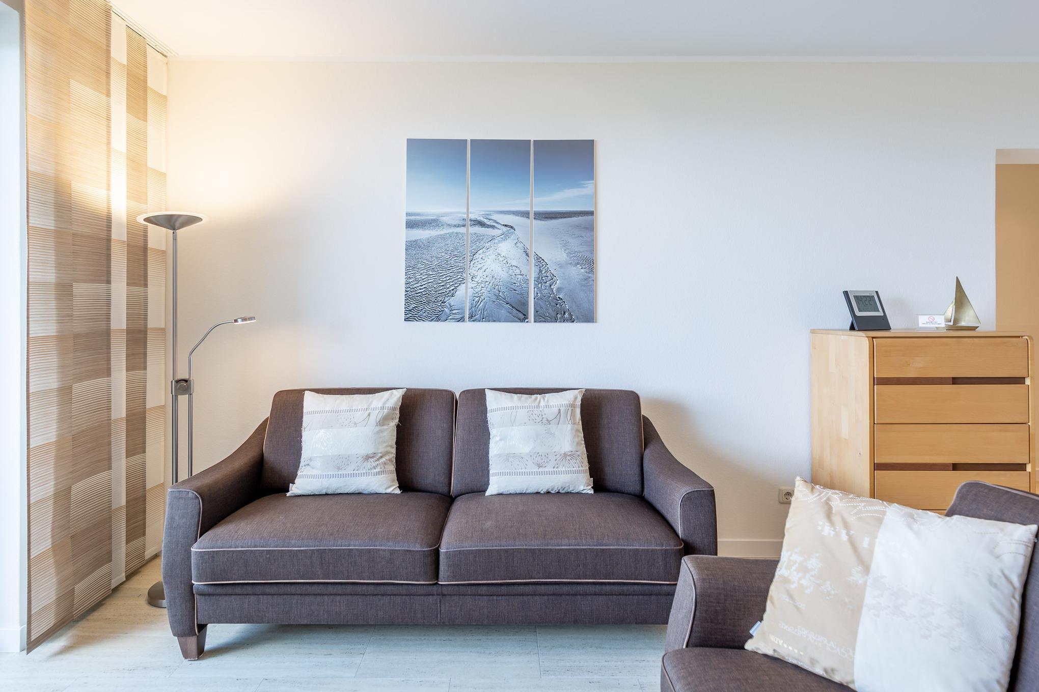 Ferienwohnung 304 im Haus Nautic liegt nur einen Steinwurf vom Deich entfernt. Nach einem erlebnisreichen Tag finden Sie in der großzügigen Ferienwohnung allen erdenklichen Komfort, um den Abend entspannt ausklingen zu lassen. Lehnen Sie sich auf der bequemen Couch zurück und genießen Sie den Ausblick auf den Weltschifffahrtsweg. Dank LCD-TV brauchen Sie auch im Urlaub nicht auf Ihre Lieblingsserie zu verzichten. Und an trüben Tagen lädt der runderneuerte Wellnessbereich mit Schwimmbad, Sauna, Regenduschen und beheizten Mosaikbänken zum Verweilen ein.
