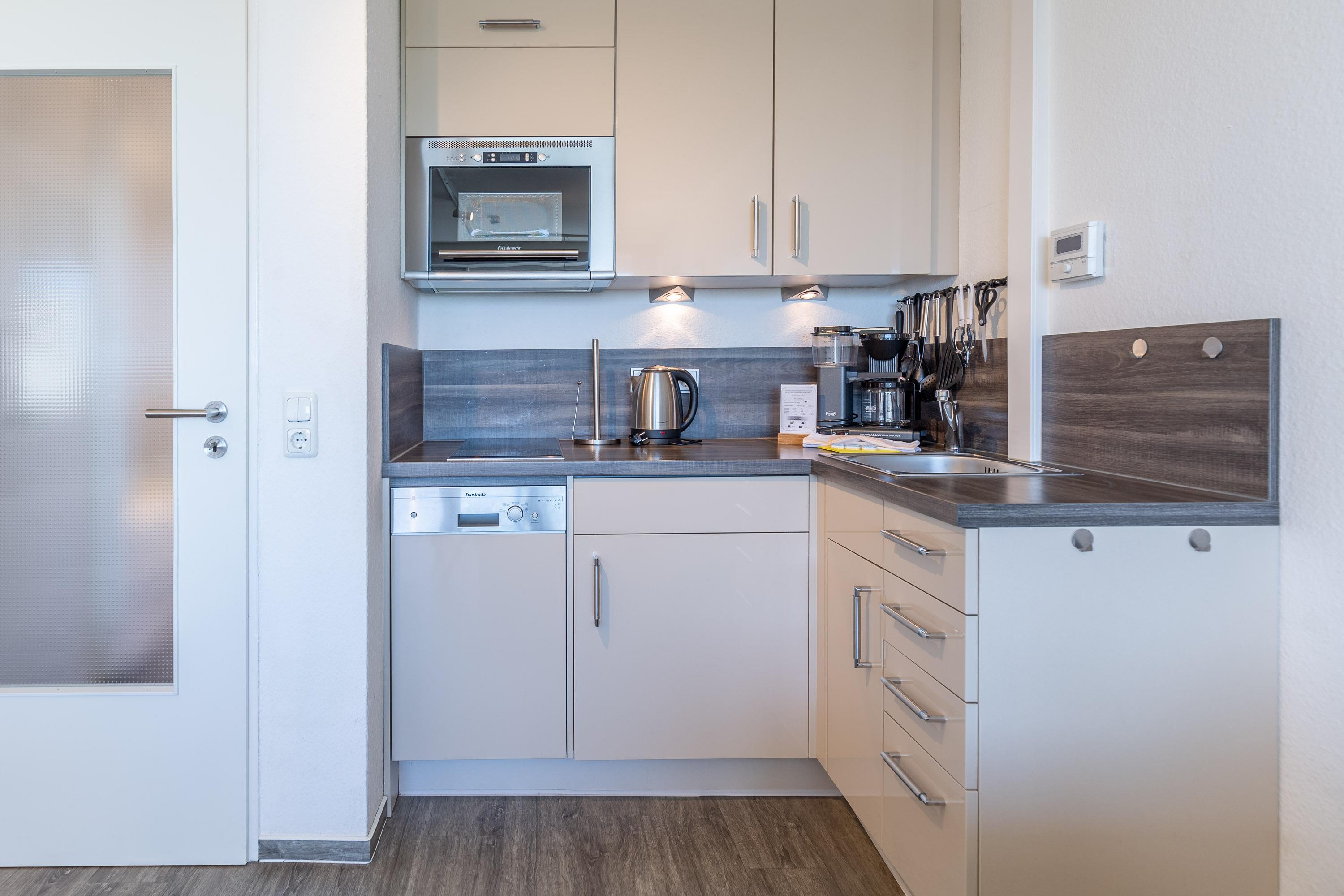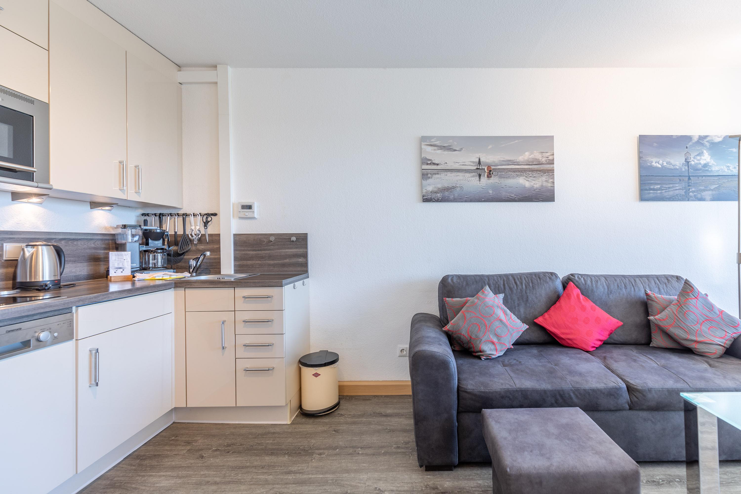 Die hochwertigen Schrankbetten im kombinierten Wohn- und Schlafbereich lassen sich getrennt nutzen. Ein Einzelbett im Vorraum ermöglicht getrenntes Schlafen. Ferienwohnung 308 ist mit elektrischen Außenjalousien ausgestattet, sodass Sie nicht von der Morgensonne geweckt werden. Ein LCD-Fernseher gewährleistet, dass Sie im Urlaub nicht auf Nachrichtensendungen sowie Ihre Lieblingsserie verzichten müssen. Darüber verfügt Ferienwohnung Nautic 308 über einen Safe in der Ihre Wertgegenstände bei Abwesenheit sicher verstaut sind.